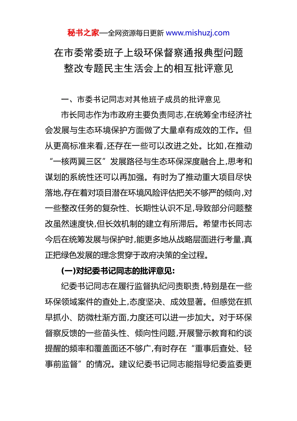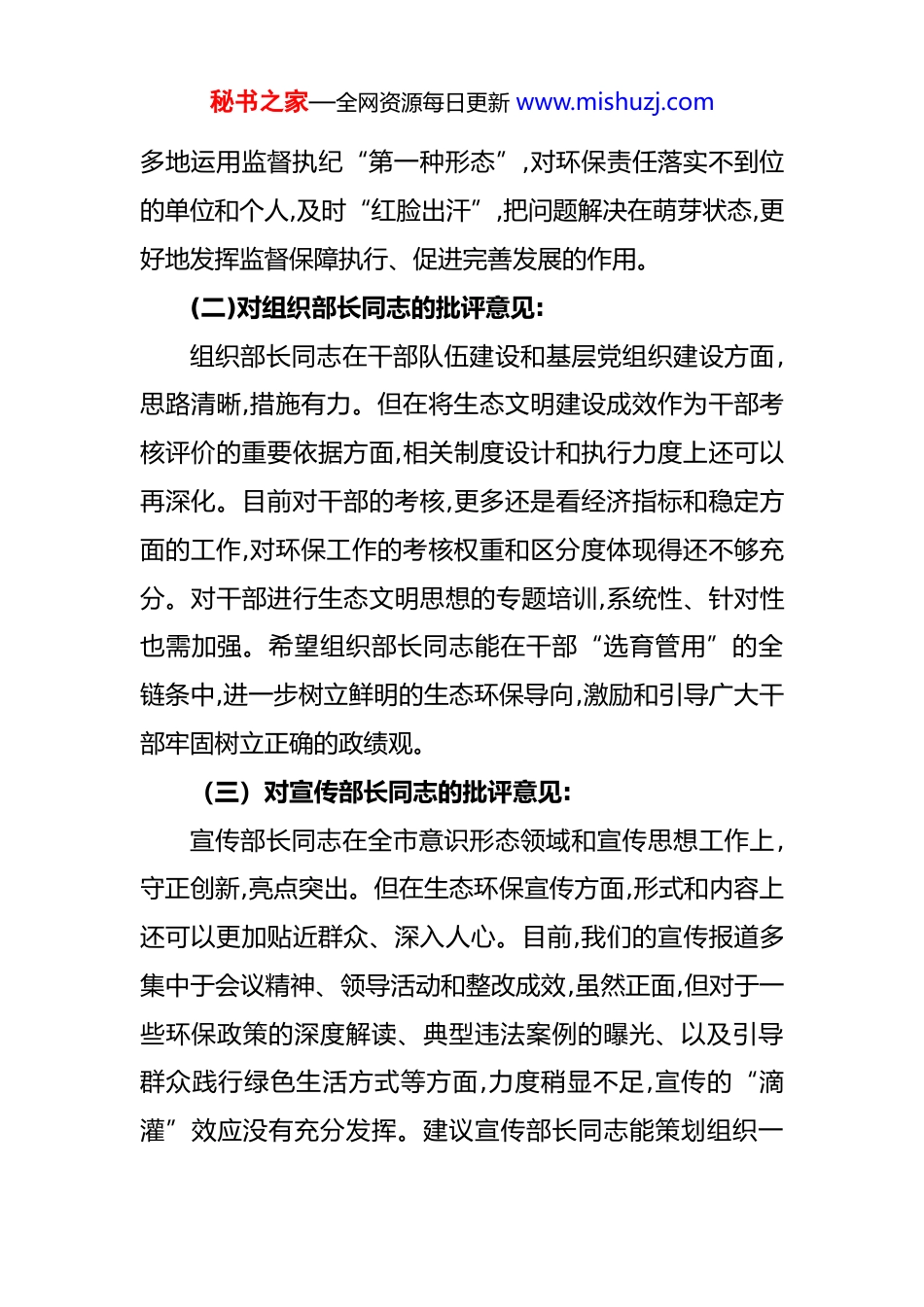 秘书之家—全网资源每日更新 www.mishuzj.com在市委常委班子上级环保督察通报典型问题整改专题民主生活会上的相互批评意见 一、市委书记同志对其他班子成员的批评意见市长同志作为市政府主要负责同志,在统筹全市经济社会发展与生态环境保护方面做了大量卓有成效的工作。但从更高标准来看,还存在一些可以改进之处。比如,在推动“一核两翼三区”发展路径与生态环保深度融合上,思考和谋划的系统性还可以再加强。有时为了推动重大项目尽快落地,存在着对项目潜在环境风险评估把关不够严的倾向,对一些整改任务的复杂性、长期性认识不足,导致部分问题整改虽然速度快,但长效机制的建立有所滞后。希望市长同志今后在统筹发展与保护时,能更多地从战略层面进行考量,真正把绿色发展的理念贯穿于政府决策的全过程。(一)对纪委书记同志的批评意见:纪委书记同志在履行监督执纪问责职责,特别是在一些环保领域案件的查处上,态度坚决、成效显著。但感觉在抓早抓小、防微杜渐方面,力度还可以进一步加大。对于环保督察反馈的一些苗头性、倾向性问题,开展警示教育和约谈提醒的频率和覆盖面还不够广,有时存在“重事后查处、轻事前监督”的情况。建议纪委书记同志能指导纪委监委更秘书之家—全网资源每日更新 www.mishuzj.com多地运用监督执纪“第一种形态”,对环保责任落实不到位的单位和个人,及时“红脸出汗”,把问题解决在萌芽状态,更好地发挥监督保障执行、促进完善发展的作用。(二)对组织部长同志的批评意见:组织部长同志在干部队伍建设和基层党组织建设方面,思路清晰,措施有力。但在将生态文明建设成效作为干部考核评价的重要依据方面,相关制度设计和执行力度上还可以再深化。目前对干部的考核,更多还是看经济指标和稳定方面的工作,对环保工作的考核权重和区分度体现得还不够充分。对干部进行生态文明思想的专题培训,系统性、针对性也需加强。希望组织部长同志能在干部“选育管用”的全链条中,进一步树立鲜明的生态环保导向,激励和引导广大干部牢固树立正确的政绩观。(三)对宣传部长同志的批评意见:宣传部长同志在全市意识形态领域和宣传思想工作上,守正创新,亮点突出。但在生态环保宣传方面,形式和内容上还可以更加贴近群众、深入人心。目前,我们的宣传报道多集中于会议精神、领导活动和整改成效,虽然正面,但对于一些环保政策的深度解读、典型违法案例的曝光、以及引导群众践行绿色生活方式等方面,力度稍显不足,宣传的“滴灌”效应没有充分发挥。建议宣传部长同志能策划组织一秘书之家—全网资源每日更新 www.mishuzj.com些更具影响力和感染力的系列宣传活动,让生态环保理念真正成为全社会的思想共识和行动自觉。(四)对政法委书记同志的批评意见:政法委书记同志在维护社会稳定、推进依法治市方面,勇于担当,成效斐然。但在运用法治手段保护生态环境方面,统筹协调的力度尚有提升空间。比如,在打击非法采砂、非法排污等破坏生态环境的违法犯罪行为上,公安、检察、法院等部门之间的联动协同机制还不够顺畅,存在线索移送、案件办理周期较长的问题。对于一些专业性强的环保案件,政法队伍的专业能力也亟待提升。希望政法委书记同志能牵头进一步完善生态环境行政执法与刑事司法衔接机制,形成打击环保违法犯罪的强大合力。(五)对常务副市长同志的批评意见:常务副市长同志在负责发展改革、财政、项目投资等关键领域,工作勤勉,贡献很大。但也正因为分管领域多是经济发展的“主战场”,有时在思想深处还或多或少存在“发展要硬、环保要软”的惯性思维。在一些项目评审和资金安排上,对项目的经济效益考虑得比较充分,但对其生态效益和长远影响的考量有时不够周全。对于分管领域涉及的环保整改任务,跟进督促的力度与对其主抓的经济工作的力度相比,还存在一定的温差。希望常务副市长同志能更好地处秘书之家—全网资源每日更新 www.mishuzj.com理好发展与保护的关系,在项目引进和资金投向上,设立更加严格的环保“门槛”。二、市长同志对其他班子成员的批评意见(一)对市委书记同志的批评意见:书记同志作为班子的“班长”,政治站位高,大局观念强,对生态环保工作高度重视。但感觉在具体工作的督导和压力传导上...