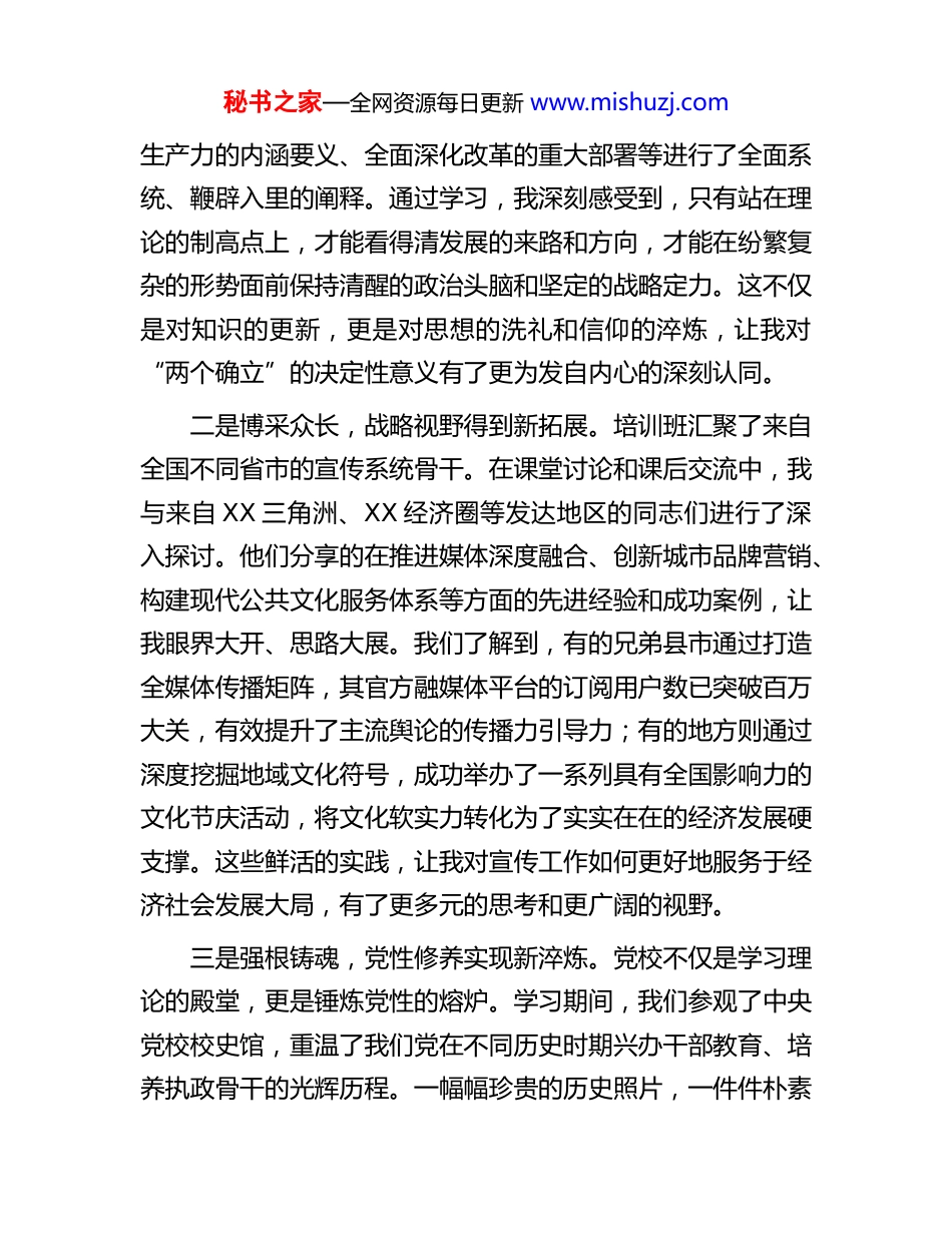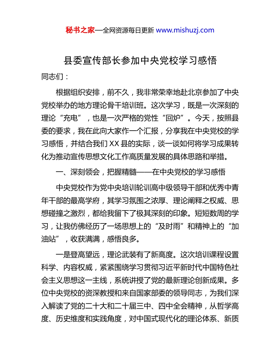秘书之家—全网资源每日更新 www.mishuzj.com县委宣传部长参加中央党校学习感悟同志们:根据组织安排,前不久,我非常荣幸地赴北京参加了中央党校举办的地方理论骨干培训班。这次学习,既是一次深刻的理论“充电”,也是一次严格的党性“回炉”。今天,按照县委的要求,我在此向大家作一个汇报,分享我在中央党校的学习感悟,并结合我们 XX 县的实际,谈一谈如何将学习成果转化为推动宣传思想文化工作高质量发展的具体思路和举措。一、深刻领会,把握精髓——在中央党校的学习感悟中央党校作为党中央培训轮训高中级领导干部和优秀中青年干部的最高学府,其学习氛围之浓厚、理论阐释之权威、思想碰撞之激烈,都给我留下了极其深刻的印象。短短数周的学习,让我仿佛经历了一场思想上的“及时雨”和精神上的“加油站”,收获满满,感悟良多。一是登高望远,理论武装有了新高度。这次培训课程设置科学、内容权威,紧紧围绕学习贯彻习近平新时代中国特色社会主义思想这一主线,系统讲授了党的最新理论创新成果。多位中央党校的资深教授和来自国家部委的领导同志,为我们深入解读了党的二十大和二十届三中、四中全会精神,从哲学高度、历史维度和实践角度,对中国式现代化的理论体系、新质秘书之家—全网资源每日更新 www.mishuzj.com生产力的内涵要义、全面深化改革的重大部署等进行了全面系统、鞭辟入里的阐释。通过学习,我深刻感受到,只有站在理论的制高点上,才能看得清发展的来路和方向,才能在纷繁复杂的形势面前保持清醒的政治头脑和坚定的战略定力。这不仅是对知识的更新,更是对思想的洗礼和信仰的淬炼,让我对“两个确立”的决定性意义有了更为发自内心的深刻认同。二是博采众长,战略视野得到新拓展。培训班汇聚了来自全国不同省市的宣传系统骨干。在课堂讨论和课后交流中,我与来自 XX 三角洲、XX 经济圈等发达地区的同志们进行了深入探讨。他们分享的在推进媒体深度融合、创新城市品牌营销、构建现代公共文化服务体系等方面的先进经验和成功案例,让我眼界大开、思路大展。我们了解到,有的兄弟县市通过打造全媒体传播矩阵,其官方融媒体平台的订阅用户数已突破百万大关,有效提升了主流舆论的传播力引导力;有的地方则通过深度挖掘地域文化符号,成功举办了一系列具有全国影响力的文化节庆活动,将文化软实力转化为了实实在在的经济发展硬支撑。这些鲜活的实践,让我对宣传工作如何更好地服务于经济社会发展大局,有了更多元的思考和更广阔的视野。三是强根铸魂,党性修养实现新淬炼。党校不仅是学习理论的殿堂,更是锤炼党性的熔炉。学习期间,我们参观了中央党校校史馆,重温了我们党在不同历史时期兴办干部教育、培养执政骨干的光辉历程。一幅幅珍贵的历史照片,一件件朴素秘书之家—全网资源每日更新 www.mishuzj.com的革命文物,无声地讲述着老一辈革命家对党的无限忠诚和对真理的不懈追求。这种身临其境的党性教育,深深触动了我的灵魂。在党性分析和组织生活会上,大家对照党章党规,结合自身思想和工作实际,坦诚地开展批评与自我批评,真正做到了“红脸出汗、排毒治病”。通过这一系列的党性锻炼,我的理想信念更加坚定,宗旨意识更加牢固,明白了作为一名党的宣传干部,不仅要“能文”,更要“姓党”,必须时刻将对党忠诚刻在心上、融入血脉。二、融会贯通,知行合一——以学习成果指导 XX 县宣传思想文化工作实践学习的最终目的在于运用。从中央党校归来,我一直在深入思考:如何将所学所思所悟,与我们 XX 县的发展实际紧密结合,转化为推动工作的强大动力?我们 XX 县正处在爬坡过坎、转型升级的关键时期,县委、县政府明确提出了奋力谱写“高品质发展、高水平安全”新篇章的宏伟目标。宣传思想文化战线作为党的一条重要战线,使命光荣,责任重大。我认为,我们必须主动作为,积极应变,在服务全县发展大局中强化“六种意识”,当好“六种角色”。一是强化“领学”意识,当好理论武装的“领头羊”。宣传部门的首要职责是理论武装。我们要把学习宣传贯彻习近平新时代中国特色社会主义思想作为重中之重,巩固拓展主题教秘书之家—全网资源每日更...