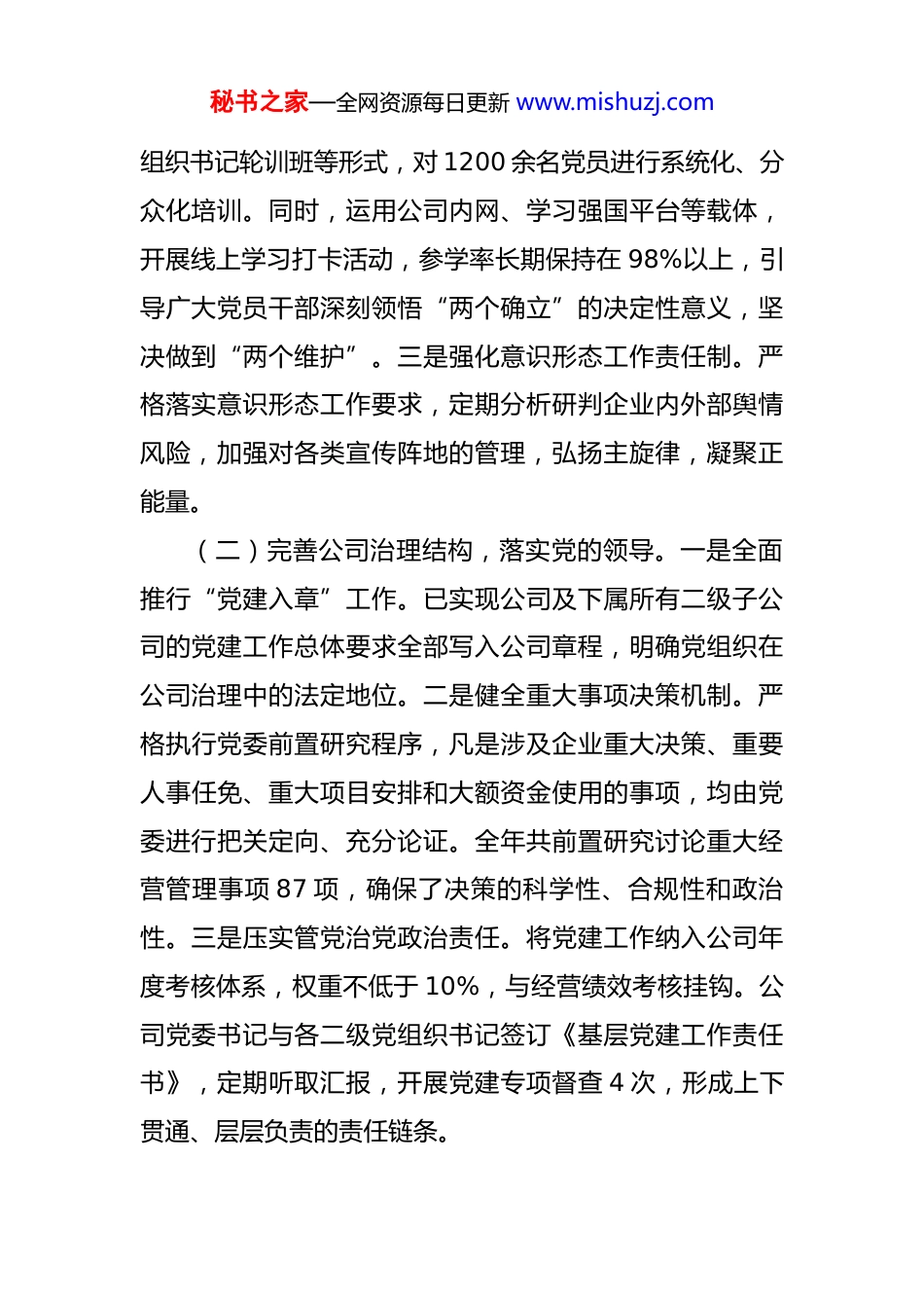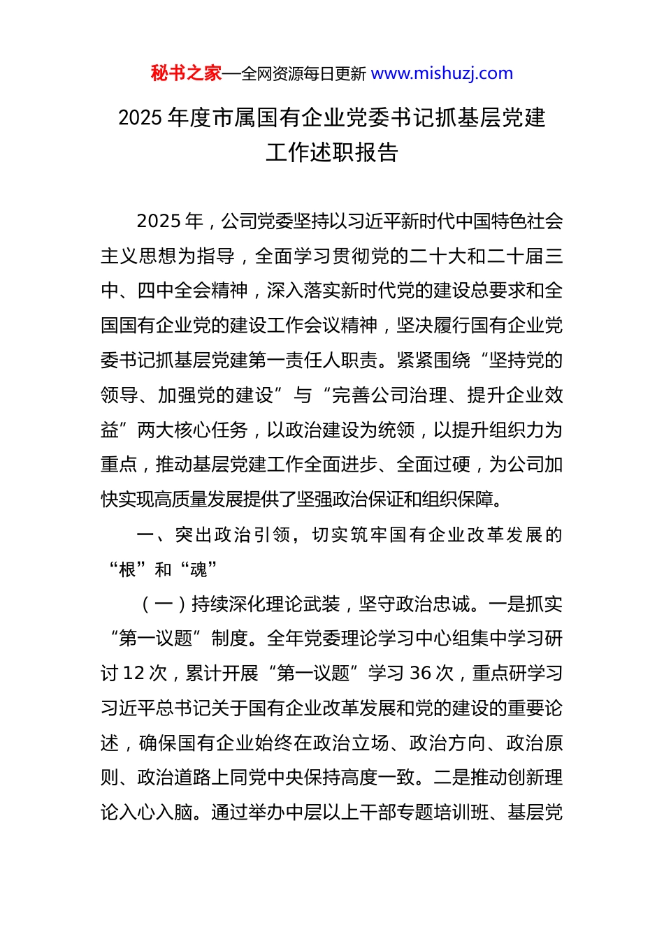 秘书之家—全网资源每日更新 www.mishuzj.com2025 年度市属国有企业党委书记抓基层党建工作述职报告 2025 年,公司党委坚持以习近平新时代中国特色社会主义思想为指导,全面学习贯彻党的二十大和二十届三中、四中全会精神,深入落实新时代党的建设总要求和全国国有企业党的建设工作会议精神,坚决履行国有企业党委书记抓基层党建第一责任人职责。紧紧围绕“坚持党的领导、加强党的建设”与“完善公司治理、提升企业效益”两大核心任务,以政治建设为统领,以提升组织力为重点,推动基层党建工作全面进步、全面过硬,为公司加快实现高质量发展提供了坚强政治保证和组织保障。一、突出政治引领,切实筑牢国有企业改革发展的“根”和“魂”(一)持续深化理论武装,坚守政治忠诚。一是抓实“第一议题”制度。全年党委理论学习中心组集中学习研讨 12 次,累计开展“第一议题”学习 36 次,重点研学习习近平总书记关于国有企业改革发展和党的建设的重要论述,确保国有企业始终在政治立场、政治方向、政治原则、政治道路上同党中央保持高度一致。二是推动创新理论入心入脑。通过举办中层以上干部专题培训班、基层党秘书之家—全网资源每日更新 www.mishuzj.com组织书记轮训班等形式,对 1200 余名党员进行系统化、分众化培训。同时,运用公司内网、学习强国平台等载体,开展线上学习打卡活动,参学率长期保持在 98%以上,引导广大党员干部深刻领悟“两个确立”的决定性意义,坚决做到“两个维护”。三是强化意识形态工作责任制。严格落实意识形态工作要求,定期分析研判企业内外部舆情风险,加强对各类宣传阵地的管理,弘扬主旋律,凝聚正能量。(二)完善公司治理结构,落实党的领导。一是全面推行“党建入章”工作。已实现公司及下属所有二级子公司的党建工作总体要求全部写入公司章程,明确党组织在公司治理中的法定地位。二是健全重大事项决策机制。严格执行党委前置研究程序,凡是涉及企业重大决策、重要人事任免、重大项目安排和大额资金使用的事项,均由党委进行把关定向、充分论证。全年共前置研究讨论重大经营管理事项 87 项,确保了决策的科学性、合规性和政治性。三是压实管党治党政治责任。将党建工作纳入公司年度考核体系,权重不低于 10%,与经营绩效考核挂钩。公司党委书记与各二级党组织书记签订《基层党建工作责任书》,定期听取汇报,开展党建专项督查 4 次,形成上下贯通、层层负责的责任链条。秘书之家—全网资源每日更新 www.mishuzj.com二、聚焦发展大局,以高质量党建引领生产经营提质增效(一)驱动核心业务发展。一是党建引领重大项目攻坚。在重点基础设施建设、技术研发、市场拓展等关键领域成立“党员突击队”15 个、“党员先锋岗”86 个。例如,在某省级重点工程项目建设中,项目临时党支部设立了“质量监督岗”和“安全保障岗”,由党员骨干担任,有效破解了复杂地质条件下的施工难题,项目提前 15 天完成节点目标,并获得市级“安全文明工地”称号。二是深化技术创新中的党建引领。以党组织为单位,组织专业技术人员成立“党员创新工作室”7 个,激励党员在核心技术领域攻坚克难。全年共申报专利技术 23 项,其中由党员骨干主持研发的某项自动化控制系统,成功应用于生产线,预计年节约成本超过 500 万元,实现了党建与创新同频共振。(二)培育高素质干部人才队伍。一是突出政治标准选人用人。坚持好干部标准,注重在重大任务、关键岗位上考察识别干部。全年提拔重用和交流任职的中层以上干部中,注重选拔具有政治判断力、执行力和专业能力的优秀人才。二是从严从实抓好干部管理。建立完善年轻干部储备库和跟踪培养机制,选拔 30 名优秀年轻干部到基层一秘书之家—全网资源每日更新 www.mishuzj.com线和重要业务部门进行轮岗锻炼。实施“青蓝计划”,为新入职的青年员工和技术骨干指定党员导师,实现“思想政治导师+业务技能导师”双轨带教模式,促进人才快速成长。三是加强专业能力建设。紧密围绕公司产业布局和市场需求,组织开展专业技能培训 25 期,内容涵盖数字化转型、精益管理、风险控制等,培训覆盖率达 95%以...