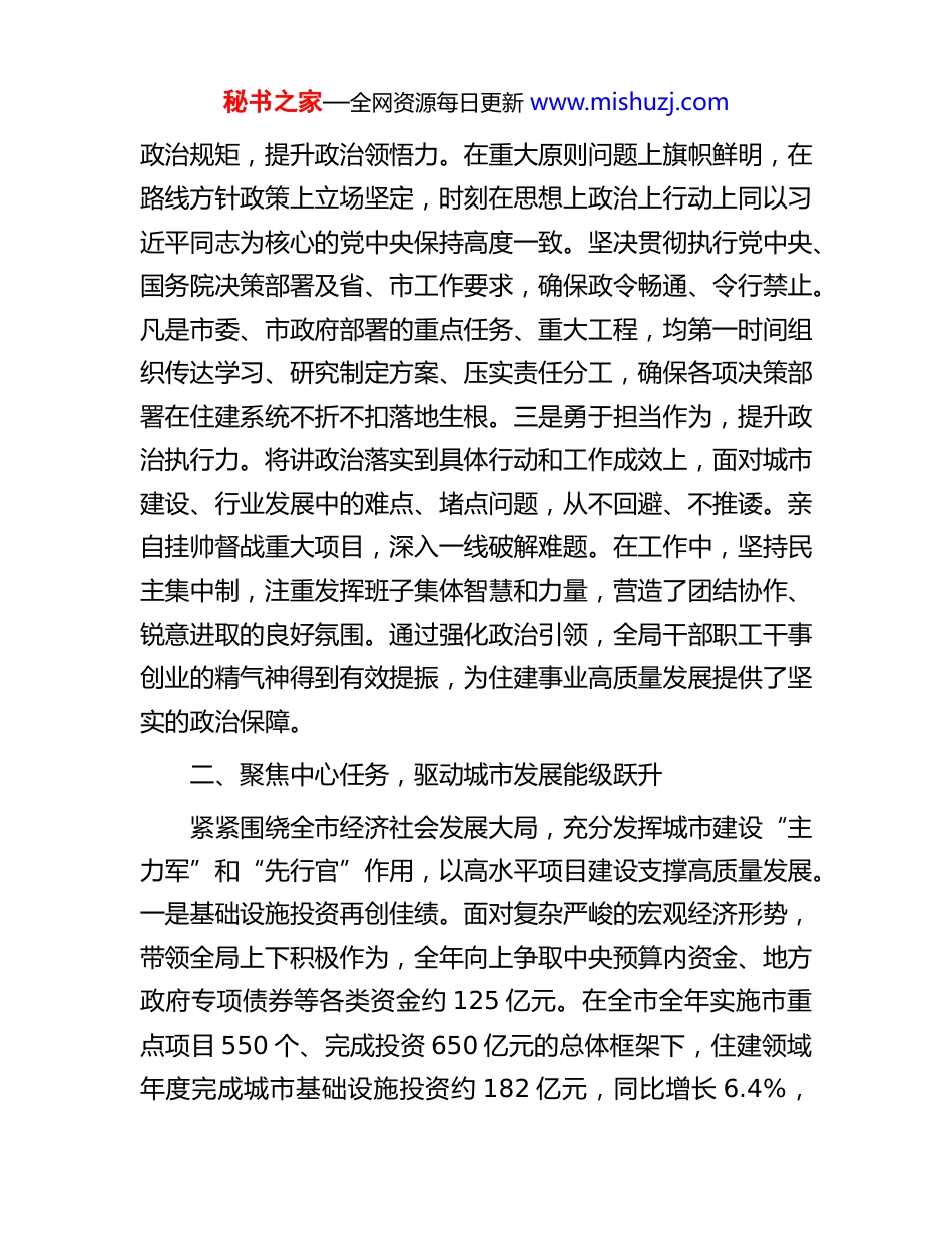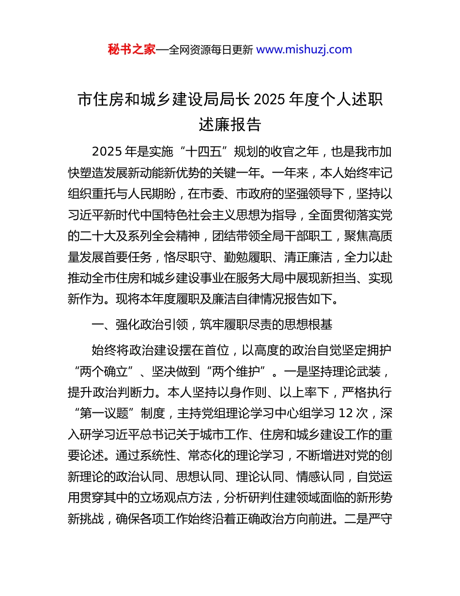 秘书之家—全网资源每日更新 www.mishuzj.com市住房和城乡建设局局长 2025 年度个人述职述廉报告2025 年是实施“十四五”规划的收官之年,也是我市加快塑造发展新动能新优势的关键一年。一年来,本人始终牢记组织重托与人民期盼,在市委、市政府的坚强领导下,坚持以习近平新时代中国特色社会主义思想为指导,全面贯彻落实党的二十大及系列全会精神,团结带领全局干部职工,聚焦高质量发展首要任务,恪尽职守、勤勉履职、清正廉洁,全力以赴推动全市住房和城乡建设事业在服务大局中展现新担当、实现新作为。现将本年度履职及廉洁自律情况报告如下。一、强化政治引领,筑牢履职尽责的思想根基始终将政治建设摆在首位,以高度的政治自觉坚定拥护“两个确立”、坚决做到“两个维护”。一是坚持理论武装,提升政治判断力。本人坚持以身作则、以上率下,严格执行“第一议题”制度,主持党组理论学习中心组学习 12 次,深入研学习近平总书记关于城市工作、住房和城乡建设工作的重要论述。通过系统性、常态化的理论学习,不断增进对党的创新理论的政治认同、思想认同、理论认同、情感认同,自觉运用贯穿其中的立场观点方法,分析研判住建领域面临的新形势新挑战,确保各项工作始终沿着正确政治方向前进。二是严守秘书之家—全网资源每日更新 www.mishuzj.com政治规矩,提升政治领悟力。在重大原则问题上旗帜鲜明,在路线方针政策上立场坚定,时刻在思想上政治上行动上同以习近平同志为核心的党中央保持高度一致。坚决贯彻执行党中央、国务院决策部署及省、市工作要求,确保政令畅通、令行禁止。凡是市委、市政府部署的重点任务、重大工程,均第一时间组织传达学习、研究制定方案、压实责任分工,确保各项决策部署在住建系统不折不扣落地生根。三是勇于担当作为,提升政治执行力。将讲政治落实到具体行动和工作成效上,面对城市建设、行业发展中的难点、堵点问题,从不回避、不推诿。亲自挂帅督战重大项目,深入一线破解难题。在工作中,坚持民主集中制,注重发挥班子集体智慧和力量,营造了团结协作、锐意进取的良好氛围。通过强化政治引领,全局干部职工干事创业的精气神得到有效提振,为住建事业高质量发展提供了坚实的政治保障。二、聚焦中心任务,驱动城市发展能级跃升紧紧围绕全市经济社会发展大局,充分发挥城市建设“主力军”和“先行官”作用,以高水平项目建设支撑高质量发展。一是基础设施投资再创佳绩。面对复杂严峻的宏观经济形势,带领全局上下积极作为,全年向上争取中央预算内资金、地方政府专项债券等各类资金约 125 亿元。在全市全年实施市重点项目 550 个、完成投资 650 亿元的总体框架下,住建领域年度完成城市基础设施投资约 182 亿元,同比增长 6.4%,秘书之家—全网资源每日更新 www.mishuzj.com为全市固定资产投资增长提供了有力支撑。二是重大项目建设实现新突破。以增强城市承载力和辐射功能为目标,全力推进一批关键性、引领性重大工程。年内,共组织实施路桥工程62 项,其中**中环路高架桥、**大道快速化改造等 41 项重点工程顺利竣工通车,进一步完善了城市骨干路网结构。特别是作为我市智能建造试点标志性工程之一的**冰雪体育示范区项目主体完工,为我市打造冰雪经济高地增添了新地标。三是城市功能品质持续完善。坚持系统观念,统筹推进城市生命线工程建设。完成**第三净水厂深度处理改造,城市供水品质显著提升。新建及改造供水、排水、燃气、供热等各类市政管网超过 1600 公里,新增污水日处理能力 22 万吨,新增集中供热能力 800 万平方米,主城区供热热源基本实现联网调峰运行,城市运行保障能力迈上新台阶。深入推进城市内涝治理,完成**路、**街等 5 处历史易涝点整治,城市安全韧性得到进一步增强。持续巩固黑臭水体治理成效,加强对**河等重点水体的动态监测与长效管护,确保水质稳定达标,城市生态基底更加坚实。三、践行人民至上,构筑宜居幸福的美好家园始终将人民对美好生活的向往作为奋斗目标,用心用情用力解决群众急难愁盼问题,不断增强人民群众的获得感、幸福感、安全感。一是安居保障网织密扎牢。聚焦住有...