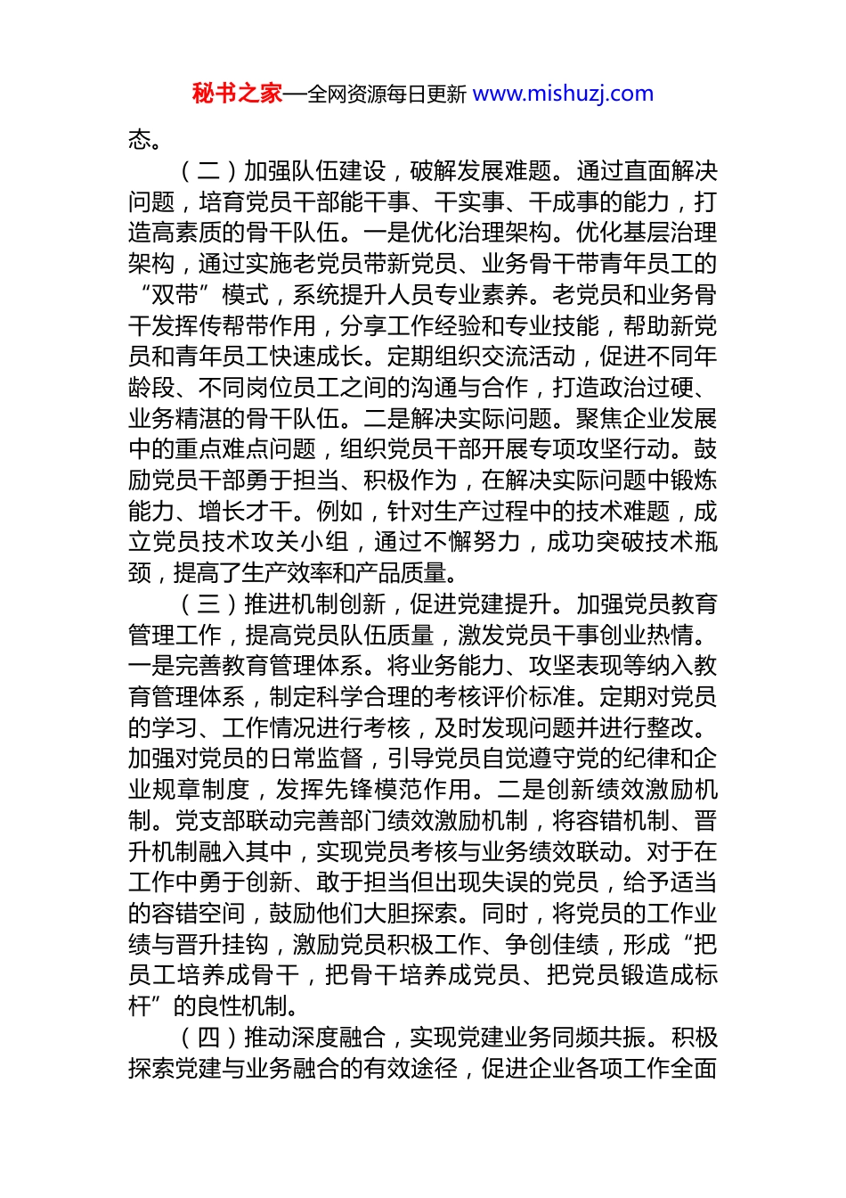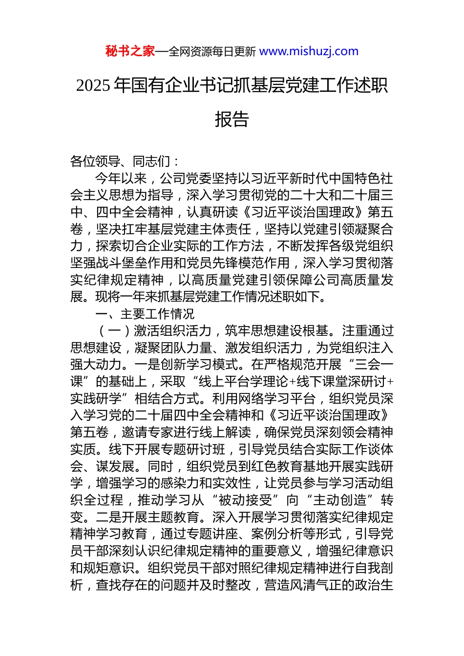 秘书之家—全网资源每日更新 www.mishuzj.com2025 年国有企业书记抓基层党建工作述职报告各位领导、同志们:今年以来,公司党委坚持以习近平新时代中国特色社会主义思想为指导,深入学习贯彻党的二十大和二十届三中、四中全会精神,认真研读《习近平谈治国理政》第五卷,坚决扛牢基层党建主体责任,坚持以党建引领凝聚合力,探索切合企业实际的工作方法,不断发挥各级党组织坚强战斗堡垒作用和党员先锋模范作用,深入学习贯彻落实纪律规定精神,以高质量党建引领保障公司高质量发展。现将一年来抓基层党建工作情况述职如下。一、主要工作情况(一)激活组织活力,筑牢思想建设根基。注重通过思想建设,凝聚团队力量、激发组织活力,为党组织注入强大动力。一是创新学习模式。在严格规范开展“三会一课”的基础上,采取“线上平台学理论+线下课堂深研讨+实践研学”相结合方式。利用网络学习平台,组织党员深入学习党的二十届四中全会精神和《习近平谈治国理政》第五卷,邀请专家进行线上解读,确保党员深刻领会精神实质。线下开展专题研讨班,引导党员结合实际工作谈体会、谋发展。同时,组织党员到红色教育基地开展实践研学,增强学习的感染力和实效性,让党员参与学习活动组织全过程,推动学习从“被动接受”向“主动创造”转变。二是开展主题教育。深入开展学习贯彻落实纪律规定精神学习教育,通过专题讲座、案例分析等形式,引导党员干部深刻认识纪律规定精神的重要意义,增强纪律意识和规矩意识。组织党员干部对照纪律规定精神进行自我剖析,查找存在的问题并及时整改,营造风清气正的政治生秘书之家—全网资源每日更新 www.mishuzj.com态。 (二)加强队伍建设,破解发展难题。通过直面解决问题,培育党员干部能干事、干实事、干成事的能力,打造高素质的骨干队伍。一是优化治理架构。优化基层治理架构,通过实施老党员带新党员、业务骨干带青年员工的“双带”模式,系统提升人员专业素养。老党员和业务骨干发挥传帮带作用,分享工作经验和专业技能,帮助新党员和青年员工快速成长。定期组织交流活动,促进不同年龄段、不同岗位员工之间的沟通与合作,打造政治过硬、业务精湛的骨干队伍。二是解决实际问题。聚焦企业发展中的重点难点问题,组织党员干部开展专项攻坚行动。鼓励党员干部勇于担当、积极作为,在解决实际问题中锻炼能力、增长才干。例如,针对生产过程中的技术难题,成立党员技术攻关小组,通过不懈努力,成功突破技术瓶颈,提高了生产效率和产品质量。(三)推进机制创新,促进党建提升。加强党员教育管理工作,提高党员队伍质量,激发党员干事创业热情。一是完善教育管理体系。将业务能力、攻坚表现等纳入教育管理体系,制定科学合理的考核评价标准。定期对党员的学习、工作情况进行考核,及时发现问题并进行整改。加强对党员的日常监督,引导党员自觉遵守党的纪律和企业规章制度,发挥先锋模范作用。二是创新绩效激励机制。党支部联动完善部门绩效激励机制,将容错机制、晋升机制融入其中,实现党员考核与业务绩效联动。对于在工作中勇于创新、敢于担当但出现失误的党员,给予适当的容错空间,鼓励他们大胆探索。同时,将党员的工作业绩与晋升挂钩,激励党员积极工作、争创佳绩,形成“把员工培养成骨干,把骨干培养成党员、把党员锻造成标杆”的良性机制。(四)推动深度融合,实现党建业务同频共振。积极探索党建与业务融合的有效途径,促进企业各项工作全面秘书之家—全网资源每日更新 www.mishuzj.com发展。一是创新党建模式。强化党建引领,创新“党建+互联网”模式,搭建智慧党建平台。设置线上课堂、业务联动、支部信箱等功能模块,为党员提供便捷的学习和交流渠道。线上课堂定期推送党的理论知识、业务培训课程等内容,方便党员随时随地学习。业务联动模块促进各部门之间的沟通与协作,提高工作效率。支部信箱为党员提供了反映问题和建议的平台,增强了党员的参与感和归属感,破解一线党员集中学习难、参与管理难的问题,推动党建工作从“线下单一型”向“线上线下融合”转型,以党的建设引领企业各项工作。二是推动深度融合。主动将党建融入业务...