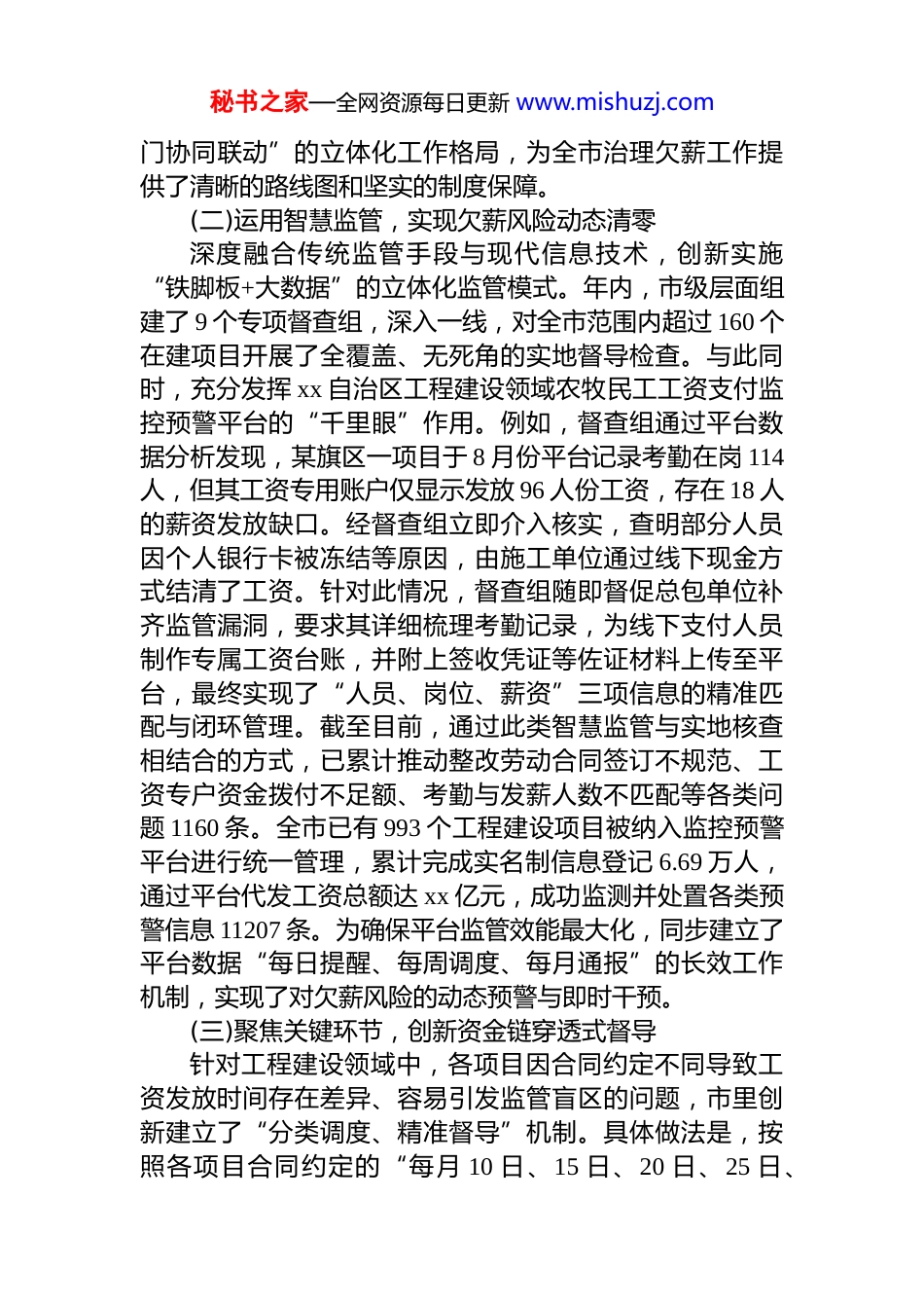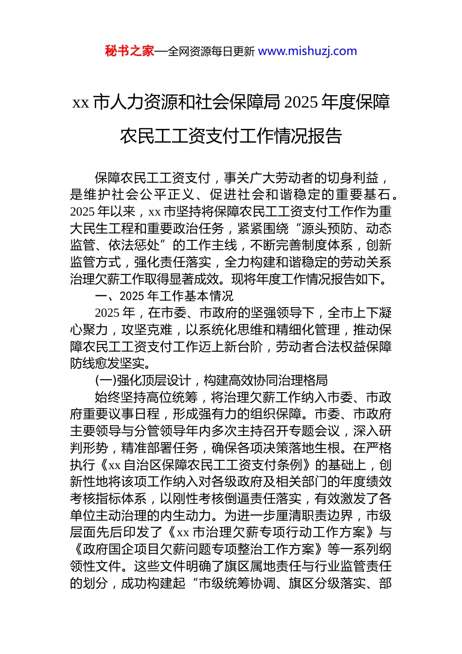 秘书之家—全网资源每日更新 www.mishuzj.comxx 市人力资源和社会保障局 2025 年度保障农民工工资支付工作情况报告保障农民工工资支付,事关广大劳动者的切身利益,是维护社会公平正义、促进社会和谐稳定的重要基石 。2025 年以来,xx 市坚持将保障农民工工资支付工作作为重大民生工程和重要政治任务,紧紧围绕“源头预防、动态监管、依法惩处”的工作主线,不断完善制度体系,创新监管方式,强化责任落实,全力构建和谐稳定的劳动关系治理欠薪工作取得显著成效。现将年度工作情况报告如下。一、2025 年工作基本情况2025 年,在市委、市政府的坚强领导下,全市上下凝心聚力,攻坚克难,以系统化思维和精细化管理,推动保障农民工工资支付工作迈上新台阶,劳动者合法权益保障防线愈发坚实。(一)强化顶层设计,构建高效协同治理格局始终坚持高位统筹,将治理欠薪工作纳入市委、市政府重要议事日程,形成强有力的组织保障。市委、市政府主要领导与分管领导年内多次主持召开专题会议,深入研判形势,精准部署任务,确保各项决策落地生根。在严格执行《xx 自治区保障农民工工资支付条例》的基础上,创新性地将该项工作纳入对各级政府及相关部门的年度绩效考核指标体系,以刚性考核倒逼责任落实,有效激发了各单位主动治理的内生动力。为进一步厘清职责边界,市级层面先后印发了《xx 市治理欠薪专项行动工作方案》与《政府国企项目欠薪问题专项整治工作方案》等一系列纲领性文件。这些文件明确了旗区属地责任与行业监管责任的划分,成功构建起“市级统筹协调、旗区分级落实、部秘书之家—全网资源每日更新 www.mishuzj.com门协同联动”的立体化工作格局,为全市治理欠薪工作提供了清晰的路线图和坚实的制度保障。(二)运用智慧监管,实现欠薪风险动态清零深度融合传统监管手段与现代信息技术,创新实施“铁脚板+大数据”的立体化监管模式。年内,市级层面组建了 9 个专项督查组,深入一线,对全市范围内超过 160 个在建项目开展了全覆盖、无死角的实地督导检查。与此同时,充分发挥 xx 自治区工程建设领域农牧民工工资支付监控预警平台的“千里眼”作用。例如,督查组通过平台数据分析发现,某旗区一项目于 8 月份平台记录考勤在岗 114人,但其工资专用账户仅显示发放 96 人份工资,存在 18 人的薪资发放缺口。经督查组立即介入核实,查明部分人员因个人银行卡被冻结等原因,由施工单位通过线下现金方式结清了工资。针对此情况,督查组随即督促总包单位补齐监管漏洞,要求其详细梳理考勤记录,为线下支付人员制作专属工资台账,并附上签收凭证等佐证材料上传至平台,最终实现了“人员、岗位、薪资”三项信息的精准匹配与闭环管理。截至目前,通过此类智慧监管与实地核查相结合的方式,已累计推动整改劳动合同签订不规范、工资专户资金拨付不足额、考勤与发薪人数不匹配等各类问题 1160 条。全市已有 993 个工程建设项目被纳入监控预警平台进行统一管理,累计完成实名制信息登记 6.69 万人,通过平台代发工资总额达 xx 亿元,成功监测并处置各类预警信息 11207 条。为确保平台监管效能最大化,同步建立了平台数据“每日提醒、每周调度、每月通报”的长效工作机制,实现了对欠薪风险的动态预警与即时干预。(三)聚焦关键环节,创新资金链穿透式督导针对工程建设领域中,各项目因合同约定不同导致工资发放时间存在差异、容易引发监管盲区的问题,市里创新建立了“分类调度、精准督导”机制。具体做法是,按照各项目合同约定的“每月 10 日、15 日、20 日、25 日、秘书之家—全网资源每日更新 www.mishuzj.com30 日前发放工资”等不同节点,分别建立督导台账,实施分类管理、挂图作战。同时,紧盯政府投资和国有企业投资项目这一关键领域,有效运用“四函一单”工作法,强力督促建设单位严格按照施工合同约定,按时、足额向农民工工资专用账户拨付人工费用,从资金源头消除欠薪隐患。今年 7 月,监控平台预警显示,xx 工程建设一期项目未能在合同约定的 15 日前完成当月工资发放。经核实,原因为建设单位人工费用拨付延迟。市治欠办立即启动“...