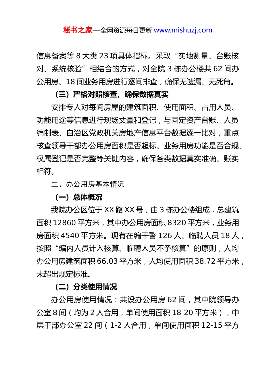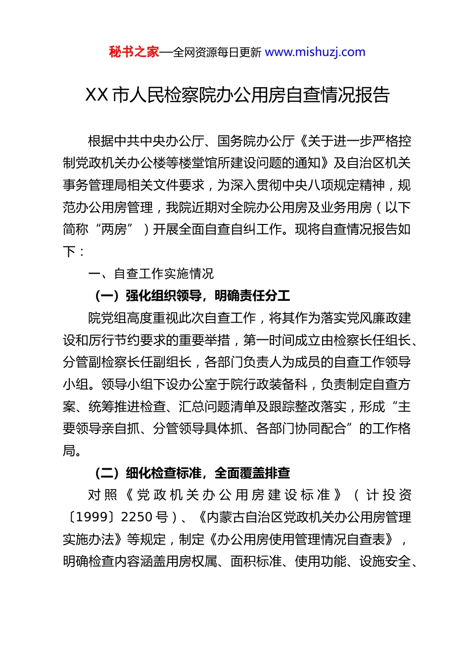 秘书之家—全网资源每日更新 www.mishuzj.comXX 市人民检察院办公用房自查情况报告根据中共中央办公厅、国务院办公厅《关于进一步严格控制党政机关办公楼等楼堂馆所建设问题的通知》及自治区机关事务管理局相关文件要求,为深入贯彻中央八项规定精神,规范办公用房管理,我院近期对全院办公用房及业务用房(以下简称“两房”)开展全面自查自纠工作。现将自查情况报告如下:一、自查工作实施情况(一)强化组织领导,明确责任分工院党组高度重视此次自查工作,将其作为落实党风廉政建设和厉行节约要求的重要举措,第一时间成立由检察长任组长、分管副检察长任副组长,各部门负责人为成员的自查工作领导小组。领导小组下设办公室于院行政装备科,负责制定自查方案、统筹推进检查、汇总问题清单及跟踪整改落实,形成“主要领导亲自抓、分管领导具体抓、各部门协同配合”的工作格局。(二)细化检查标准,全面覆盖排查对 照 《 党 政 机 关 办 公 用 房 建 设 标 准 》 ( 计 投 资〔1999〕2250 号)、《内蒙古自治区党政机关办公用房管理实施办法》等规定,制定《办公用房使用管理情况自查表》,明确检查内容涵盖用房权属、面积标准、使用功能、设施安全、秘书之家—全网资源每日更新 www.mishuzj.com信息备案等 8 大类 23 项具体指标。采取“实地测量、台账核对、系统核验”相结合的方式,对全院 3 栋办公楼共 62 间办公用房、18 间业务用房进行逐间排查,确保无遗漏、无死角。(三)严格对照核查,确保数据真实安排专人对每间房屋的建筑面积、使用面积、占用人员、功能用途等信息进行现场丈量和登记,与固定资产台账、人员编制表、自治区党政机关房地产信息平台数据逐一比对,重点核查领导干部办公用房面积是否超标、业务用房功能是否合规、权属登记是否完整等关键内容,确保各类数据真实准确、账实相符。二、办公用房基本情况(一)总体概况我院办公区位于 XX 路 XX 号,由 3 栋办公楼组成,总建筑面积 12860 平方米,其中办公用房面积 8320 平方米,业务用房面积 4540 平方米。现有在编干警 126 人、临聘人员 18 人,按照“编内人员计入核算、临聘人员不予核算”的原则,人均办公用房建筑面积 66.03 平方米,人均使用面积 38.72 平方米,未超出规定标准。(二)分类使用情况办公用房使用情况:共设办公用房 62 间,其中院领导办公室 8 间(均为 2 人合用,单间使用面积 18-20 平方米),中层干部办公室 22 间(1-2 人合用,单间使用面积 12-15 平方秘书之家—全网资源每日更新 www.mishuzj.com米),普通干警办公室 32 间(3-4 人合用,单间使用面积 20-25 平方米),均符合职级对应面积标准,无超标配备情况。业务用房使用情况:涵盖讯问室 6 间、询问室 4 间、案管大厅 1 间、听证室 2 间、档案室 3 间、保密室 1 间、纪检监察谈话室 2 间,均按检察业务规范建设,设备齐全、功能完好,其中数字检察办公室及案管大厅经前期改造后,使用合规性进一步提升。公共用房使用情况:设会议室 4 间、接待室 2 间、党员活动室 1 间、阅览室 1 间,总面积 860 平方米,主要用于会议召开、群众接待及队伍建设,使用规范且未设置豪华装修或不必要设施。(三)权属及管理情况办公用房权属为国有资产,已全部办理产权登记,无权属争议。房屋大修、维护由院行政装备科统一负责,2024 年以来累计开展水电暖线路检修 3 次、消防设施维护 2 次。房产信息已于 2024 年录入自治区党政机关房地产信息平台,2025年 9 月完成最新数据更新,无漏报、错报问题。三、存在的主要问题(一)部分用房闲置未充分利用因近年人员调整及机构优化,3 间原中层干部办公室(总面积 45 平方米)、2 间离退休干部活动室(总面积 60 平方米)长期闲置,未及时统筹调剂,造成资源浪费。秘书之家—全网资源每日更新 www.mishuzj.com(二)设施维护存在薄弱环节经排查,1 栋办公楼 3 层走廊照明线路老化导致频繁跳闸,2 间讯问室隔音棉局部脱落,4 间办公室消防灭火器压力不足,部分区域疏散指示标...