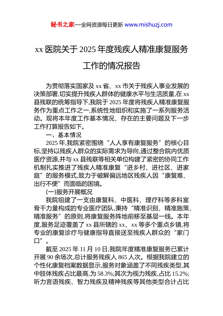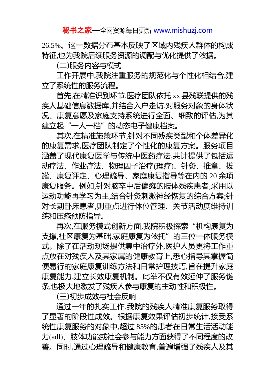 秘书之家—全网资源每日更新 www.mishuzj.comxx 医院关于 2025 年度残疾人精准康复服务工作的情况报告为贯彻落实国家及 xx 省、xx 市关于残疾人事业发展的决策部署,切实提升残疾人群体的健康水平与生活质量,在 xx县残联的统筹指导下,我院于 2025 年度将残疾人精准康复服务作为重点工作之一,系统性地组织和实施了一系列服务活动。现将本年度工作基本情况、存在的主要问题及下一步工作打算报告如下。一、基本情况2025 年,我院紧密围绕“人人享有康复服务”的核心目标,坚持以残疾人群众的实际需求为导向,通过整合院内优质医疗资源,并与 xx 县残联等相关单位构建了紧密的协同工作机制扎实推进了残疾人精准康复“进乡村、进社区、进家庭”的服务模式,致力于破解偏远地区残疾人因“康复难、出行不便”而面临的困境。(一)服务开展概况我院组建了一支由康复科、中医科、理疗科等多科室骨干力量构成的专业医疗团队,秉持“精准识别、精准施策、精准服务”的原则,将康复服务阵地前移至基层一线。本年度,服务足迹覆盖了 xx 县所辖的 xx、xx 等多个重点乡镇,将专业的康复诊疗与健康指导直接送至残疾人群众的“家门口”。截至 2025 年 11 月 10 日,我院年度精准康复服务已累计开展 90 余场次,总计服务残疾人 865 人次。根据我院建立的个性化康复档案数据显示,服务对象涵盖了不同残疾类型,其中肢体残疾占比最高,为 58.3%;其次为视力残疾,占比 15.2%;听力言语残疾、智力残疾及精神残疾等其他类型合计占比秘书之家—全网资源每日更新 www.mishuzj.com26.5%。这一数据分布基本反映了区域内残疾人群体的构成特征,也为我院后续服务资源的调配与优化提供了依据。(二)服务内容与模式工作开展中,我院注重服务的规范化与个性化相结合,建立了系统性的服务流程。首先,在精准识别环节,医疗团队依托 xx 县残联提供的残疾人基础信息数据库,并结合入户走访,对服务对象的身体状况、康复意愿及家庭支持系统进行全面、细致的评估,为其建立起“一人一档”的动态电子健康档案。其次,在精准施策环节,针对不同残疾类型和个体差异化的康复需求,医疗团队制定了个性化的康复方案。服务项目涵盖了现代康复医学与传统中医药疗法,共计提供了包括运动疗法、作业疗法、物理因子治疗(理疗)、针灸、推拿、拔罐、康复评定、心理疏导、家庭康复指导等在内的 20 余项康复服务。例如,针对脑卒中后偏瘫的肢体残疾患者,采用以运动功能再学习为主,结合针灸刺激神经恢复的综合方案;针对长期卧床患者,则重点进行体位管理、关节活动度维持训练和压疮预防指导。再次,在服务模式创新方面,我院积极探索“机构康复为支撑,社区康复为基础,家庭康复为依托”的三位一体服务模式。除了在活动现场提供集中治疗外,医护人员更将工作重点放在对残疾人及其家属的健康教育上,悉心指导其掌握简便易行的家庭康复训练方法和日常护理技巧,旨在提升家庭康复能力,建立长效康复机制。此举不仅有效延伸了服务链条,也极大地激发了残疾人参与康复的主动性和积极性。(三)初步成效与社会反响通过一年的扎实工作,我院的残疾人精准康复服务取得了显著的阶段性成效。根据康复效果评估初步统计,接受系统性康复服务的对象中,超过 85%的患者在日常生活活动能力(adl)、肢体功能或社会参与能力方面获得了不同程度的改善。同时,通过心理疏导和健康教育,普遍增强了残疾人及其秘书之家—全网资源每日更新 www.mishuzj.com家庭战胜困难、融入社会的信心。这项工作有效提升了区域内残疾人基本康复服务的覆盖率,基本符合国家到 2025 年残疾人基本康复服务覆盖率达到 85%以上的宏观政策目标。服务活动受到了基层干部群众的广泛认可与一致好评,多家地方媒体对我院的活动进行了报道,产生了良好的社会效应,也为我院树立了勇于承担社会责任的良好形象。在 xx 县残联组织的年度绩效评估中,我院的服务质量和群众满意度均位居前列。二、存在问题在肯定成绩的同时,必须清醒地认识到,对标残疾人事业高质量发展要求和广大残疾人群众日益增长的、多元化的康复需求,我院在推进精准康复服务工作中仍面临一系列深层次的瓶颈制约与现实挑战。(一)资源保障体系...