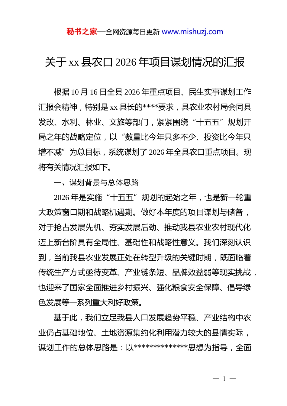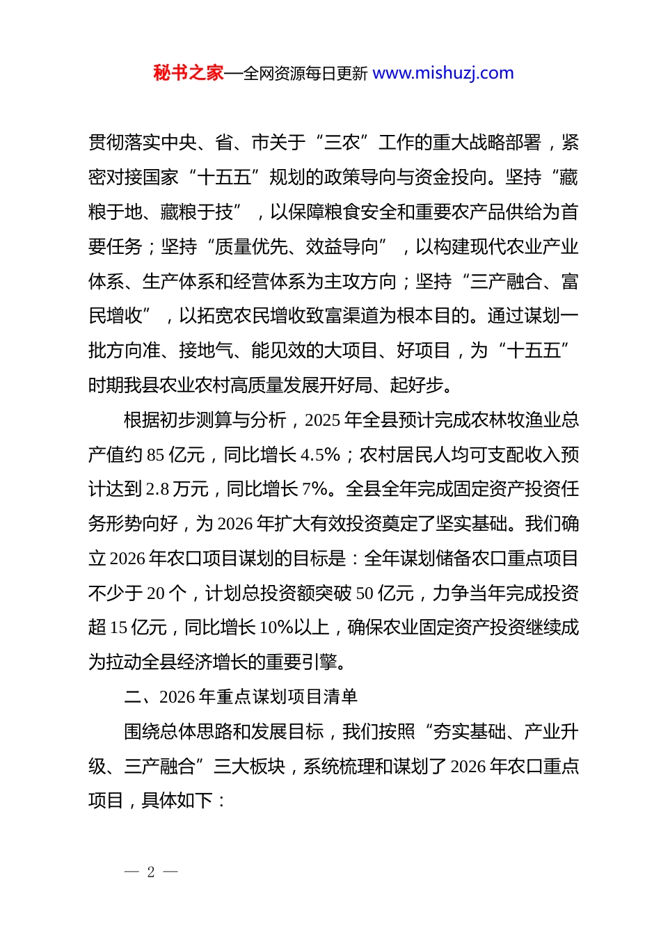 秘书之家—全网资源每日更新 www.mishuzj.com关于 xx 县农口 2026 年项目谋划情况的汇报根据 10 月 16 日全县 2026 年重点项目、民生实事谋划工作汇报会精神,特别是 xx 县长的****要求,县农业农村局会同县发改、水利、林业、文旅等部门,紧紧围绕“十五五”规划开局之年的战略定位,以“数量比今年只多不少、投资比今年只增不减”为总目标,系统谋划了 2026 年全县农口重点项目。现将有关情况汇报如下。一、谋划背景与总体思路2026 年是实施“十五五”规划的起始之年,也是新一轮重大政策窗口期和战略机遇期。做好本年度的项目谋划与储备,对于抢占发展先机、夯实发展后劲、推动我县农业农村现代化迈上新台阶具有全局性、基础性和战略性意义。我们深刻认识到,当前我县农业发展正处在转型升级的关键时期,既面临着传统生产方式亟待变革、产业链条短、品牌效益弱等现实挑战,也迎来了国家全面推进乡村振兴、强化粮食安全保障、倡导绿色发展等一系列重大利好政策。基于此,我们立足我县人口发展趋势平稳、产业结构中农业仍占基础地位、土地资源集约化利用潜力较大的县情实际,谋划工作的总体思路是:以**************思想为指导,全面— 1 —秘书之家—全网资源每日更新 www.mishuzj.com贯彻落实中央、省、市关于“三农”工作的重大战略部署,紧密对接国家“十五五”规划的政策导向与资金投向。坚持“藏粮于地、藏粮于技”,以保障粮食安全和重要农产品供给为首要任务;坚持“质量优先、效益导向”,以构建现代农业产业体系、生产体系和经营体系为主攻方向;坚持“三产融合、富民增收”,以拓宽农民增收致富渠道为根本目的。通过谋划一批方向准、接地气、能见效的大项目、好项目,为“十五五”时期我县农业农村高质量发展开好局、起好步。根据初步测算与分析,2025 年全县预计完成农林牧渔业总产值约 85 亿元,同比增长 4.5%;农村居民人均可支配收入预计达到 2.8 万元,同比增长 7%。全县全年完成固定资产投资任务形势向好,为 2026 年扩大有效投资奠定了坚实基础。我们确立 2026 年农口项目谋划的目标是:全年谋划储备农口重点项目不少于 20 个,计划总投资额突破 50 亿元,力争当年完成投资超 15 亿元,同比增长 10%以上,确保农业固定资产投资继续成为拉动全县经济增长的重要引擎。二、2026 年重点谋划项目清单围绕总体思路和发展目标,我们按照“夯实基础、产业升级、三产融合”三大板块,系统梳理和谋划了 2026 年农口重点项目,具体如下:— 2 —秘书之家—全网资源每日更新 www.mishuzj.com(一)夯实农业基础,保障粮食安全板块该板块聚焦补齐农业基础设施短板,提升农业综合生产能力,计划谋划项目 4 个,总投资约 12 亿元。一是 xx 县高标准农田建设项目(四期)。该项目旨在响应国家新一轮千亿斤粮食产能提升行动。计划总投资 4.5 亿元,在 xx 镇、xx 乡等粮食主产区,新建和改造提升高标准农田 10万亩。建设内容包括土地平整、土壤改良、灌排设施配套、田间道路畅通、农田林网建设及农田输配电设施完善等。项目建成后,预计项目区粮食单产可提高 10%-20%,实现“旱能灌、涝能排、路相通、机能行”。项目牵头单位为县农业农村局、县水利局,建设周期为 2026 年至 2027 年。二是 xx 河流域智慧节水灌溉及水系连通工程。为应对气候变化带来的不确定性,提升水资源利用效率,计划总投资 3.8亿元。项目将对 xx 河流域中下游灌区进行现代化改造,引入物联网、传感器和自动化控制技术,实现精准灌溉和智能化调度。同时,通过小型水库、塘坝的清淤扩容和管网连接,构建区域水系连通网络,增强农业抗旱减灾能力。项目牵头单位为县水利局,建设周期为 2026 年至 2028 年。三是 xx 县区域性农事服务中心建设项目。为解决小农户生产服务难题,计划总投资 1.7 亿元,在东部、西部、南部三个— 3 —秘书之家—全网资源每日更新 www.mishuzj.com片区各建设一个集约化、现代化的区域性农事服务中心。中心功能涵盖育秧育苗、农机作业、统防统治、烘干仓储等全链条服务,通过市场化运营,为周边农户提供“...