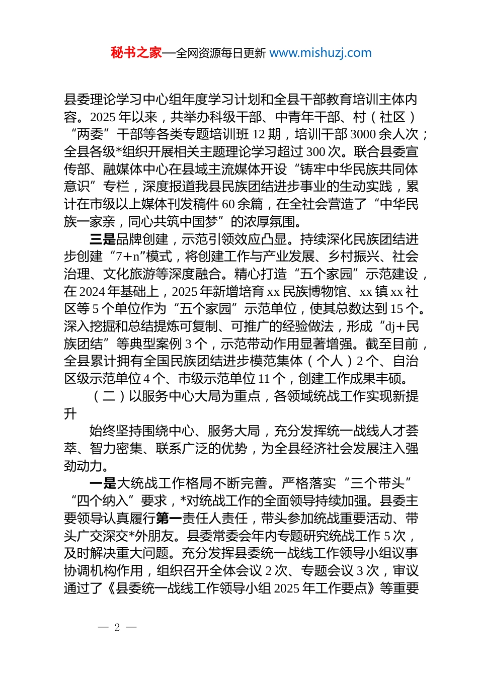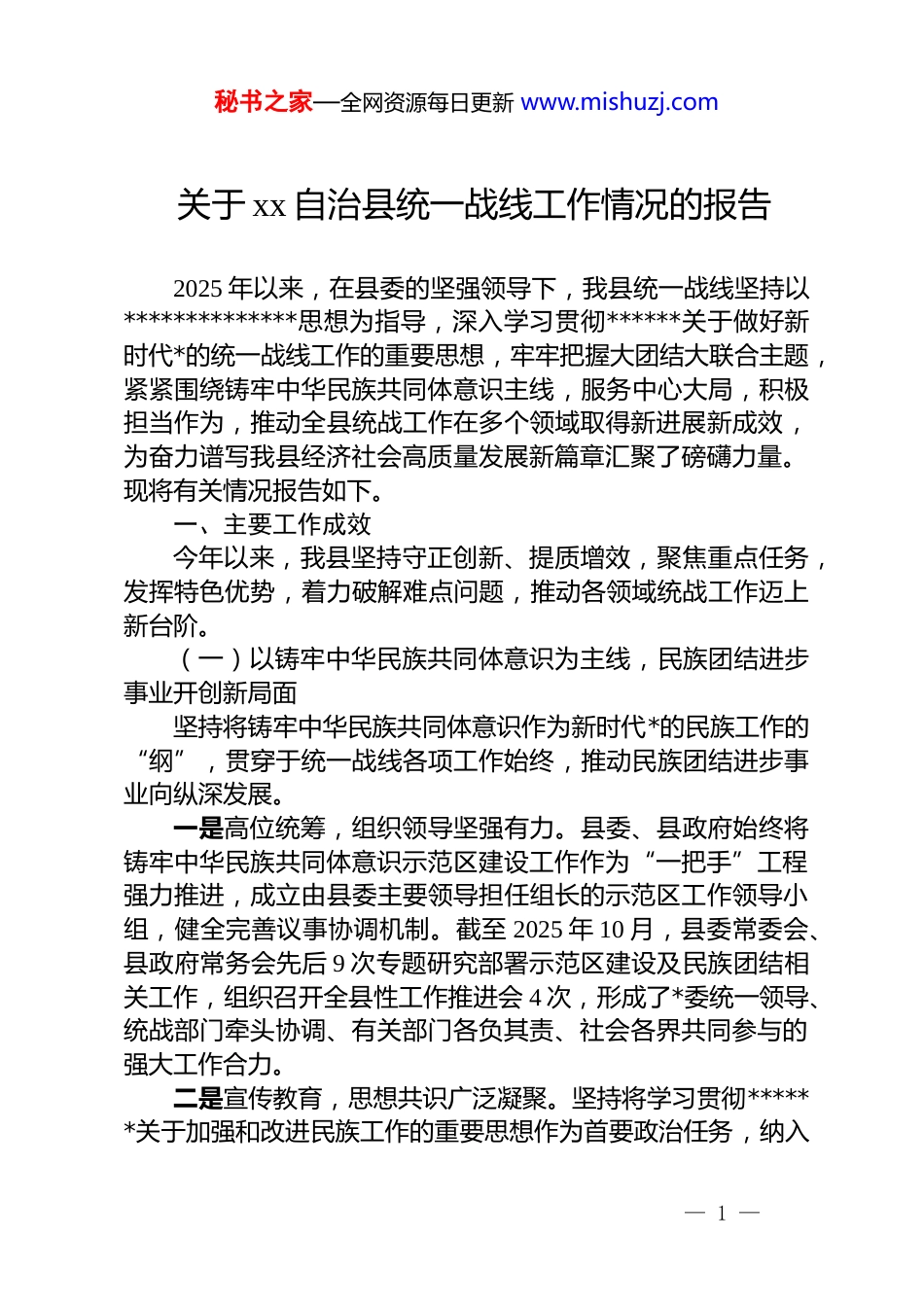 秘书之家—全网资源每日更新 www.mishuzj.com关于 xx 自治县统一战线工作情况的报告2025 年以来,在县委的坚强领导下,我县统一战线坚持以**************思想为指导,深入学习贯彻******关于做好新时代*的统一战线工作的重要思想,牢牢把握大团结大联合主题,紧紧围绕铸牢中华民族共同体意识主线,服务中心大局,积极担当作为,推动全县统战工作在多个领域取得新进展新成效,为奋力谱写我县经济社会高质量发展新篇章汇聚了磅礴力量。现将有关情况报告如下。一、主要工作成效今年以来,我县坚持守正创新、提质增效,聚焦重点任务,发挥特色优势,着力破解难点问题,推动各领域统战工作迈上新台阶。(一)以铸牢中华民族共同体意识为主线,民族团结进步事业开创新局面坚持将铸牢中华民族共同体意识作为新时代*的民族工作的“纲”,贯穿于统一战线各项工作始终,推动民族团结进步事业向纵深发展。一是高位统筹,组织领导坚强有力。县委、县政府始终将铸牢中华民族共同体意识示范区建设工作作为“一把手”工程强力推进,成立由县委主要领导担任组长的示范区工作领导小组,健全完善议事协调机制。截至 2025 年 10 月,县委常委会、县政府常务会先后 9 次专题研究部署示范区建设及民族团结相关工作,组织召开全县性工作推进会 4 次,形成了*委统一领导、统战部门牵头协调、有关部门各负其责、社会各界共同参与的强大工作合力。二是宣传教育,思想共识广泛凝聚。坚持将学习贯彻******关于加强和改进民族工作的重要思想作为首要政治任务,纳入— 1 —秘书之家—全网资源每日更新 www.mishuzj.com县委理论学习中心组年度学习计划和全县干部教育培训主体内容。2025 年以来,共举办科级干部、中青年干部、村(社区)“两委”干部等各类专题培训班 12 期,培训干部 3000 余人次;全县各级*组织开展相关主题理论学习超过 300 次。联合县委宣传部、融媒体中心在县域主流媒体开设“铸牢中华民族共同体意识”专栏,深度报道我县民族团结进步事业的生动实践,累计在市级以上媒体刊发稿件 60 余篇,在全社会营造了“中华民族一家亲,同心共筑中国梦”的浓厚氛围。三是品牌创建,示范引领效应凸显。持续深化民族团结进步创建“7+n”模式,将创建工作与产业发展、乡村振兴、社会治理、文化旅游等深度融合。精心打造“五个家园”示范建设,在 2024 年基础上,2025 年新增培育 xx 民族博物馆、xx 镇 xx 社区等 5 个单位作为“五个家园”示范单位,使其总数达到 15 个。深入挖掘和总结提炼可复制、可推广的经验做法,形成“dj+民族团结”等典型案例 3 个,示范带动作用显著增强。截至目前,全县累计拥有全国民族团结进步模范集体(个人)2 个、自治区级示范单位 4 个、市级示范单位 11 个,创建工作成果丰硕。(二)以服务中心大局为重点,各领域统战工作实现新提升始终坚持围绕中心、服务大局,充分发挥统一战线人才荟萃、智力密集、联系广泛的优势,为全县经济社会发展注入强劲动力。一是大统战工作格局不断完善。严格落实“三个带头”“四个纳入”要求,*对统战工作的全面领导持续加强。县委主要领导认真履行第一责任人责任,带头参加统战重要活动、带头广交深交*外朋友。县委常委会年内专题研究统战工作 5 次,及时解决重大问题。充分发挥县委统一战线工作领导小组议事协调机构作用,组织召开全体会议 2 次、专题会议 3 次,审议通过了《县委统一战线工作领导小组 2025 年工作要点》等重要— 2 —秘书之家—全网资源每日更新 www.mishuzj.com文件,研究解决了民营经济发展、基层统战阵地建设等一批重点难点问题,推动统战领域重大决策部署落地见效。二是多*合作和政治协商效能彰显。坚持和完善中国共产*领导的多*合作和政治协商制度,全面落实“*委出题、*派调研、政府采纳、部门落实”的工作机制。根据县委出台的《2025 年政治协商计划》,组织各民主*派、工商联和无*派人士围绕“优化营商环境”“发展生态旅游产业”等重点课题深入开展调研,形成高质量调研报告 5 篇,所提意见建议 80%以上被县委、县政府及相关部门采纳。大力加强*外代...