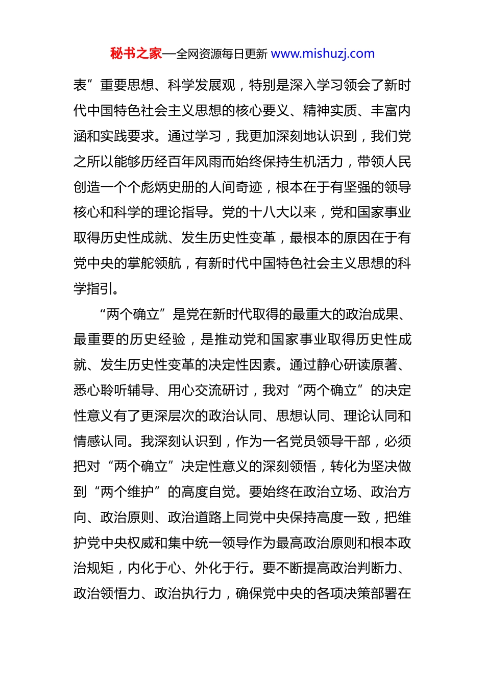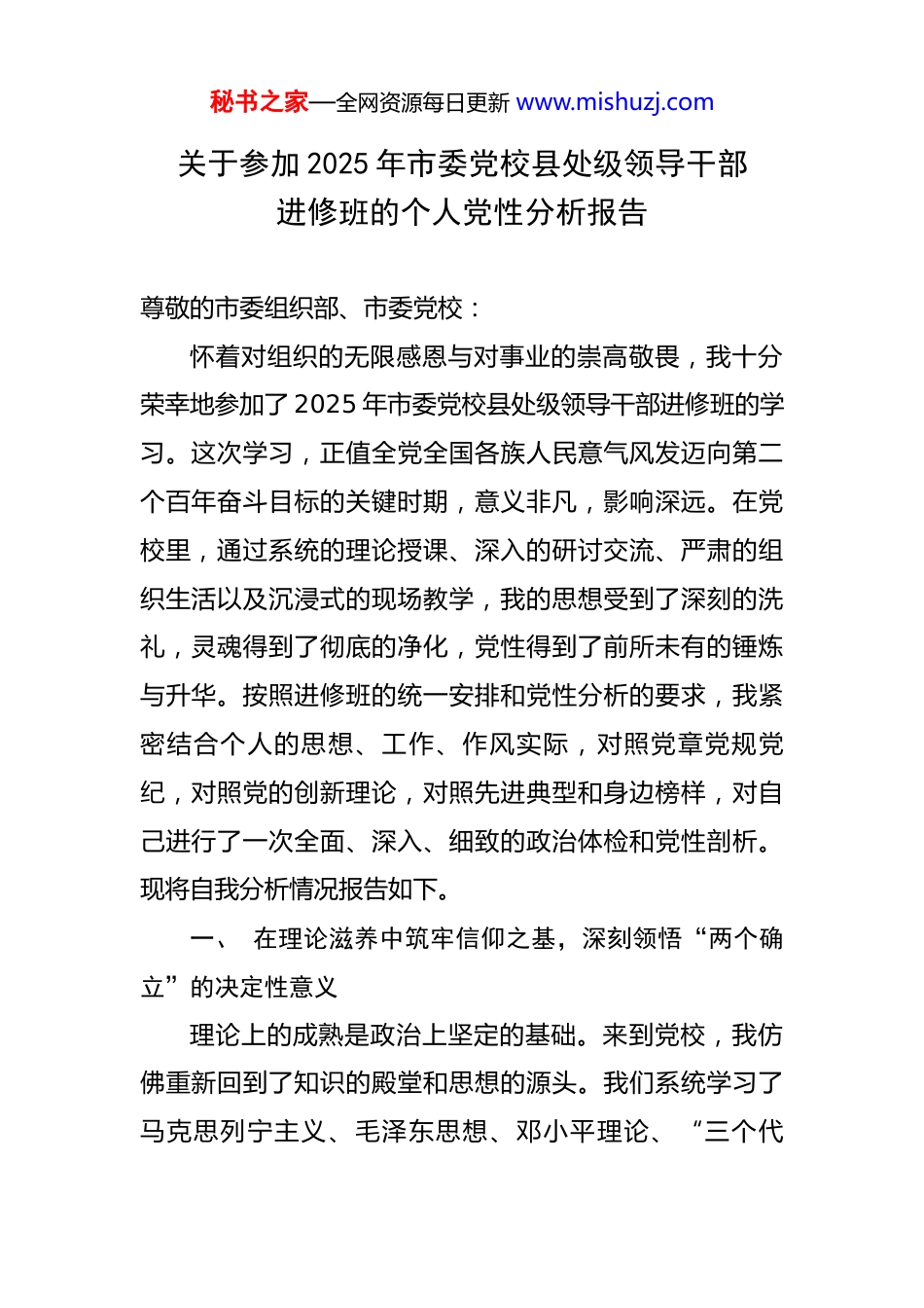 秘书之家—全网资源每日更新 www.mishuzj.com关于参加 2025 年市委党校县处级领导干部进修班的个人党性分析报告 尊敬的市委组织部、市委党校:怀着对组织的无限感恩与对事业的崇高敬畏,我十分荣幸地参加了 2025 年市委党校县处级领导干部进修班的学习。这次学习,正值全党全国各族人民意气风发迈向第二个百年奋斗目标的关键时期,意义非凡,影响深远。在党校里,通过系统的理论授课、深入的研讨交流、严肃的组织生活以及沉浸式的现场教学,我的思想受到了深刻的洗礼,灵魂得到了彻底的净化,党性得到了前所未有的锤炼与升华。按照进修班的统一安排和党性分析的要求,我紧密结合个人的思想、工作、作风实际,对照党章党规党纪,对照党的创新理论,对照先进典型和身边榜样,对自己进行了一次全面、深入、细致的政治体检和党性剖析。现将自我分析情况报告如下。一、 在理论滋养中筑牢信仰之基,深刻领悟“两个确立”的决定性意义理论上的成熟是政治上坚定的基础。来到党校,我仿佛重新回到了知识的殿堂和思想的源头。我们系统学习了马克思列宁主义、毛泽东思想、邓小平理论、“三个代秘书之家—全网资源每日更新 www.mishuzj.com表”重要思想、科学发展观,特别是深入学习领会了新时代中国特色社会主义思想的核心要义、精神实质、丰富内涵和实践要求。通过学习,我更加深刻地认识到,我们党之所以能够历经百年风雨而始终保持生机活力,带领人民创造一个个彪炳史册的人间奇迹,根本在于有坚强的领导核心和科学的理论指导。党的十八大以来,党和国家事业取得历史性成就、发生历史性变革,最根本的原因在于有党中央的掌舵领航,有新时代中国特色社会主义思想的科学指引。“两个确立”是党在新时代取得的最重大的政治成果、最重要的历史经验,是推动党和国家事业取得历史性成就、发生历史性变革的决定性因素。通过静心研读原著、悉心聆听辅导、用心交流研讨,我对“两个确立”的决定性意义有了更深层次的政治认同、思想认同、理论认同和情感认同。我深刻认识到,作为一名党员领导干部,必须把对“两个确立”决定性意义的深刻领悟,转化为坚决做到“两个维护”的高度自觉。要始终在政治立场、政治方向、政治原则、政治道路上同党中央保持高度一致,把维护党中央权威和集中统一领导作为最高政治原则和根本政治规矩,内化于心、外化于行。要不断提高政治判断力、政治领悟力、政治执行力,确保党中央的各项决策部署在秘书之家—全网资源每日更新 www.mishuzj.com我的工作领域不折不扣地落地生根、开花结果。二、 在反躬自省中检视差距不足,勇于直面自身存在的突出问题“君子博学而日参省乎己,则知明而行无过矣。”在党校浓厚的学习氛围和严肃的政治生活中,我坚持问题导向,以“吾日三省吾身”的态度,认真对照检查,深刻反思自身在党性修养方面存在的差距和不足。主要体现在以下几个方面:在理论学习的系统性和穿透力上还有欠缺。虽然平时也能坚持学习,但有时存在“碎片化”、“选择性”学习的问题,对党的创新理论体系把握不够完整、理解不够透彻。特别是运用其立场、观点、方法来观察时代、把握时代、引领时代的能力有待加强。比如,在面对工作中一些复杂矛盾和深层次问题时,有时会感到“本领恐慌”,其根源就在于理论功底不够扎实,未能完全做到融会贯通、知行合一。满足于“知道是什么”,但在“弄懂为什么”、“掌握怎么用”上还下得功夫不够,导致在指导实践、推动工作时,战略思维、历史思维、辩证思维、系统思维、创新思维、法治思维、底线思维能力尚需进一步提升。在政治执行的穿透力和创造性上仍有不足。能够自觉秘书之家—全网资源每日更新 www.mishuzj.com维护党中央权威和集中统一领导,但在将大政方针与本地本部门实际紧密结合,创造性地开展工作方面,思考得不够深、办法不够多。有时存在一定的“路径依赖”和“守成”心态,对于上级有明确要求的、过去有成熟经验的,推进起来比较顺手;但对于需要先行先试、闯出新路的领域,则显得顾虑较多、魄力不足。在执行过程中,有时过于强调“不走样”,但在如何“做得更好”、“更见实效”上,创新举措不多,未能完全...
