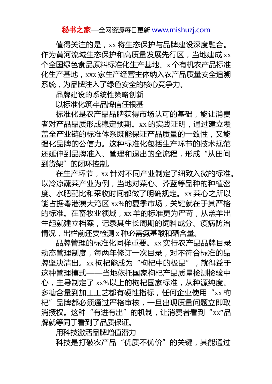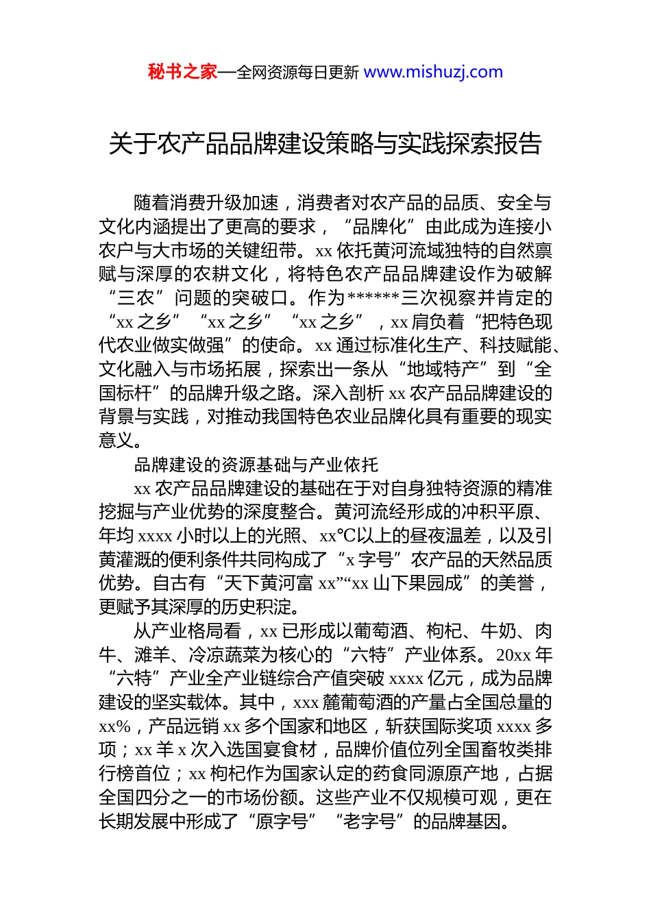 秘书之家—全网资源每日更新 www.mishuzj.com关于农产品品牌建设策略与实践探索报告随着消费升级加速,消费者对农产品的品质、安全与文化内涵提出了更高的要求,“品牌化”由此成为连接小农户与大市场的关键纽带。xx 依托黄河流域独特的自然禀赋与深厚的农耕文化,将特色农产品品牌建设作为破解“三农”问题的突破口。作为******三次视察并肯定的“xx 之乡”“xx 之乡”“xx 之乡”,xx 肩负着“把特色现代农业做实做强”的使命。xx 通过标准化生产、科技赋能、文化融入与市场拓展,探索出一条从“地域特产”到“全国标杆”的品牌升级之路。深入剖析 xx 农产品品牌建设的背景与实践,对推动我国特色农业品牌化具有重要的现实意义。品牌建设的资源基础与产业依托xx 农产品品牌建设的基础在于对自身独特资源的精准挖掘与产业优势的深度整合。黄河流经形成的冲积平原、年均 xxxx 小时以上的光照、xx℃以上的昼夜温差,以及引黄灌溉的便利条件共同构成了“x 字号”农产品的天然品质优势。自古有“天下黄河富 xx”“xx 山下果园成”的美誉,更赋予其深厚的历史积淀。从产业格局看,xx 已形成以葡萄酒、枸杞、牛奶、肉牛、滩羊、冷凉蔬菜为核心的“六特”产业体系。20xx 年“六特”产业全产业链综合产值突破 xxxx 亿元,成为品牌建设的坚实载体。其中,xxx 麓葡萄酒的产量占全国总量的xx%,产品远销 xx 多个国家和地区,斩获国际奖项 xxxx 多项;xx 羊 x 次入选国宴食材,品牌价值位列全国畜牧类排行榜首位;xx 枸杞作为国家认定的药食同源原产地,占据全国四分之一的市场份额。这些产业不仅规模可观,更在长期发展中形成了“原字号”“老字号”的品牌基因。秘书之家—全网资源每日更新 www.mishuzj.com值得关注的是,xx 将生态保护与品牌建设深度融合。作为黄河流域生态保护和高质量发展先行区,当地建成 xx个全国绿色食品原料标准化生产基地、x 个有机农产品标准化生产基地,xxx 家生产经营主体纳入农产品质量安全追溯系统,为品牌注入了绿色安全的核心竞争力。品牌建设的系统性策略创新以标准化筑牢品牌信任根基标准化是农产品品牌获得市场认可的基础,能让消费者对产品品质形成稳定预期。xx 的实践证明,通过建立覆盖全产业链的标准体系既能保证产品质量的一致性,又能强化品牌的公信力。这种标准化包括生产环节的技术规范还延伸到品牌准入、管理和退出的全流程,形成“从田间到货架”的闭环控制。在生产环节,xx 针对不同产业制定了细致入微的标准。以冷凉蔬菜产业为例,当地对菜心、芥蓝等品种的种植密度、水肥配比和采收时间都做了明确规定。xx 菜心之所以能占据粤港澳大湾区 xx%的夏季市场,关键就在于其严格的标准。在畜牧业领域,xx 羊的标准更为严苛,从羔羊出生起就建立档案,记录其生长周期的饲料成分、疫病防治情况,出栏前还要检测 x 种必需氨基酸和硒含量。品牌管理的标准化同样重要。xx 实行农产品品牌目录动态管理制度,每两年修订一次目录,对不符合标准的品牌坚决清出。xx 枸杞能成为“枸杞中的极品”,就得益于这种管理模式——当地依托国家枸杞产品质量检测检验中心,主导制定了 xx%以上的枸杞国家标准,从种源纯度、多糖含量到加工工艺都有硬性指标,任何企业使用“xx 枸杞”品牌都必须通过严格审核,一旦出现质量问题立即取消授权。这种“有进有出”的机制,让消费者看到“xx”品牌就等同于看到了品质保证。用科技激活品牌增值潜力科技是打破农产品“优质不优价”的关键,其能通过秘书之家—全网资源每日更新 www.mishuzj.com提升品质、延长产业链及优化流通效率的方式,为品牌注入持续增长的动力。品种创新是科技赋能的起点,xx 枸杞之所以“名冠天下”,离不开品种的持续优化。xx 枸杞创新研究院破译了枸杞全基因组,培育出的新品种多糖含量比普通品种高 xx%,这些核心指标的突破让“xx 枸杞”从普通食材升级为滋补珍品。数字技术的应用让品牌更具透明度。xx 山东麓葡萄酒产业搭建了质量安全信息平台,消费者扫码就能查看葡萄的种植地点、采摘时间、发酵过程,甚至能看到酿酒师的信息。这种“全程可追溯”...