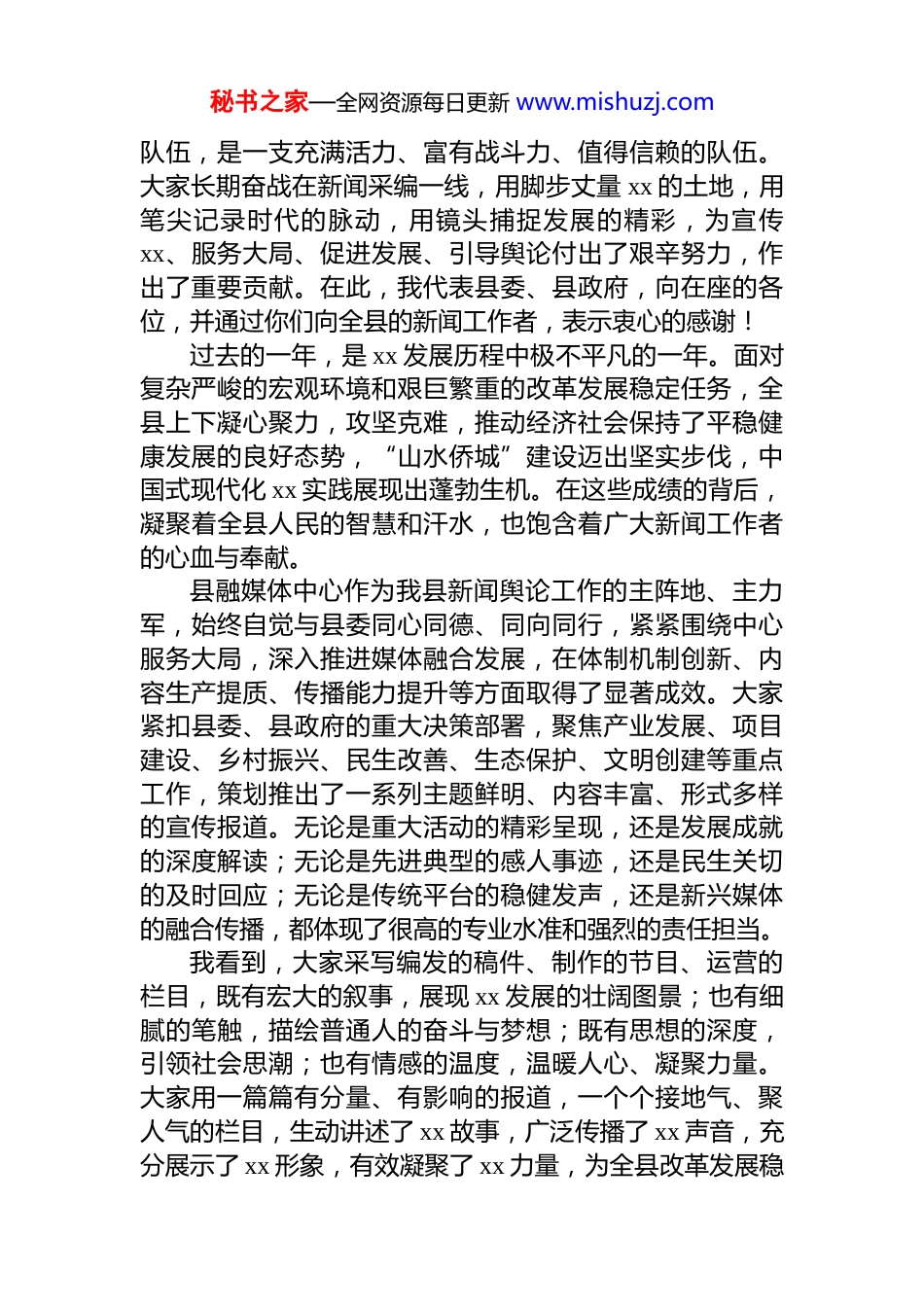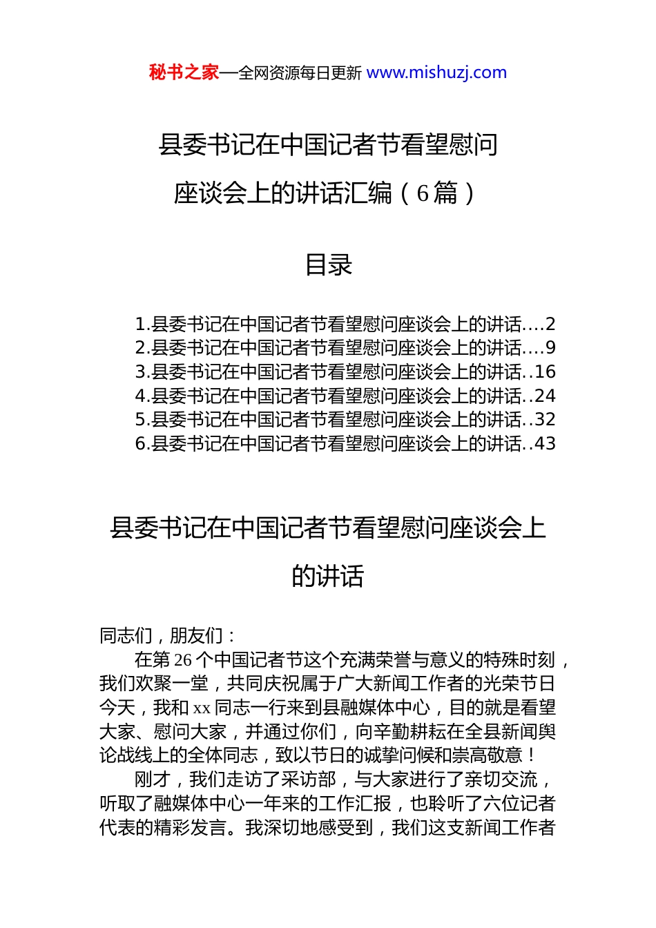 秘书之家—全网资源每日更新 www.mishuzj.com县委书记在中国记者节看望慰问座谈会上的讲话汇编(6 篇)目录1.县委书记在中国记者节看望慰问座谈会上的讲话....22.县委书记在中国记者节看望慰问座谈会上的讲话....93.县委书记在中国记者节看望慰问座谈会上的讲话..164.县委书记在中国记者节看望慰问座谈会上的讲话..245.县委书记在中国记者节看望慰问座谈会上的讲话..326.县委书记在中国记者节看望慰问座谈会上的讲话..43县委书记在中国记者节看望慰问座谈会上的讲话同志们,朋友们:在第 26 个中国记者节这个充满荣誉与意义的特殊时刻,我们欢聚一堂,共同庆祝属于广大新闻工作者的光荣节日今天,我和 xx 同志一行来到县融媒体中心,目的就是看望大家、慰问大家,并通过你们,向辛勤耕耘在全县新闻舆论战线上的全体同志,致以节日的诚挚问候和崇高敬意!刚才,我们走访了采访部,与大家进行了亲切交流,听取了融媒体中心一年来的工作汇报,也聆听了六位记者代表的精彩发言。我深切地感受到,我们这支新闻工作者秘书之家—全网资源每日更新 www.mishuzj.com队伍,是一支充满活力、富有战斗力、值得信赖的队伍。大家长期奋战在新闻采编一线,用脚步丈量 xx 的土地,用笔尖记录时代的脉动,用镜头捕捉发展的精彩,为宣传xx、服务大局、促进发展、引导舆论付出了艰辛努力,作出了重要贡献。在此,我代表县委、县政府,向在座的各位,并通过你们向全县的新闻工作者,表示衷心的感谢!过去的一年,是 xx 发展历程中极不平凡的一年。面对复杂严峻的宏观环境和艰巨繁重的改革发展稳定任务,全县上下凝心聚力,攻坚克难,推动经济社会保持了平稳健康发展的良好态势,“山水侨城”建设迈出坚实步伐,中国式现代化 xx 实践展现出蓬勃生机。在这些成绩的背后,凝聚着全县人民的智慧和汗水,也饱含着广大新闻工作者的心血与奉献。县融媒体中心作为我县新闻舆论工作的主阵地、主力军,始终自觉与县委同心同德、同向同行,紧紧围绕中心服务大局,深入推进媒体融合发展,在体制机制创新、内容生产提质、传播能力提升等方面取得了显著成效。大家紧扣县委、县政府的重大决策部署,聚焦产业发展、项目建设、乡村振兴、民生改善、生态保护、文明创建等重点工作,策划推出了一系列主题鲜明、内容丰富、形式多样的宣传报道。无论是重大活动的精彩呈现,还是发展成就的深度解读;无论是先进典型的感人事迹,还是民生关切的及时回应;无论是传统平台的稳健发声,还是新兴媒体的融合传播,都体现了很高的专业水准和强烈的责任担当。我看到,大家采写编发的稿件、制作的节目、运营的栏目,既有宏大的叙事,展现 xx 发展的壮阔图景;也有细腻的笔触,描绘普通人的奋斗与梦想;既有思想的深度,引领社会思潮;也有情感的温度,温暖人心、凝聚力量。大家用一篇篇有分量、有影响的报道,一个个接地气、聚人气的栏目,生动讲述了 xx 故事,广泛传播了 xx 声音,充分展示了 xx 形象,有效凝聚了 xx 力量,为全县改革发展稳秘书之家—全网资源每日更新 www.mishuzj.com定营造了良好的舆论氛围,提供了强大的精神支撑。实践证明,我县的新闻工作者队伍是一支政治强、业务精、纪律严、作风正的队伍,是推动 xx 高质量发展和现代化建设不可或缺的重要力量。当前,我们正处在全面建设社会主义现代化国家、向第二个百年奋斗目标进军的关键时期。我县也正处于转型升级、跨越发展的攻坚期,“山水侨城”建设全域出彩的加速期,谱写中国式现代化 xx 新篇章的起步期。新的征程、新的使命,对新闻舆论工作提出了新的更高要求。新闻舆论工作是治国理政、定国安邦的大事,处在意识形态斗争的最前沿。做好新时代的新闻舆论工作,责任重大,使命光荣。借此机会,我向大家提几点希望和要求:第一,要维护“核心”,争当对*忠诚的坚定践行者。新闻舆论工作具有鲜明的政治属性,坚持正确的政治方向是新闻舆论工作的灵魂和生命线。广大新闻工作者必须把政治建设摆在首位,深刻认识“两个确立”的决定性意义增强“四个意识”、坚定“四个自信”、做到“两个维护”,自觉在思想上政治上行动上同*中央保持高度...
