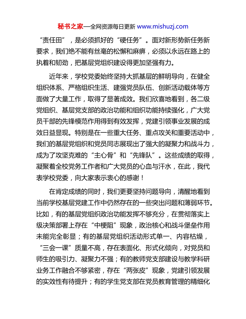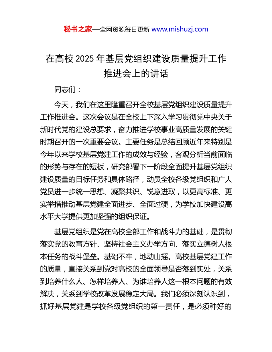 秘书之家—全网资源每日更新 www.mishuzj.com在高校 2025 年基层党组织建设质量提升工作推进会上的讲话同志们:今天,我们在这里隆重召开全校基层党组织建设质量提升工作推进会。这次会议是在全校上下深入学习贯彻党中央关于新时代党的建设总要求,奋力推进学校事业高质量发展的关键时期召开的一次重要会议。主要任务是总结回顾近年来特别是今年以来学校基层党建工作的成效与经验,客观分析当前面临的形势与存在的短板,研究部署下一阶段全面提升基层党组织建设质量的目标任务和具体路径,动员全校各级党组织和广大党员进一步统一思想、凝聚共识、锐意进取,以更高标准、更实举措推动基层党建全面进步、全面过硬,为学校加快建设高水平大学提供更加坚强的组织保证。基层党组织是党在高校全部工作和战斗力的基础,是贯彻落实党的教育方针、坚持社会主义办学方向、落实立德树人根本任务的战斗堡垒。基础不牢,地动山摇。高校基层党建工作的质量,直接关系到党对高校的全面领导是否落到实处,关系到培养什么人、怎样培养人、为谁培养人这一根本问题的有效解决,关系到学校改革发展稳定大局。我们必须深刻认识到,抓好基层党建是学校各级党组织的第一责任,是必须种好的秘书之家—全网资源每日更新 www.mishuzj.com“责任田”,是必须抓好的“硬任务”。面对新形势新任务新要求,我们绝不能有丝毫的松懈和麻痹,必须以永远在路上的执着和韧劲,把基层党组织建设得更加坚强有力。近年来,学校党委始终坚持大抓基层的鲜明导向,在健全组织体系、严格组织生活、建强党员队伍、创新活动载体等方面做了大量工作,取得了显著成效。我们欣喜地看到,各二级党组织、基层党支部的政治功能和组织功能持续强化,广大党员干部的先锋模范作用得到有效发挥,党建引领事业发展的成效日益显现。特别是在一些重大任务、重点攻关和重要活动中,我们的基层党组织和党员同志展现出了强大的凝聚力和战斗力,成为了攻坚克难的“主心骨”和“先锋队”。这些成绩的取得,凝聚着全校党务工作者和广大党员的心血与汗水,在此,我代表学校党委,向大家表示衷心的感谢!在肯定成绩的同时,我们更要坚持问题导向,清醒地看到当前学校基层党建工作中仍然存在的一些突出问题和薄弱环节。比如,有的基层党组织政治功能发挥不够充分,在贯彻落实上级决策部署上存在“中梗阻”现象,政治核心和战斗堡垒作用未能完全彰显;有的基层党组织活动形式单一、内容枯燥,“三会一课”质量不高,存在表面化、形式化倾向,对党员和师生的吸引力、凝聚力不强;有的教师党支部建设与教学科研业务工作融合不够紧密,存在“两张皮”现象,党建引领发展的实效性有待提升;有的学生党支部在党员教育管理的精细化秘书之家—全网资源每日更新 www.mishuzj.com程度上还有差距,党员发展的质量关口需要进一步把严;部分党务干部的能力素质与新时代党建工作的要求还不完全适应,存在业务不熟、办法不多、动力不足的情况;院系一级党组织在指导、督促、检查基层党支部建设方面,作用发挥还不够均衡有力。对于这些问题,我们必须高度重视,深刻反思,并在今后的工作中采取有力措施,切实加以解决。要始终把政治建设摆在首位,不断强化基层党组织的政治功能。高校是意识形态工作的前沿阵地,基层党组织必须成为坚守马克思主义指导地位的坚强阵地。要教育引导广大师生党员深刻领悟“两个确立”的决定性意义,增强“四个意识”、坚定“四个自信”、做到“两个维护”,自觉在思想上政治上行动上同党中央保持高度一致。要严格执行“第一议题”制度,及时跟进学习党的最新理论成果和重要讲话精神,不断提高政治判断力、政治领悟力、政治执行力。要严肃党内政治生活,严格执行新形势下党内政治生活若干准则,增强党内政治生活的政治性、时代性、原则性、战斗性,营造风清气正的良好政治生态。要牢牢掌握意识形态工作领导权,严格落实意识形态工作责任制,管好用好各类阵地,敢于发声亮剑,坚决抵制各种错误思潮侵蚀,切实维护学校政治安全和校园稳定。要着力优化组织体系,推动基层党组织全面覆盖、有效覆盖。要按照与教学、科研、管理、服务等机构...