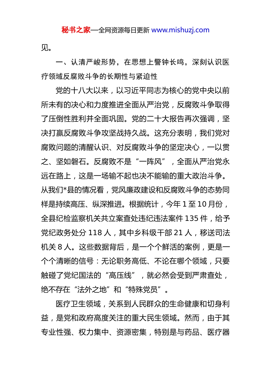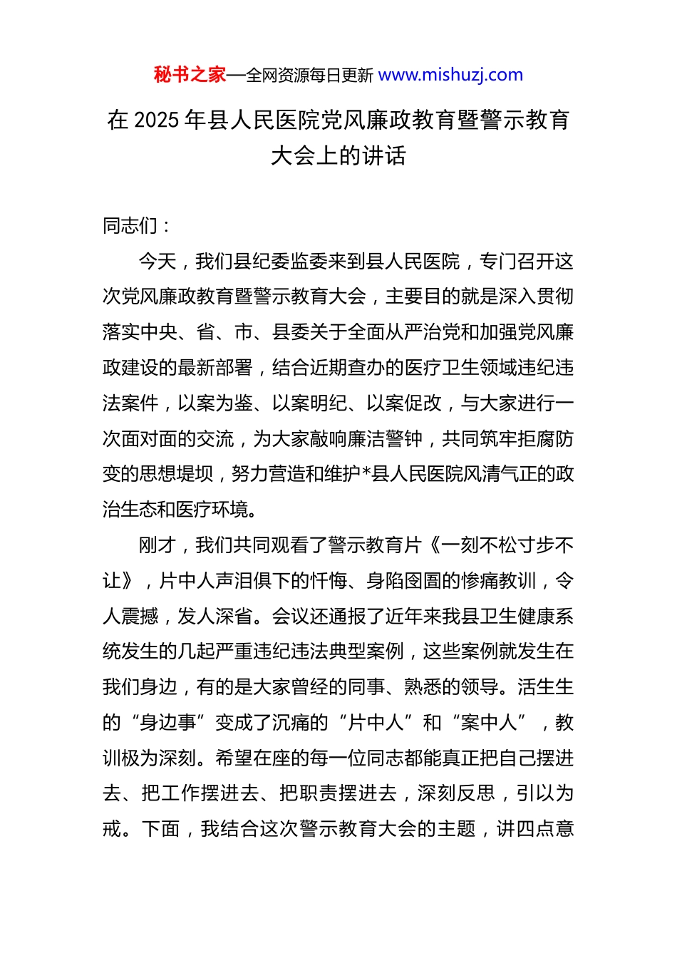 秘书之家—全网资源每日更新 www.mishuzj.com在 2025 年县人民医院党风廉政教育暨警示教育大会上的讲话 同志们:今天,我们县纪委监委来到县人民医院,专门召开这次党风廉政教育暨警示教育大会,主要目的就是深入贯彻落实中央、省、市、县委关于全面从严治党和加强党风廉政建设的最新部署,结合近期查办的医疗卫生领域违纪违法案件,以案为鉴、以案明纪、以案促改,与大家进行一次面对面的交流,为大家敲响廉洁警钟,共同筑牢拒腐防变的思想堤坝,努力营造和维护*县人民医院风清气正的政治生态和医疗环境。刚才,我们共同观看了警示教育片《一刻不松寸步不让》,片中人声泪俱下的忏悔、身陷囹圄的惨痛教训,令人震撼,发人深省。会议还通报了近年来我县卫生健康系统发生的几起严重违纪违法典型案例,这些案例就发生在我们身边,有的是大家曾经的同事、熟悉的领导。活生生的“身边事”变成了沉痛的“片中人”和“案中人”,教训极为深刻。希望在座的每一位同志都能真正把自己摆进去、把工作摆进去、把职责摆进去,深刻反思,引以为戒。下面,我结合这次警示教育大会的主题,讲四点意秘书之家—全网资源每日更新 www.mishuzj.com见。一、认清严峻形势,在思想上警钟长鸣,深刻认识医疗领域反腐败斗争的长期性与紧迫性党的十八大以来,以习近平同志为核心的党中央以前所未有的决心和力度推进全面从严治党,反腐败斗争取得了压倒性胜利并全面巩固。党的二十大报告再次强调,坚决打赢反腐败斗争攻坚战持久战。这充分表明,我们党对腐败问题的清醒认识、对反腐败斗争的坚定决心,一以贯之、坚如磐石。反腐败不是“一阵风”,全面从严治党永远在路上,这是一场输不起也决不能输的重大政治斗争。从我们*县的情况看,党风廉政建设和反腐败斗争的态势同样是持续高压、纵深推进。根据统计,今年 1 至 10 月份,全县纪检监察机关共立案查处违纪违法案件 135 件,给予党纪政务处分 118 人,其中乡科级干部 21 人,移送司法机关 8 人。这些数据背后,是一个个鲜活的案例,更是一个个清晰的信号:无论职务高低、不论在哪个领域,只要触碰了党纪国法的“高压线”,就必然会受到严肃查处,绝不存在“法外之地”和“特殊党员”。医疗卫生领域,关系到人民群众的生命健康和切身利益,是党和政府高度关注的重大民生领域。然而,由于其专业性强、权力集中、资源密集,特别是与药品、医疗器秘书之家—全网资源每日更新 www.mishuzj.com械、耗材供应商及基建工程方联系紧密,使其成为腐败问题易发多发的高风险地带。近年来,全国各地查处的医疗领域腐败案件触目惊心,从“塌方式”腐败的医院领导班子,到“链条式”腐败的重点科室;从“小官大贪”的设备科长、药剂科主任,到收受回扣、滥开检查的普通医生,腐败行为呈现出系统化、产业化、隐蔽化的特征,严重损害了医务工作者“白衣天使”的圣洁形象,严重侵蚀了人民群众的获得感、幸福感和安全感。就我们县而言,卫生健康系统也绝非一片净土。刚才通报的案例就是最好的证明。从收受药品耗材供应商的“感谢费”,到利用基建项目、设备采购的决策权为他人谋利;从违规接受宴请、旅游安排,到内外勾结、骗取医保基金,这些问题的发生,暴露出我们有的单位管党治党责任虚化弱化,制度建设存在漏洞,对干部的教育、管理和监督失之于宽、失之于软。大家必须清醒地认识到,对医疗领域腐败问题的零容忍,是中央的明确要求,是群众的强烈期盼,也是我们纪检监察机关下一步监督执纪问责的重中之重。任何人切勿心存侥幸,认为行业特殊就可以成为“纪外之地”,认为手段隐蔽就能“瞒天过海”。天网恢恢,疏而不漏,伸手必被捉,莫伸手!二、深刻吸取教训,以反面典型为镜鉴,时刻绷紧廉秘书之家—全网资源每日更新 www.mishuzj.com洁自律这根弦“以史为镜,可以知兴替;以人为镜,可以明得失。”警示教育片和通报的案例中,那些曾经的奋斗者、业务骨干,甚至是受人尊敬的领导干部,是如何一步步滑向犯罪深渊的?他们的堕落轨迹,值得我们每一个人深思。一是“总开关”失守,理想信念动摇。纵观所有落马干部的忏悔书,几乎都提到一点,就是放松了学...
