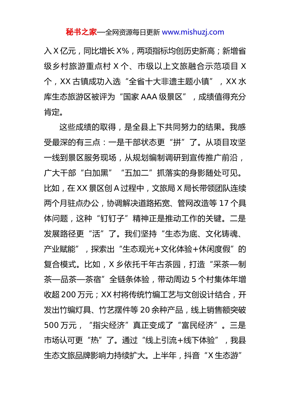 秘书之家—全网资源每日更新 www.mishuzj.com在 2025 年县生态文旅示范区工作部署会上的讲话 同志们:今天,我们利用半天时间召开全县生态文旅示范区工作部署会,主要任务是深入学习贯彻习近平总书记关于文化和旅游工作的重要论述,全面落实中央和省、市关于推动文旅融合发展的决策部署,聚焦“生态立县、文化兴县、旅游强县”战略目标,系统谋划下一步重点工作,以更高标准、更实举措推动我县生态文旅示范区建设迈上新台阶。刚才,县文旅局通报了上半年示范区建设进展, X镇、X 乡、县交通局、县文旅集团作了发言,讲得很实在、很有针对性,既总结了成绩,也直面了问题,我完全赞同。下面,结合当前形势和工作实际,我讲四点意见。一、在总结成效中坚定信心,深刻把握生态文旅发展的“时”与“势”今年以来,全县上下深入贯彻“绿水青山就是金山银山”理念,以生态文旅示范区建设为抓手,统筹推进保护与开发、传承与创新,各项工作取得了阶段性成效。上半年,全县接待游客 XX 万人次,同比增长 X%;旅游综合收秘书之家—全网资源每日更新 www.mishuzj.com入 X 亿元,同比增长 X%,两项指标均创历史新高;新增省级乡村旅游重点村 X 个、市级以上文旅融合示范项目 X个,XX 古镇成功入选“全省十大非遗主题小镇”,XX 水库生态旅游区被评为“国家 AAA 级景区”,成绩值得充分肯定。这些成绩的取得,是全县上下共同努力的结果。我感受最深的有三点:一是干部状态更“拼”了。从项目攻坚一线到景区服务现场,从规划编制调研到宣传推广前沿,广大干部“白加黑”“五加二”抓落实的身影随处可见。比如,在 XX 景区创 A 过程中,文旅局 X 局长带领团队连续两个月驻点办公,协调解决道路拓宽、管网改造等 17 个具体问题,这种“钉钉子”精神正是推动工作的关键。二是发展路径更“活”了。我们坚持“生态为底、文化铸魂、产业赋能”,探索出“生态观光+文化体验+休闲度假”的复合模式。比如,X 乡依托千年古茶园,打造“采茶—制茶—品茶—茶宿”全链条体验,带动周边 5 个村集体年增收超 200 万元;XX 村将传统竹编工艺与文创设计结合,开发出竹编灯具、竹艺摆件等 20 余种产品,线上销售额突破500 万元,“指尖经济”真正变成了“富民经济”。三是市场认可更“热”了。通过“线上引流+线下体验”,我县生态文旅品牌影响力持续扩大。上半年,抖音“X 生态游”秘书之家—全网资源每日更新 www.mishuzj.com话题播放量达 X 亿次,XX 民宿集群入住率稳定在 85%以上,甚至出现“周末一房难求”的现象;外地游客占比从去年的 X%提升至 XX%,特别是长三角地区游客数量增长XX%,印证了我们的生态优势正在转化为发展优势。这些成效充分说明,只要我们找准方向、真抓实干,生态文旅这条路不仅走得通,更能走得好、走得远。但也要清醒看到,对照“打造全省乃至全国生态文旅示范标杆”的目标,我们还有不少短板:有的乡镇规划滞后,存在“重开发轻保护”倾向,个别项目破坏山体植被、影响河道生态;有的景区服务标准化水平不高,导游讲解、游客投诉处理等环节仍有漏洞;文旅融合深度不够,“有景点没文化”“有产品没故事”的现象还比较突出;配套基础设施存在短板,部分乡村道路狭窄、停车场不足、智慧化服务滞后,制约了游客体验提升。对此,我们必须高度重视,采取有力措施加以解决。二、在把握大局中把准方向,深刻认识生态文旅发展的“责”与“任”当前,世界百年变局加速演进,国内经济持续回升向好,文旅消费需求呈现“个性化、品质化、多元化”特征,生态文旅发展迎来前所未有的机遇。从政策层面看,中央出台《关于推动文化和旅游深度融合发展的意见》,秘书之家—全网资源每日更新 www.mishuzj.com省里实施“大黄山”“大湘西”等区域文旅发展战略,市里明确“打造生态文旅名城”目标,为我县提供了政策红利;从市场层面看,后疫情时代“微度假”“轻户外”“慢生活”成为主流,我县森林覆盖率 XX%、负氧离子浓度超 XX 个/cm³ 的生态本底,加上保存完好的古村落、非遗技艺、红色遗址等文化资源,正好契合市场需求;从自身层面看,经过近年...
