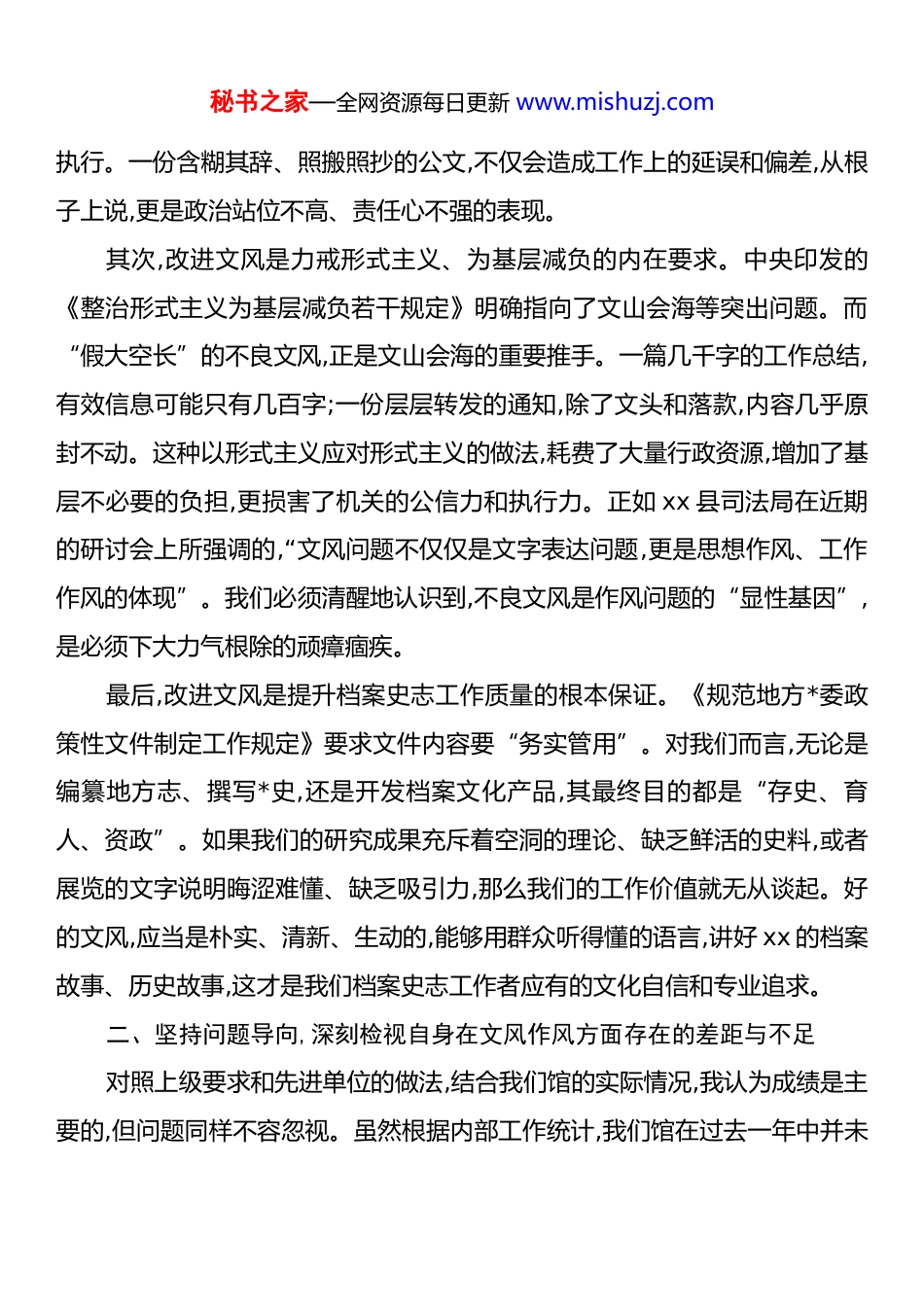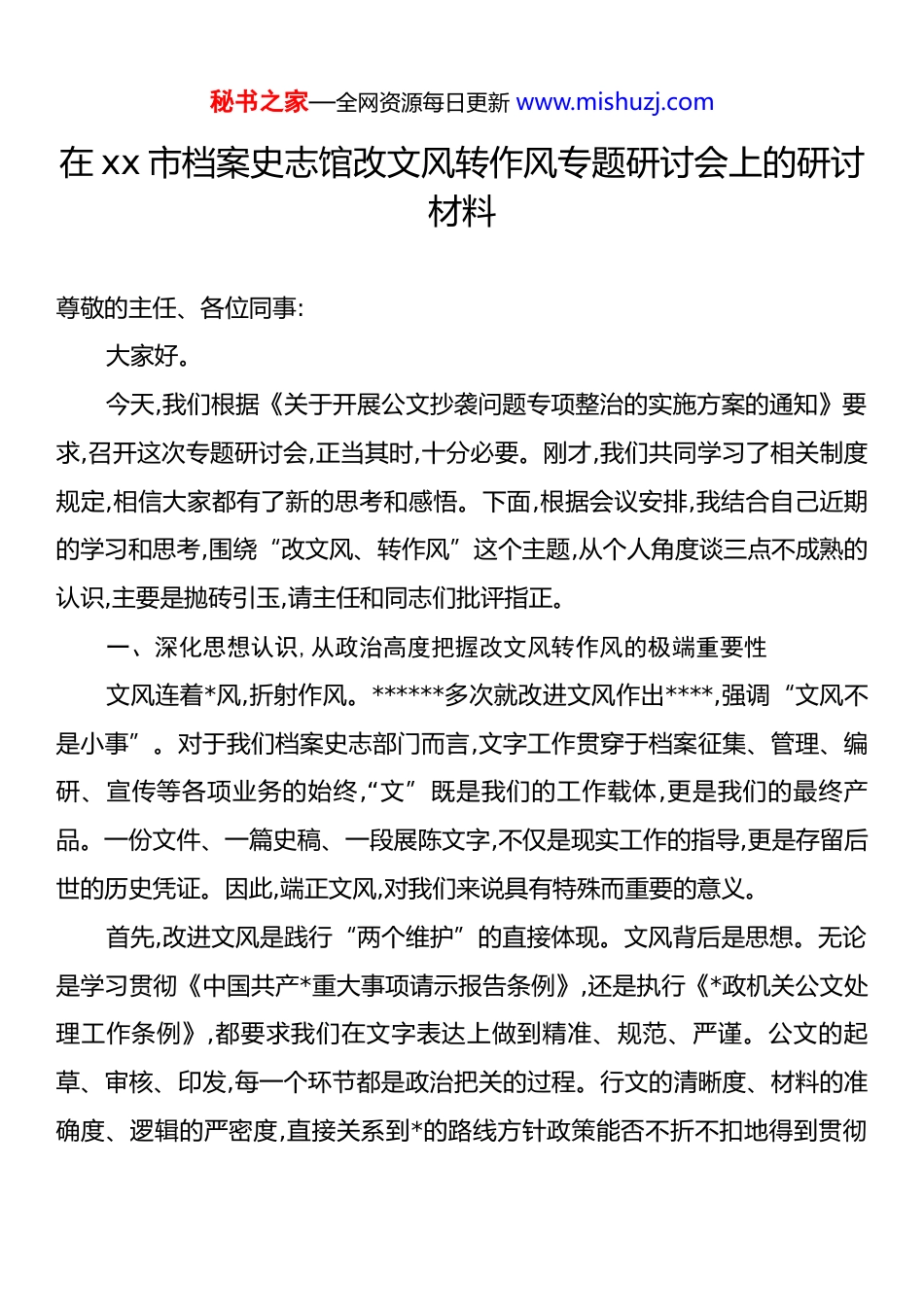 秘书之家—全网资源每日更新 www.mishuzj.com在 xx 市档案史志馆改文风转作风专题研讨会上的研讨材料尊敬的主任、各位同事:大家好。今天,我们根据《关于开展公文抄袭问题专项整治的实施方案的通知》要求,召开这次专题研讨会,正当其时,十分必要。刚才,我们共同学习了相关制度规定,相信大家都有了新的思考和感悟。下面,根据会议安排,我结合自己近期的学习和思考,围绕“改文风、转作风”这个主题,从个人角度谈三点不成熟的认识,主要是抛砖引玉,请主任和同志们批评指正。一、深化思想认识,从政治高度把握改文风转作风的极端重要性文风连着*风,折射作风。******多次就改进文风作出****,强调“文风不是小事”。对于我们档案史志部门而言,文字工作贯穿于档案征集、管理、编研、宣传等各项业务的始终,“文”既是我们的工作载体,更是我们的最终产品。一份文件、一篇史稿、一段展陈文字,不仅是现实工作的指导,更是存留后世的历史凭证。因此,端正文风,对我们来说具有特殊而重要的意义。首先,改进文风是践行“两个维护”的直接体现。文风背后是思想。无论是学习贯彻《中国共产*重大事项请示报告条例》,还是执行《*政机关公文处理工作条例》,都要求我们在文字表达上做到精准、规范、严谨。公文的起草、审核、印发,每一个环节都是政治把关的过程。行文的清晰度、材料的准确度、逻辑的严密度,直接关系到*的路线方针政策能否不折不扣地得到贯彻秘书之家—全网资源每日更新 www.mishuzj.com执行。一份含糊其辞、照搬照抄的公文,不仅会造成工作上的延误和偏差,从根子上说,更是政治站位不高、责任心不强的表现。其次,改进文风是力戒形式主义、为基层减负的内在要求。中央印发的《整治形式主义为基层减负若干规定》明确指向了文山会海等突出问题。而“假大空长”的不良文风,正是文山会海的重要推手。一篇几千字的工作总结,有效信息可能只有几百字;一份层层转发的通知,除了文头和落款,内容几乎原封不动。这种以形式主义应对形式主义的做法,耗费了大量行政资源,增加了基层不必要的负担,更损害了机关的公信力和执行力。正如 xx 县司法局在近期的研讨会上所强调的,“文风问题不仅仅是文字表达问题,更是思想作风、工作作风的体现”。我们必须清醒地认识到,不良文风是作风问题的“显性基因”,是必须下大力气根除的顽瘴痼疾。最后,改进文风是提升档案史志工作质量的根本保证。《规范地方*委政策性文件制定工作规定》要求文件内容要“务实管用”。对我们而言,无论是编纂地方志、撰写*史,还是开发档案文化产品,其最终目的都是“存史、育人、资政”。如果我们的研究成果充斥着空洞的理论、缺乏鲜活的史料,或者展览的文字说明晦涩难懂、缺乏吸引力,那么我们的工作价值就无从谈起。好的文风,应当是朴实、清新、生动的,能够用群众听得懂的语言,讲好 xx 的档案故事、历史故事,这才是我们档案史志工作者应有的文化自信和专业追求。二、坚持问题导向,深刻检视自身在文风作风方面存在的差距与不足对照上级要求和先进单位的做法,结合我们馆的实际情况,我认为成绩是主要的,但问题同样不容忽视。虽然根据内部工作统计,我们馆在过去一年中并未秘书之家—全网资源每日更新 www.mishuzj.com发现并正式处理过因“公文抄袭”而引发的案件或责任事件但这并不意味着我们可以高枕无忧。事实上,在全国范围内,公文抄袭、材料照搬等问题时有发生,一些单位甚至因此受到严肃处理。这种现象为我们敲响了警钟,促使我们必须以“见贤思齐、见不贤而内自省”的态度,深入查找自身可能存在的“亚健康”状态。我个人认为,以下几个方面的倾向性问题需要引起我们的高度警惕。第一,存在“思想懒惰、照搬照套”的现象。在撰写一些常规性、程序性的文件,如年度计划、工作总结、学习心得时,少数同志满足于当“二传手”和“文印员”。习惯于从网上下载模板,从上级文件中断章取义,从兄弟单位的材料中“借鉴”思路,甚至直接复制粘贴往年的内容,仅仅替换一下年份和个别数据。这种“拿来主义”看似提高了效率,实则回避了深入思考的责任。这样的文件,往往与我馆的年度重点工作、人员思想动态、业务发展瓶颈等实际情况相脱节,看似四平八稳,实则言之无...