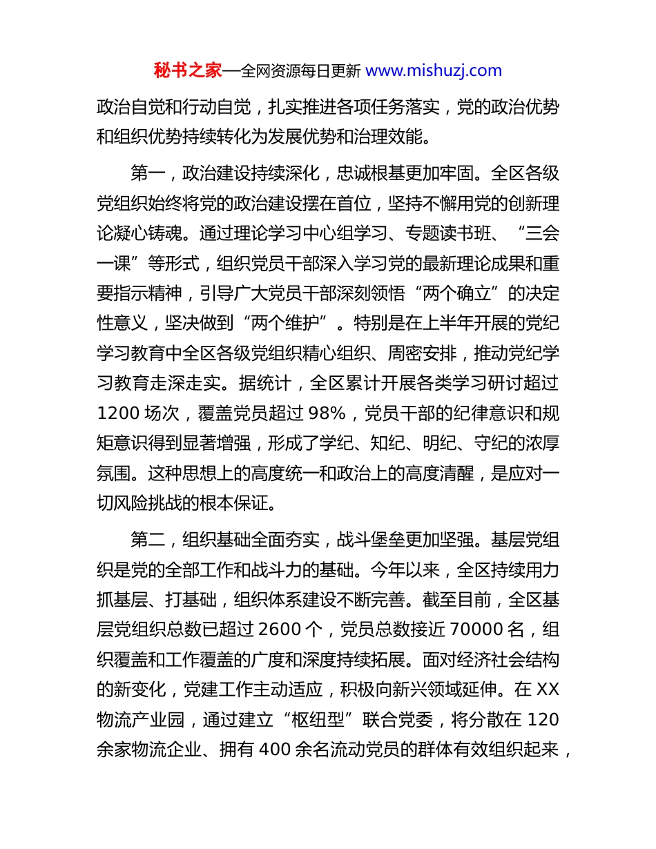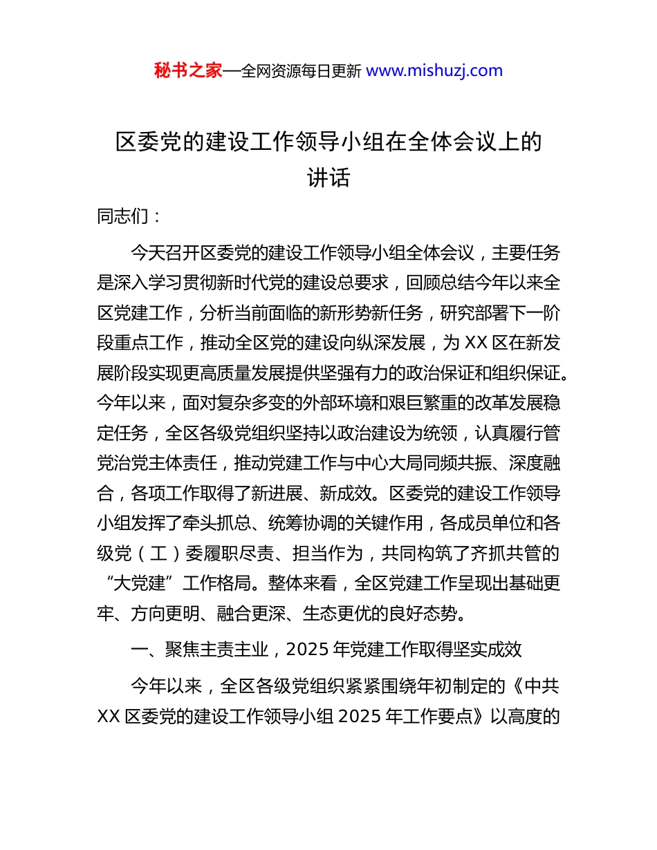 秘书之家—全网资源每日更新 www.mishuzj.com区委党的建设工作领导小组在全体会议上的讲话同志们:今天召开区委党的建设工作领导小组全体会议,主要任务是深入学习贯彻新时代党的建设总要求,回顾总结今年以来全区党建工作,分析当前面临的新形势新任务,研究部署下一阶段重点工作,推动全区党的建设向纵深发展,为 XX 区在新发展阶段实现更高质量发展提供坚强有力的政治保证和组织保证。今年以来,面对复杂多变的外部环境和艰巨繁重的改革发展稳定任务,全区各级党组织坚持以政治建设为统领,认真履行管党治党主体责任,推动党建工作与中心大局同频共振、深度融合,各项工作取得了新进展、新成效。区委党的建设工作领导小组发挥了牵头抓总、统筹协调的关键作用,各成员单位和各级党(工)委履职尽责、担当作为,共同构筑了齐抓共管的“大党建”工作格局。整体来看,全区党建工作呈现出基础更牢、方向更明、融合更深、生态更优的良好态势。一、聚焦主责主业,2025 年党建工作取得坚实成效今年以来,全区各级党组织紧紧围绕年初制定的《中共XX 区委党的建设工作领导小组 2025 年工作要点》以高度的秘书之家—全网资源每日更新 www.mishuzj.com政治自觉和行动自觉,扎实推进各项任务落实,党的政治优势和组织优势持续转化为发展优势和治理效能。第一,政治建设持续深化,忠诚根基更加牢固。全区各级党组织始终将党的政治建设摆在首位,坚持不懈用党的创新理论凝心铸魂。通过理论学习中心组学习、专题读书班、“三会一课”等形式,组织党员干部深入学习党的最新理论成果和重要指示精神,引导广大党员干部深刻领悟“两个确立”的决定性意义,坚决做到“两个维护”。特别是在上半年开展的党纪学习教育中全区各级党组织精心组织、周密安排,推动党纪学习教育走深走实。据统计,全区累计开展各类学习研讨超过1200 场次,覆盖党员超过 98%,党员干部的纪律意识和规矩意识得到显著增强,形成了学纪、知纪、明纪、守纪的浓厚氛围。这种思想上的高度统一和政治上的高度清醒,是应对一切风险挑战的根本保证。第二,组织基础全面夯实,战斗堡垒更加坚强。基层党组织是党的全部工作和战斗力的基础。今年以来,全区持续用力抓基层、打基础,组织体系建设不断完善。截至目前,全区基层党组织总数已超过 2600 个,党员总数接近 70000 名,组织覆盖和工作覆盖的广度和深度持续拓展。面对经济社会结构的新变化,党建工作主动适应,积极向新兴领域延伸。在 XX物流产业园,通过建立“枢纽型”联合党委,将分散在 120余家物流企业、拥有 400 余名流动党员的群体有效组织起来,秘书之家—全网资源每日更新 www.mishuzj.com解决了以往组织难覆盖、党员难管理、作用难发挥的问题,实现了党建引领下的行业规范和高效运转。在基层治理层面,“党建引领、多方参与”的模式不断深化。XX 街道 XX 社区针对老旧小区停车难、管理乱的问题,成立了由社区党委牵头,物业、业委会、党员楼门长、居民代表共同参与的“红色议事会”,通过民主协商,制定了小区停车管理公约,并划设了“党员先锋示范车位”,有效化解了困扰居民多年的矛盾。这些实践证明,把党的组织优势转化为治理效能,是破解基层治理难题的“金钥匙”。第三,干部队伍建设优化,担当精神更加彰显。事业成败关键在人。全区坚持新时代好干部标准,树立重实干、重实绩、重担当的鲜明用人导向。今年以来,共选派了 80 余名优秀年轻干部到招商引资、项目建设、信访维稳等一线岗位进行实践锻炼,让他们在急难险重任务中经风雨、见世面、壮筋骨。同时,干部教育培训的精准性和实效性不断提升。区委党校围绕XX 区发展战略,开设了“数字经济与产业升级”“城市精细化治理”等专题培训班,累计培训干部超过 3000 人次,总时长超过 15 万学时。通过系统化的培养和锻炼,一批想干事、能干事、干成事的干部脱颖而出,全区干部队伍的专业能力和综合素质得到整体提升,干事创业的精气神更加饱满。第四,党建业务深度融合,引领作用更加凸显。党建工作如果脱离了中心工作,就会成为“无源之水、无本之木”。今秘书之家—全网资源每日更新...