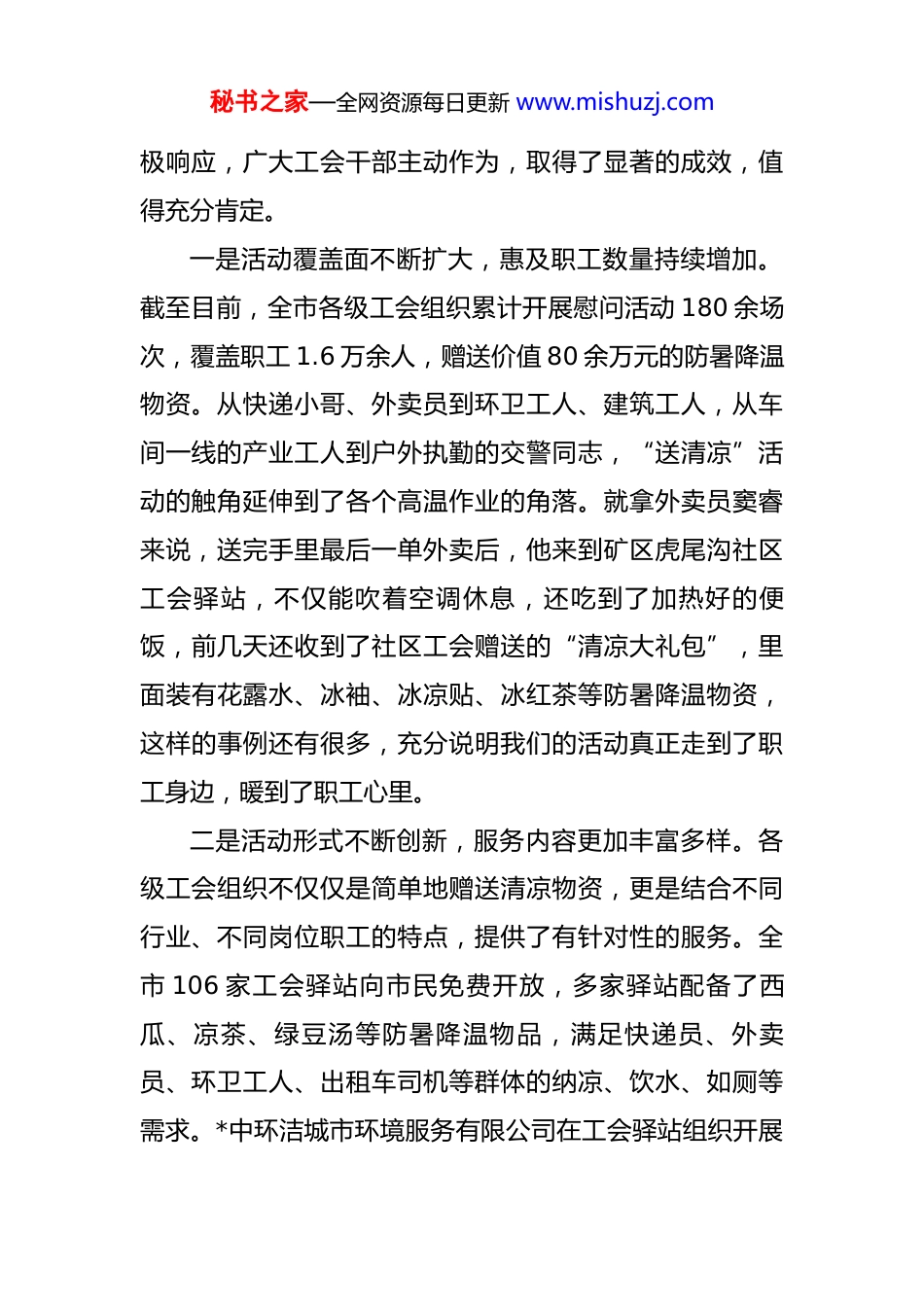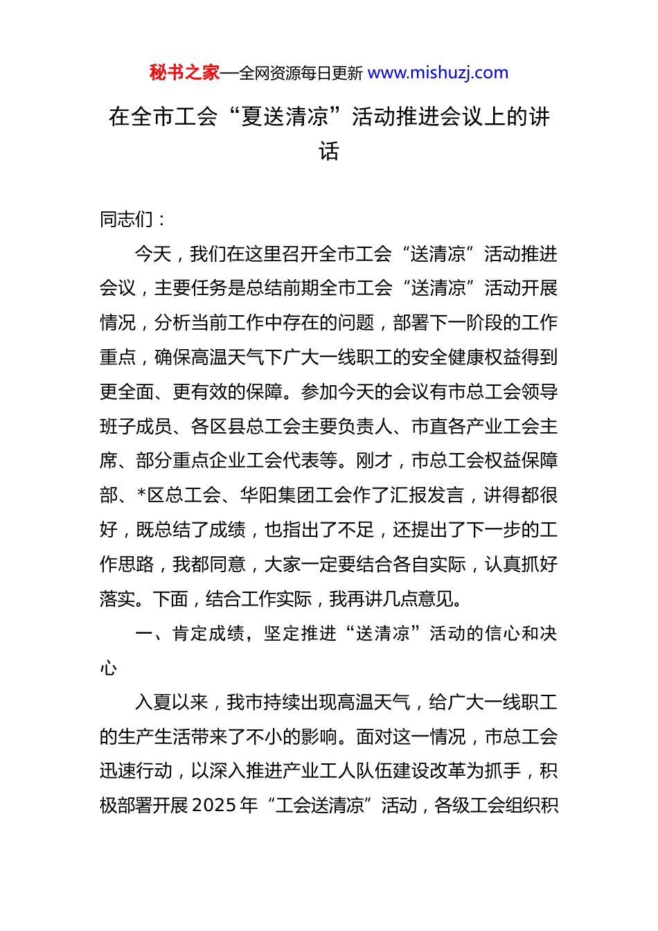 秘书之家—全网资源每日更新 www.mishuzj.com在全市工会“夏送清凉”活动推进会议上的讲话 同志们:今天,我们在这里召开全市工会“送清凉”活动推进会议,主要任务是总结前期全市工会“送清凉”活动开展情况,分析当前工作中存在的问题,部署下一阶段的工作重点,确保高温天气下广大一线职工的安全健康权益得到更全面、更有效的保障。参加今天的会议有市总工会领导班子成员、各区县总工会主要负责人、市直各产业工会主席、部分重点企业工会代表等。刚才,市总工会权益保障部、*区总工会、华阳集团工会作了汇报发言,讲得都很好,既总结了成绩,也指出了不足,还提出了下一步的工作思路,我都同意,大家一定要结合各自实际,认真抓好落实。下面,结合工作实际,我再讲几点意见。一、肯定成绩,坚定推进“送清凉”活动的信心和决心入夏以来,我市持续出现高温天气,给广大一线职工的生产生活带来了不小的影响。面对这一情况,市总工会迅速行动,以深入推进产业工人队伍建设改革为抓手,积极部署开展 2025 年“工会送清凉”活动,各级工会组织积秘书之家—全网资源每日更新 www.mishuzj.com极响应,广大工会干部主动作为,取得了显著的成效,值得充分肯定。一是活动覆盖面不断扩大,惠及职工数量持续增加。截至目前,全市各级工会组织累计开展慰问活动 180 余场次,覆盖职工 1.6 万余人,赠送价值 80 余万元的防暑降温物资。从快递小哥、外卖员到环卫工人、建筑工人,从车间一线的产业工人到户外执勤的交警同志,“送清凉”活动的触角延伸到了各个高温作业的角落。就拿外卖员窦睿来说,送完手里最后一单外卖后,他来到矿区虎尾沟社区工会驿站,不仅能吹着空调休息,还吃到了加热好的便饭,前几天还收到了社区工会赠送的“清凉大礼包”,里面装有花露水、冰袖、冰凉贴、冰红茶等防暑降温物资,这样的事例还有很多,充分说明我们的活动真正走到了职工身边,暖到了职工心里。二是活动形式不断创新,服务内容更加丰富多样。各级工会组织不仅仅是简单地赠送清凉物资,更是结合不同行业、不同岗位职工的特点,提供了有针对性的服务。全市 106 家工会驿站向市民免费开放,多家驿站配备了西瓜、凉茶、绿豆汤等防暑降温物品,满足快递员、外卖员、环卫工人、出租车司机等群体的纳凉、饮水、如厕等需求。*中环洁城市环境服务有限公司在工会驿站组织开展秘书之家—全网资源每日更新 www.mishuzj.com了“夏送清凉、情系职工”慰问活动,为环卫工人发放了纯净水、绿豆、白糖、藿香正气口服液、人丹、速效救心丸等防暑物品和急救药品,还准备了云南白药气雾剂、创可贴、碘伏、酒精、绷带等常用的外用药品,以备不时之需;华阳集团运输分公司工会的工作人员在工会驿站为户外劳动者发放“清凉包”,同时叮嘱大家注意做好防暑防晒措施、保证合理饮食和充足睡眠、注意交通安全;矿区蔡洼街道新源社区工会工作人员和志愿者兵分多路,到环卫工人作业点、保安执勤点、快递站点、交警执勤岗亭等地,为户外劳动者送上了精心熬煮的清凉绿豆汤。这些多样化的服务形式,让职工们感受到了工会“娘家人”的贴心和温暖。三是活动成效初步显现,职工队伍更加和谐稳定。通过“送清凉”活动,广大一线职工在炎热的夏季感受到了丝丝清凉,工作热情得到了进一步激发。正如在工地干活的刘师傅所说:“这一份份清凉‘大礼包’,饱含市委、市政府和工会组织的关怀,我们享受着清凉厚爱,干活儿更来劲啦!”同时,活动的开展也进一步密切了工会组织与职工群众的联系,增强了工会组织的凝聚力和向心力,为全市职工队伍的和谐稳定奠定了坚实的基础。在高温天气下,全市没有发生一起因防暑降温工作不到位引发的重秘书之家—全网资源每日更新 www.mishuzj.com大安全事故,职工的出勤率和工作效率也得到了有效保障,这与我们“送清凉”活动的深入开展是分不开的。二、正视问题,清醒认识“送清凉”活动中存在的不足在肯定成绩的同时,我们也要清醒地认识到,当前“送清凉”活动开展过程中还存在一些问题和不足,需要我们高度重视并认真加以解决。一是部分地区和单位思想认识不到位,活动开展不够积极主动。有些区...