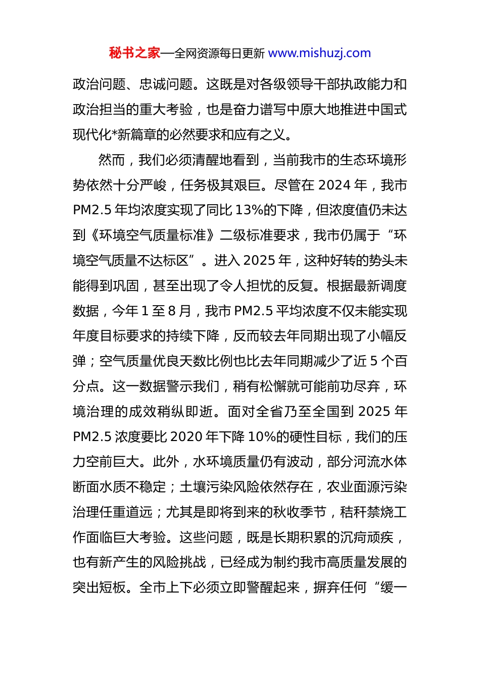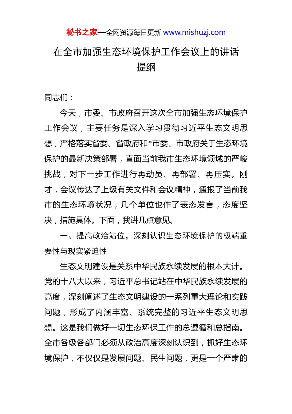 秘书之家—全网资源每日更新 www.mishuzj.com在全市加强生态环境保护工作会议上的讲话提纲 同志们:今天,市委、市政府召开这次全市加强生态环境保护工作会议,主要任务是深入学习贯彻习近平生态文明思想,严格落实省委、省政府和*市委、市政府关于生态环境保护的最新决策部署,直面当前我市生态环境领域的严峻挑战,对下一步工作进行再动员、再部署、再压实。刚才,会议传达了上级有关文件和会议精神,通报了当前我市的生态环境状况,几个单位也作了表态发言,态度坚决,措施具体。下面,我讲几点意见。一、提高政治站位,深刻认识生态环境保护的极端重要性与现实紧迫性生态文明建设是关系中华民族永续发展的根本大计。党的十八大以来,习近平总书记站在中华民族永续发展的高度,深刻阐述了生态文明建设的一系列重大理论和实践问题,形成了内涵丰富、系统完整的习近平生态文明思想。这是我们做好一切生态环保工作的总遵循和总指南。全市各级各部门必须从政治高度深刻认识到,抓好生态环境保护,不仅仅是发展问题、民生问题,更是一个严肃的秘书之家—全网资源每日更新 www.mishuzj.com政治问题、忠诚问题。这既是对各级领导干部执政能力和政治担当的重大考验,也是奋力谱写中原大地推进中国式现代化*新篇章的必然要求和应有之义。然而,我们必须清醒地看到,当前我市的生态环境形势依然十分严峻,任务极其艰巨。尽管在 2024 年,我市PM2.5 年均浓度实现了同比 13%的下降,但浓度值仍未达到《环境空气质量标准》二级标准要求,我市仍属于“环境空气质量不达标区”。进入 2025 年,这种好转的势头未能得到巩固,甚至出现了令人担忧的反复。根据最新调度数据,今年 1 至 8 月,我市 PM2.5 平均浓度不仅未能实现年度目标要求的持续下降,反而较去年同期出现了小幅反弹;空气质量优良天数比例也比去年同期减少了近 5 个百分点。这一数据警示我们,稍有松懈就可能前功尽弃,环境治理的成效稍纵即逝。面对全省乃至全国到 2025 年PM2.5 浓度要比 2020 年下降 10%的硬性目标,我们的压力空前巨大。此外,水环境质量仍有波动,部分河流水体断面水质不稳定;土壤污染风险依然存在,农业面源污染治理任重道远;尤其是即将到来的秋收季节,秸秆禁烧工作面临巨大考验。这些问题,既是长期积累的沉疴顽疾,也有新产生的风险挑战,已经成为制约我市高质量发展的突出短板。全市上下必须立即警醒起来,摒弃任何“缓一秘书之家—全网资源每日更新 www.mishuzj.com缓、歇一歇”的错误思想,以“退无可退、背水一战”的决心,以“时时放心不下”的责任感,坚决打好这场污染防治的攻坚战、翻身仗。二、聚焦短板弱项,以雷霆之势坚决打好污染防治三大攻坚战问题是时代的声音,也是工作的导向。必须坚持问题导向,靶向发力,标本兼治,集中力量打好蓝天、碧水、净土三大保卫战,推动生态环境质量实现根本性好转。第一,坚决打赢蓝天保卫战,推动空气质量根本好转。大气污染是当前群众感受最直接、反映最强烈的问题。必须拿出超常决心和过硬措施,全力守护*的蓝天白云。一要严控工业源头。对全市重点涉气企业实行清单化、台账式管理,确保污染防治设施稳定运行、达标排放。生态环境部门要加大执法检查频次,对超标排放、偷排漏排等违法行为,必须依法顶格处罚,公开曝光,形成强大震慑。二要严管扬尘污染。住建、城管、交通等部门要各负其责,严格落实建筑工地“六个百分之百”要求,加强对渣土运输车辆的全过程监管,加大城市道路的机械化清扫和洒水降尘频次,确保将扬尘污染降到最低。三要共治移动源污染。公安、交通、生态环境等部门要协同作战,加强对高排放老旧车辆的淘汰和限行管控,积极推广秘书之家—全网资源每日更新 www.mishuzj.com应用新能源汽车,优化城市交通组织,减少拥堵造成的尾气排放。第二,深入打好碧水保卫战,实现水环境质量稳定提升。水是生命之源、生态之基。必须牢固树立“人水和谐”的理念,严格落实“查、治、洗、修、提”治水五字诀,确保一泓清水永续长流。要全面落实“河长制”,各级河长要真正做到守河有责、守河担责、守河尽责。在“查”字上下...