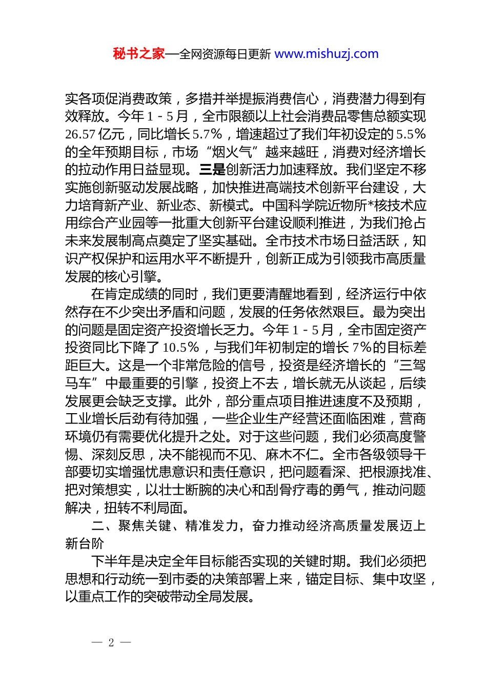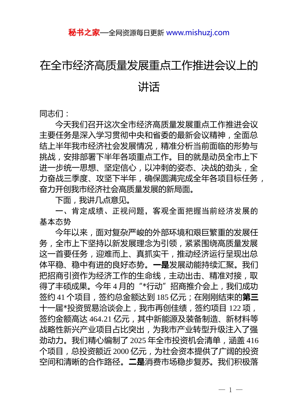 秘书之家—全网资源每日更新 www.mishuzj.com在全市经济高质量发展重点工作推进会议上的讲话同志们:今天我们召开这次全市经济高质量发展重点工作推进会议主要任务是深入学习贯彻中央和省委的最新会议精神,全面总结上半年我市经济社会发展情况,精准分析当前面临的形势与挑战,安排部署下半年各项重点工作。目的就是动员全市上下进一步统一思想、坚定信心,以冲刺的姿态、决战的劲头,全力奋战三季度、攻坚下半年,确保圆满完成全年各项目标任务,奋力开创我市经济社会高质量发展的新局面。下面,我讲几点意见。一、肯定成绩、正视问题,客观全面把握当前经济发展的基本态势今年以来,面对复杂严峻的外部环境和艰巨繁重的发展任务,全市上下坚持以新发展理念为引领,紧紧围绕高质量发展这一首要任务,迎难而上、真抓实干,推动经济运行呈现出总体平稳、稳中有进的良好态势。一是发展动能持续汇聚。我们把招商引资作为经济工作的生命线,主动出击、精准对接,取得了丰硕成果。今年 4 月的“*行动”招商推介会上,我们成功签约 41 个项目,签约总金额达到 185 亿元;在刚刚结束的第三十一届*投资贸易洽谈会上,我市再创佳绩,签约项目 122 项,签约金额高达 464.21 亿元,其中新能源及装备制造、新材料等战略性新兴产业项目占比突出,为我市产业转型升级注入了强劲动力。我们精心编制了 2025 年全市投资机会清单,涵盖 416个项目,总投资额近 2000 亿元,为社会资本提供了广阔的投资空间和清晰的合作路径。二是消费市场稳步复苏。我们积极落— 1 —秘书之家—全网资源每日更新 www.mishuzj.com实各项促消费政策,多措并举提振消费信心,消费潜力得到有效释放。今年 1-5 月,全市限额以上社会消费品零售总额实现26.57 亿元,同比增长 5.7%,增速超过了我们年初设定的 5.5%的全年预期目标,市场“烟火气”越来越旺,消费对经济增长的拉动作用日益显现。三是创新活力加速释放。我们坚定不移实施创新驱动发展战略,加快推进高端技术创新平台建设,大力培育新产业、新业态、新模式。中国科学院近物所*核技术应用综合产业园等一批重大创新平台建设顺利推进,为我们抢占未来发展制高点奠定了坚实基础。全市技术市场日益活跃,知识产权保护和运用水平不断提升,创新正成为引领我市高质量发展的核心引擎。在肯定成绩的同时,我们更要清醒地看到,经济运行中依然存在不少突出矛盾和问题,发展的任务依然艰巨。最为突出的问题是固定资产投资增长乏力。今年 1-5 月,全市固定资产投资同比下降了 10.5%,与我们年初制定的增长 7%的目标差距巨大。这是一个非常危险的信号,投资是经济增长的“三驾马车”中最重要的引擎,投资上不去,增长就无从谈起,后续发展更会缺乏支撑。此外,部分重点项目推进速度不及预期,工业增长后劲有待加强,一些企业生产经营还面临困难,营商环境仍有需要优化提升之处。对于这些问题,我们必须高度警惕、深刻反思,决不能视而不见、麻木不仁。全市各级领导干部要切实增强忧患意识和责任意识,把问题看深、把根源找准、把对策想实,以壮士断腕的决心和刮骨疗毒的勇气,推动问题解决,扭转不利局面。二、聚焦关键、精准发力,奋力推动经济高质量发展迈上新台阶下半年是决定全年目标能否实现的关键时期。我们必须把思想和行动统一到市委的决策部署上来,锚定目标、集中攻坚,以重点工作的突破带动全局发展。— 2 —秘书之家—全网资源每日更新 www.mishuzj.com第一,坚持项目为王,在扩大有效投资上实现新突破。扭转投资下滑的被动局面,是当前经济工作的重中之重、当务之急。全市上下必须牢固树立“项目是第一支撑”的理念,一切围绕项目转、一切盯着项目干。一要全力以赴抓项目谋划。项目储备决定着发展后劲。不能只看到眼前的项目,更要系统谋划长远。要紧密对接国家宏观政策和产业导向,围绕新能源、新材料、数字经济、现代农业等重点领域,高标准、高质量地谋划储备一批打基础、利长远、增后劲的重大项目。我们发布的近 2000 亿元投资机会清单,不是摆在纸面上的数字,而是需要各县区、各部门逐项分解、精准对接的“任务书”...