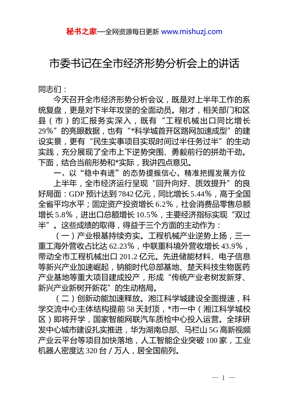 秘书之家—全网资源每日更新 www.mishuzj.com市委书记在全市经济形势分析会上的讲话同志们:今天召开全市经济形势分析会议,既是对上半年工作的系统复盘,更是对下半年攻坚的全面动员。刚才,相关部门和区县(市)的汇报务实深入,既有“工程机械出口同比增长29%”的亮眼数据,也有“*科学城首开区路网加速成型”的建设实景,更有“民生实事项目实现时间过半任务过半”的生动实践,充分展现了全市上下逆势突围、勇毅前行的拼劲干劲。下面,结合当前形势和*实际,我讲四点意见。一、以“稳中有进”的态势提振信心,精准把握发展方位上半年,全市经济运行呈现“回升向好、质效提升”的良好局面:GDP 预计达到 7842 亿元,同比增长 5.44%,高于全国全省平均水平;固定资产投资增长 6.2%,社会消费品零售总额增长 5.8%,进出口总额增长 10.5%,主要经济指标实现“双过半”。这些成绩的取得,得益于三个方面的主动作为:(一)产业根基持续夯实。工程机械产业逆势上扬,三一重工海外营收占比达 62.23%,中联重科境外营收增长 43.9%,带动全市工程机械出口 201.2 亿元。先进储能材料、电子信息等新兴产业加速崛起,钠能时代总部基地、楚天科技生物医药产业基地等重大项目建成投产,形成“传统产业老树发新芽、新兴产业新树开新花”的生动格局。(二)创新动能加速释放。湘江科学城建设全面提速,科学交流中心主体结构提前 58 天封顶,*市一中(湘江科学城校区)即将开学,国家智能网联汽车质检中心投入运营。全球研发中心城市建设扎实推进,华为湖南总部、马栏山 5G 高新视频产业云平台等项目加快落地,人工智能企业突破 100 家,工业机器人密度达 320 台/万人,居全国前列。— 1 —秘书之家—全网资源每日更新 www.mishuzj.com(三)民生福祉不断增进。十大重点民生实事有序推进,新增基础教育学位 5.2 万个、社区普惠托育服务点 28 家,完成城镇燃气“瓶改管”35 个小区,建成智慧社区健身中心 48 个。城市更新三年行动全面启动,70 个示范项目惠及 41.3 万户居民,老旧小区改造、背街小巷提质等工程让城市更有温度。在肯定成绩的同时,我们也要清醒看到:部分行业复苏乏力,消费市场尚未完全回暖;要素制约依然突出,土地、资金等资源配置效率有待提升;风险隐患不容忽视,安全生产、债务化解等任务艰巨。这些问题必须引起高度重视,在下半年工作中靶向施策、精准破解。二、以“精准发力”的举措攻坚突破,全面夯实发展根基当前,经济运行正处于“爬坡过坎”的关键阶段。我们要紧扣“做优增量、盘活存量、提升质量”主线,重点抓好五个方面工作:(一)聚焦产业升级,筑牢实体经济根基。一是做强先进制造业集群。深入实施“产业质效倍增年”行动,推动工程机械向“智能化、绿色化、服务化”转型,支持三一重工、中联重科等龙头企业拓展海外市场,力争全年出口突破 500 亿元。加快建设全球研发中心城市,依托湘江科学城、岳麓山大学科技城等平台,推动人工智能、量子科技等前沿技术与制造业深度融合,培育 3-5 个国家级产业创新中心。二是做优现代服务业。大力发展生产性服务业,加快建设国家物流枢纽城市,推进金霞保税物流中心、传化智联等项目建设,打造“通道+枢纽+网络”现代物流体系。积极培育生活性服务业,办好“*十二时辰”消费 IP 活动,推出新能源汽车购车补贴、家电以旧换新等政策,力争社会消费品零售总额增长 7%以上。三是做实数字经济。深入实施“智赋万企”行动,推进中小企业数字化转型试点,力争全年新增上云企业 1 万家、上平台企业 500 家。加快建设马栏山视频文创产业园,支持华为湖南总部、中广天— 2 —秘书之家—全网资源每日更新 www.mishuzj.com择总部基地等项目建设,打造“中国 V 谷”核心引擎。(二)聚焦扩大内需,增强经济发展动能。一是精准扩大有效投资。扎实推进“五个十大”项目建设,确保 638 个市重点项目全年完成投资 2366 亿元以上。突出抓好产业链招商,瞄准“三类 500 强”企业和“专精特新”小巨人企业,力争引进项目 150 个以上、总投资超 2000 亿元。强化要素保...