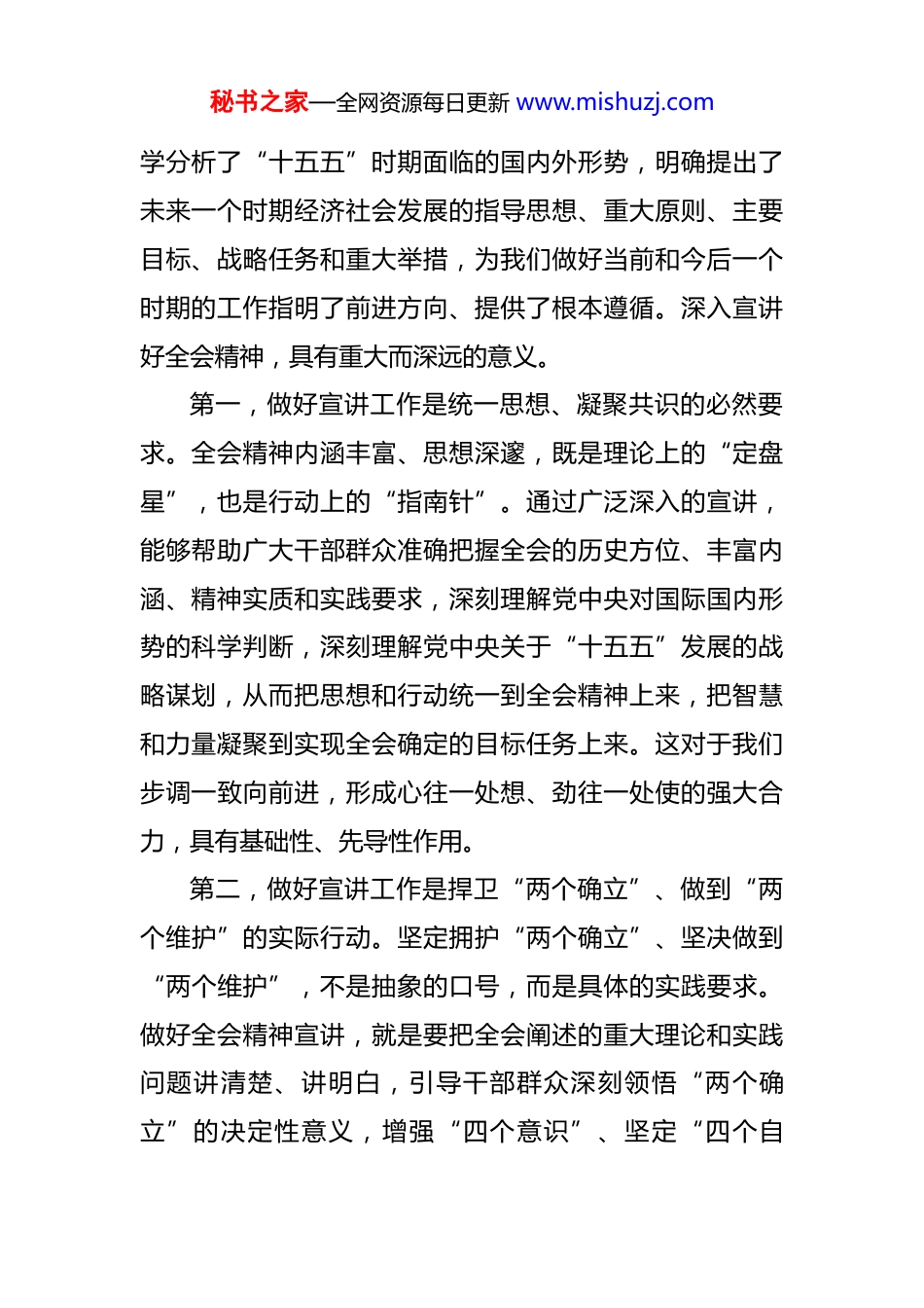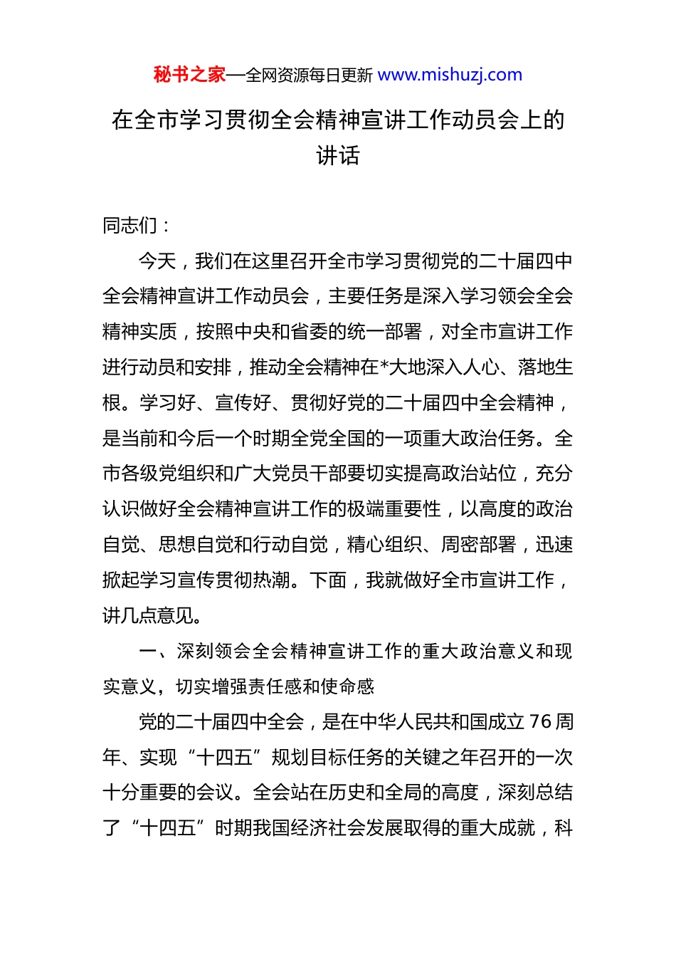 秘书之家—全网资源每日更新 www.mishuzj.com在全市学习贯彻全会精神宣讲工作动员会上的讲话 同志们:今天,我们在这里召开全市学习贯彻党的二十届四中全会精神宣讲工作动员会,主要任务是深入学习领会全会精神实质,按照中央和省委的统一部署,对全市宣讲工作进行动员和安排,推动全会精神在*大地深入人心、落地生根。学习好、宣传好、贯彻好党的二十届四中全会精神,是当前和今后一个时期全党全国的一项重大政治任务。全市各级党组织和广大党员干部要切实提高政治站位,充分认识做好全会精神宣讲工作的极端重要性,以高度的政治自觉、思想自觉和行动自觉,精心组织、周密部署,迅速掀起学习宣传贯彻热潮。下面,我就做好全市宣讲工作,讲几点意见。一、深刻领会全会精神宣讲工作的重大政治意义和现实意义,切实增强责任感和使命感党的二十届四中全会,是在中华人民共和国成立 76 周年、实现“十四五”规划目标任务的关键之年召开的一次十分重要的会议。全会站在历史和全局的高度,深刻总结了“十四五”时期我国经济社会发展取得的重大成就,科秘书之家—全网资源每日更新 www.mishuzj.com学分析了“十五五”时期面临的国内外形势,明确提出了未来一个时期经济社会发展的指导思想、重大原则、主要目标、战略任务和重大举措,为我们做好当前和今后一个时期的工作指明了前进方向、提供了根本遵循。深入宣讲好全会精神,具有重大而深远的意义。第一,做好宣讲工作是统一思想、凝聚共识的必然要求。全会精神内涵丰富、思想深邃,既是理论上的“定盘星”,也是行动上的“指南针”。通过广泛深入的宣讲,能够帮助广大干部群众准确把握全会的历史方位、丰富内涵、精神实质和实践要求,深刻理解党中央对国际国内形势的科学判断,深刻理解党中央关于“十五五”发展的战略谋划,从而把思想和行动统一到全会精神上来,把智慧和力量凝聚到实现全会确定的目标任务上来。这对于我们步调一致向前进,形成心往一处想、劲往一处使的强大合力,具有基础性、先导性作用。第二,做好宣讲工作是捍卫“两个确立”、做到“两个维护”的实际行动。坚定拥护“两个确立”、坚决做到“两个维护”,不是抽象的口号,而是具体的实践要求。做好全会精神宣讲,就是要把全会阐述的重大理论和实践问题讲清楚、讲明白,引导干部群众深刻领悟“两个确立”的决定性意义,增强“四个意识”、坚定“四个自秘书之家—全网资源每日更新 www.mishuzj.com信”、做到“两个维护”,始终在思想上政治上行动上同以习近平同志为核心的党中央保持高度一致。这是对我们政治判断力、政治领悟力、政治执行力的直接检验,是必须完成好的重大政治任务。第三,做好宣讲工作是推动*市高质量发展、实现“三个努力成为”的迫切需要。当前,*市正处于转型升级、爬坡过坎的关键时期,改革发展稳定任务艰巨繁重。党的二十届四中全会精神,蕴含着破解发展难题、厚植发展优势的“金钥匙”。开展好宣讲工作,就是要引导全市上下紧密结合*市经济社会发展新形势新要求,紧密结合各自思想和工作实际,用全会精神审视市情、谋划发展、指导工作,切实把学习成果转化为谋划工作的思路、破解难题的办法、推动发展的实际成效,为加快实现“三个努力成为”、奋力谱写*大地推进中国式现代化新篇章注入强大的精神动力。二、全面准确把握全会精神的核心要义,确保宣讲工作高起点、高标准、高质量宣讲好全会精神,前提是学深悟透、融会贯通。要原原本本学习全会文件,全面系统掌握其丰富内涵和核心要义,着力在七个方面下功夫,确保把全会精神讲准确、讲全面、讲透彻。秘书之家—全网资源每日更新 www.mishuzj.com第一,要讲清楚“十四五”时期我国和我市发展取得的重大成就。回望“十四五”,党和国家事业取得历史性成就、发生历史性变革。从全国看,经济实力、科技实力、综合国力跃上新的大台阶,经济运行总体平稳,经济结构持续优化,预计 2025 年国内生产总值将突破 130 万亿元。*市同全国全省一样,也取得了令人鼓舞的发展成就。经济总量跨越新台阶,预计 2025 年地区生产总值年均增长保持在 7.5%以上,综合实力显著增强。产业结构持续优化...