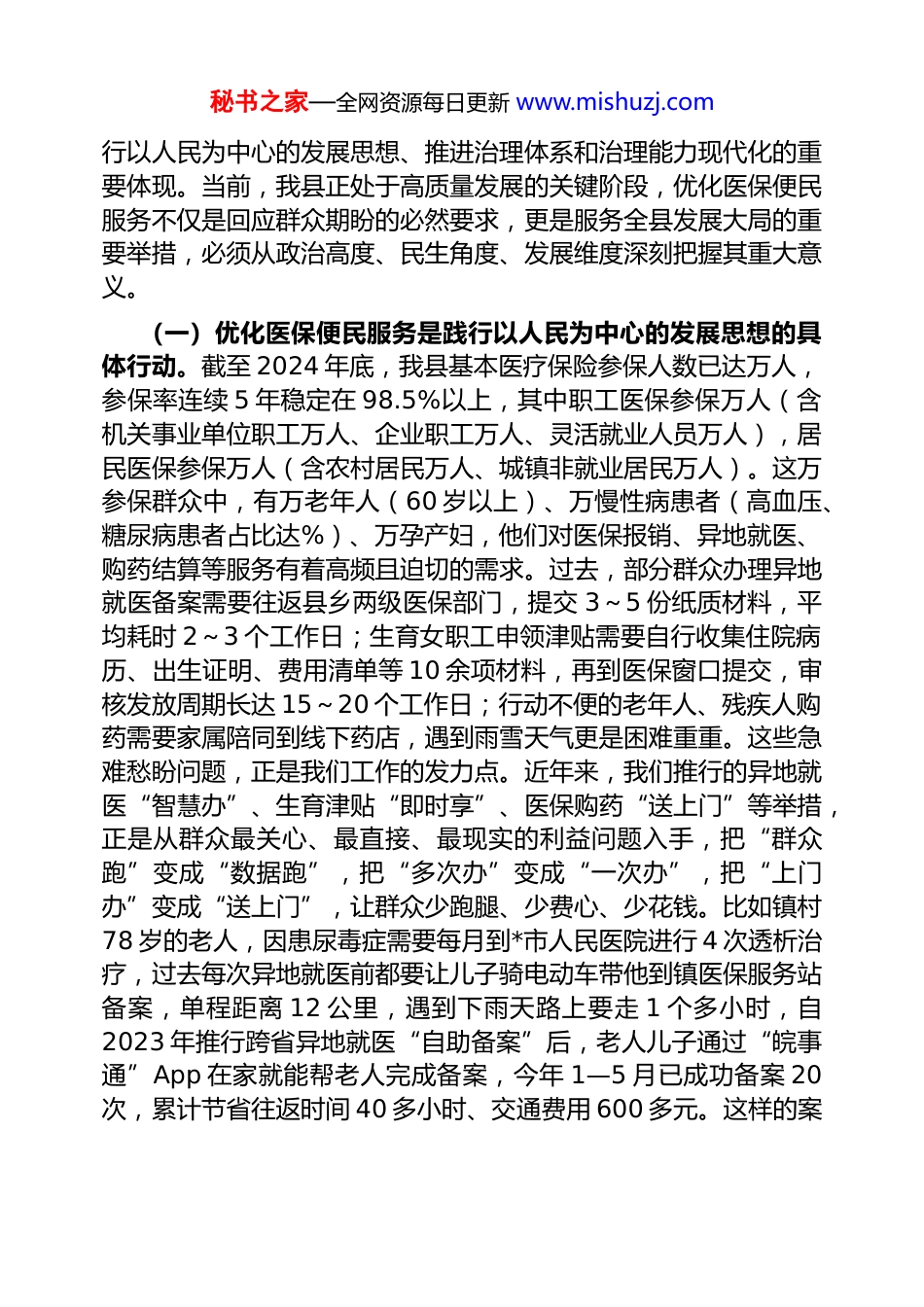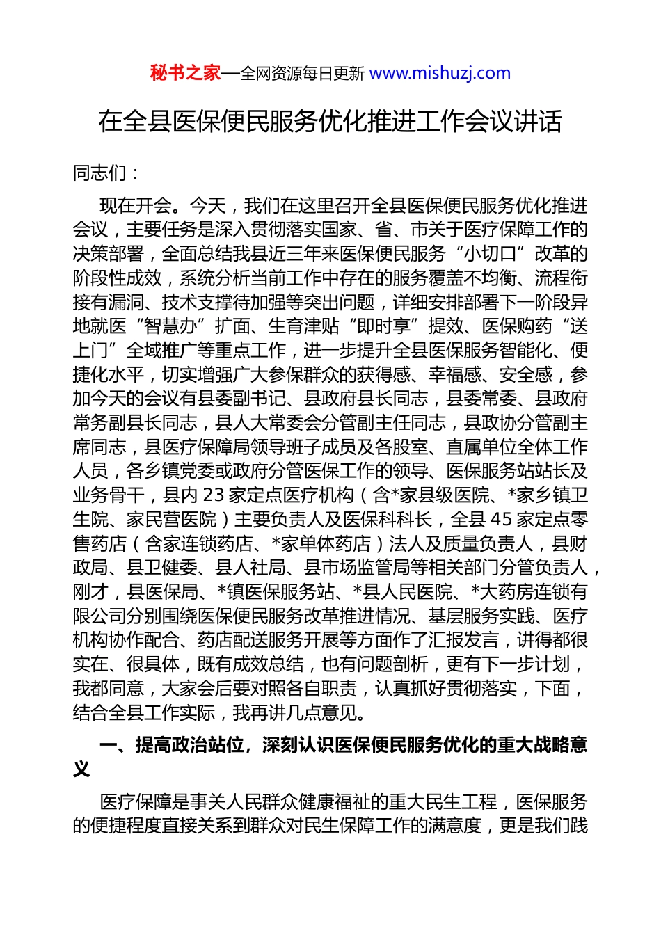 秘书之家—全网资源每日更新 www.mishuzj.com在全县医保便民服务优化推进工作会议讲话同志们:现在开会。今天,我们在这里召开全县医保便民服务优化推进会议,主要任务是深入贯彻落实国家、省、市关于医疗保障工作的决策部署,全面总结我县近三年来医保便民服务“小切口”改革的阶段性成效,系统分析当前工作中存在的服务覆盖不均衡、流程衔接有漏洞、技术支撑待加强等突出问题,详细安排部署下一阶段异地就医“智慧办”扩面、生育津贴“即时享”提效、医保购药“送上门”全域推广等重点工作,进一步提升全县医保服务智能化、便捷化水平,切实增强广大参保群众的获得感、幸福感、安全感,参加今天的会议有县委副书记、县政府县长同志,县委常委、县政府常务副县长同志,县人大常委会分管副主任同志,县政协分管副主席同志,县医疗保障局领导班子成员及各股室、直属单位全体工作人员,各乡镇党委或政府分管医保工作的领导、医保服务站站长及业务骨干,县内 23 家定点医疗机构(含*家县级医院、*家乡镇卫生院、家民营医院)主要负责人及医保科科长,全县 45 家定点零售药店(含家连锁药店、*家单体药店)法人及质量负责人,县财政局、县卫健委、县人社局、县市场监管局等相关部门分管负责人,刚才,县医保局、*镇医保服务站、*县人民医院、*大药房连锁有限公司分别围绕医保便民服务改革推进情况、基层服务实践、医疗机构协作配合、药店配送服务开展等方面作了汇报发言,讲得都很实在、很具体,既有成效总结,也有问题剖析,更有下一步计划,我都同意,大家会后要对照各自职责,认真抓好贯彻落实,下面,结合全县工作实际,我再讲几点意见。一、提高政治站位,深刻认识医保便民服务优化的重大战略意义医疗保障是事关人民群众健康福祉的重大民生工程,医保服务的便捷程度直接关系到群众对民生保障工作的满意度,更是我们践秘书之家—全网资源每日更新 www.mishuzj.com行以人民为中心的发展思想、推进治理体系和治理能力现代化的重要体现。当前,我县正处于高质量发展的关键阶段,优化医保便民服务不仅是回应群众期盼的必然要求,更是服务全县发展大局的重要举措,必须从政治高度、民生角度、发展维度深刻把握其重大意义。(一)优化医保便民服务是践行以人民为中心的发展思想的具体行动。截至 2024 年底,我县基本医疗保险参保人数已达万人,参保率连续 5 年稳定在 98.5%以上,其中职工医保参保万人(含机关事业单位职工万人、企业职工万人、灵活就业人员万人),居民医保参保万人(含农村居民万人、城镇非就业居民万人)。这万参保群众中,有万老年人(60 岁以上)、万慢性病患者(高血压、糖尿病患者占比达%)、万孕产妇,他们对医保报销、异地就医、购药结算等服务有着高频且迫切的需求。过去,部分群众办理异地就医备案需要往返县乡两级医保部门,提交 3~5 份纸质材料,平均耗时 2~3 个工作日;生育女职工申领津贴需要自行收集住院病历、出生证明、费用清单等 10 余项材料,再到医保窗口提交,审核发放周期长达 15~20 个工作日;行动不便的老年人、残疾人购药需要家属陪同到线下药店,遇到雨雪天气更是困难重重。这些急难愁盼问题,正是我们工作的发力点。近年来,我们推行的异地就医“智慧办”、生育津贴“即时享”、医保购药“送上门”等举措,正是从群众最关心、最直接、最现实的利益问题入手,把“群众跑”变成“数据跑”,把“多次办”变成“一次办”,把“上门办”变成“送上门”,让群众少跑腿、少费心、少花钱。比如镇村78 岁的老人,因患尿毒症需要每月到*市人民医院进行 4 次透析治疗,过去每次异地就医前都要让儿子骑电动车带他到镇医保服务站备案,单程距离 12 公里,遇到下雨天路上要走 1 个多小时,自2023 年推行跨省异地就医“自助备案”后,老人儿子通过“皖事通”App 在家就能帮老人完成备案,今年 1—5 月已成功备案 20次,累计节省往返时间 40 多小时、交通费用 600 多元。这样的案秘书之家—全网资源每日更新 www.mishuzj.com例还有很多,充分证明优化医保便民服务就是把以人民为中心的发展思想落到了实处,必须持续...