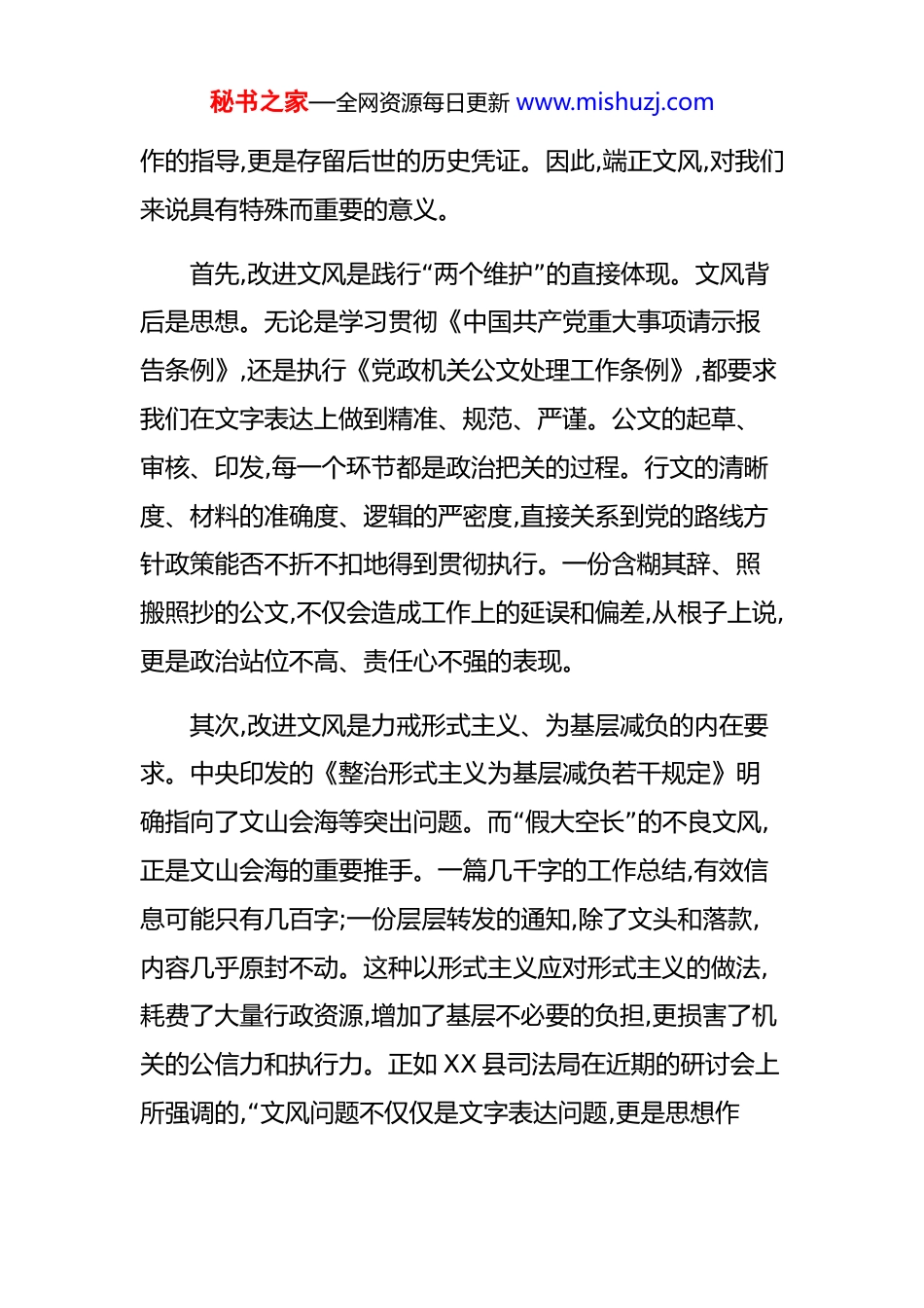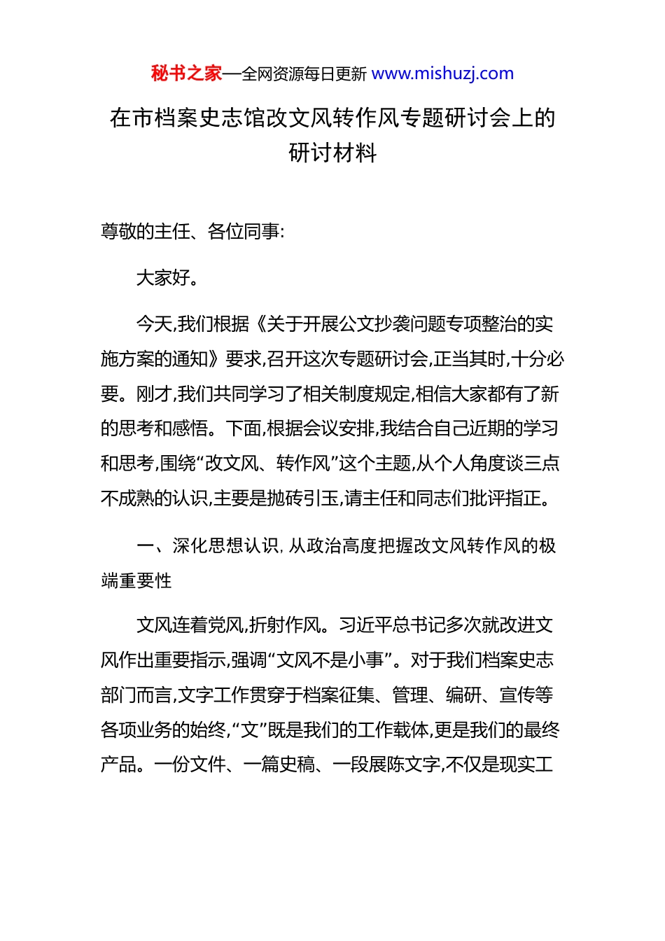 秘书之家—全网资源每日更新 www.mishuzj.com在市档案史志馆改文风转作风专题研讨会上的研讨材料 尊敬的主任、各位同事:大家好。今天,我们根据《关于开展公文抄袭问题专项整治的实施方案的通知》要求,召开这次专题研讨会,正当其时,十分必要。刚才,我们共同学习了相关制度规定,相信大家都有了新的思考和感悟。下面,根据会议安排,我结合自己近期的学习和思考,“”围绕 改文风、转作风 这个主题,从个人角度谈三点不成熟的认识,主要是抛砖引玉,请主任和同志们批评指正。一、深化思想认识,从政治高度把握改文风转作风的极端重要性文风连着党风,折射作风。习近平总书记多次就改进文风作出重要指示,“”强调 文风不是小事 。对于我们档案史志部门而言,文字工作贯穿于档案征集、管理、编研、宣传等各项业务的始终,“”文 既是我们的工作载体,更是我们的最终产品。一份文件、一篇史稿、一段展陈文字,不仅是现实工秘书之家—全网资源每日更新 www.mishuzj.com作的指导,更是存留后世的历史凭证。因此,端正文风,对我们来说具有特殊而重要的意义。首先,“”改进文风是践行 两个维护 的直接体现。文风背后是思想。无论是学习贯彻《中国共产党重大事项请示报告条例》,还是执行《党政机关公文处理工作条例》,都要求我们在文字表达上做到精准、规范、严谨。公文的起草、审核、印发,每一个环节都是政治把关的过程。行文的清晰度、材料的准确度、逻辑的严密度,直接关系到党的路线方针政策能否不折不扣地得到贯彻执行。一份含糊其辞、照搬照抄的公文,不仅会造成工作上的延误和偏差,从根子上说,更是政治站位不高、责任心不强的表现。其次,改进文风是力戒形式主义、为基层减负的内在要求。中央印发的《整治形式主义为基层减负若干规定》明“”确指向了文山会海等突出问题。而 假大空长 的不良文风,正是文山会海的重要推手。一篇几千字的工作总结,有效信息可能只有几百字;一份层层转发的通知,除了文头和落款,内容几乎原封不动。这种以形式主义应对形式主义的做法,耗费了大量行政资源,增加了基层不必要的负担,更损害了机关的公信力和执行力。正如 XX 县司法局在近期的研讨会上所强调的,“文风问题不仅仅是文字表达问题,更是思想作秘书之家—全网资源每日更新 www.mishuzj.com”风、工作作风的体现 。我们必须清醒地认识到,不良文风是“”作风问题的 显性基因 ,是必须下大力气根除的顽瘴痼疾。最后,改进文风是提升档案史志工作质量的根本保证。《规范地方党委政策性文件制定工作规定》要求文件内容“”要 务实管用 。对我们而言,无论是编纂地方志、撰写党史,还是开发档案文化产品,“其最终目的都是 存史、育人、资”政 。如果我们的研究成果充斥着空洞的理论、缺乏鲜活的史料,或者展览的文字说明晦涩难懂、缺乏吸引力,那么我们的工作价值就无从谈起。好的文风,应当是朴实、清新、生动的,能够用群众听得懂的语言,讲好 XX 的档案故事、历史故事,这才是我们档案史志工作者应有的文化自信和专业追求。二、坚持问题导向,深刻检视自身在文风作风方面存在的差距与不足对照上级要求和先进单位的做法,结合我们馆的实际情况,我认为成绩是主要的,但问题同样不容忽视。虽然根据内部工作统计,我们馆在过去一年中并未发现并正式处理过“”因 公文抄袭 而引发的案件或责任事件但这并不意味着我们可以高枕无忧。事实上,在全国范围内,公文抄袭、材料照搬等问题时有发生,一些单位甚至因此受到严肃处理。这种秘书之家—全网资源每日更新 www.mishuzj.com现象为我们敲响了警钟,“促使我们必须以 见贤思齐、见不贤”而内自省 的态度,“”深入查找自身可能存在的 亚健康 状态。我个人认为,以下几个方面的倾向性问题需要引起我们的高度警惕。第一,“”存在 思想懒惰、照搬照套 的现象。在撰写一些常规性、程序性的文件,如年度计划、工作总结、学习心得时,“”“”少数同志满足于当 二传手 和 文印员 。习惯于从网上下载模板,从上级文件中断章取义,“从兄弟单位的材料中 借”鉴 思路,甚至直接复制粘贴往年的内容,仅仅替换一下年份“”和个别数据。这种 拿来主义 看似提高了效率,实则回避了...