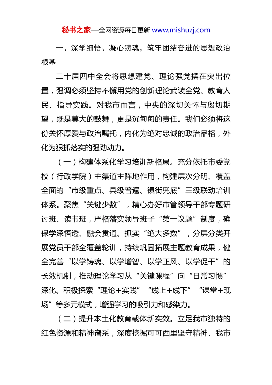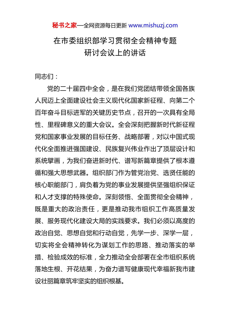 秘书之家—全网资源每日更新 www.mishuzj.com在市委组织部学习贯彻全会精神专题研讨会议上的讲话 同志们:党的二十届四中全会,是在我们党团结带领全国各族人民迈上全面建设社会主义现代化国家新征程、向第二个百年奋斗目标进军的关键历史节点,召开的一次具有全局性、里程碑意义的重大会议。全会深刻把握新时代新征程党和国家事业发展的目标任务、战略部署,对以中国式现代化全面推进强国建设、民族复兴伟业作出了顶层设计和系统擘画,为我们奋进新时代、谱写新篇章提供了根本遵循和强大思想武器。组织部门作为管党治党、选贤任能的核心职能部门,肩负着为党的事业发展提供坚强组织保证和人才支撑的特殊使命。深刻领悟、全面贯彻全会精神,既是重大的政治责任,更是推动我市组织工作高质量发展、服务现代化建设大局的实践要求。我们必须以高度的政治自觉、思想自觉和行动自觉,先学一步、深学一层,切实将全会精神转化为谋划工作的思路、推动落实的举措、检验成效的标准,全力推动全会部署在全市组织系统落地生根、开花结果,为奋力谱写健康现代幸福新我市建设壮丽篇章筑牢坚实的组织根基。秘书之家—全网资源每日更新 www.mishuzj.com一、深学细悟、凝心铸魂,筑牢团结奋进的思想政治根基二十届四中全会将思想建党、理论强党摆在突出位置,强调必须坚持不懈用党的创新理论武装全党、教育人民、指导实践。对我市而言,中央的深切关怀与殷切期望,既是莫大的鼓舞,更是沉甸甸的责任。我们必须将这份关怀厚爱与政治嘱托,内化为绝对忠诚的政治品格,外化为狠抓落实的强劲动力。(一)构建体系化学习培训新格局。充分依托市委党校(行政学院)主渠道主阵地作用,构建层次分明、覆盖全面的“市级重点、县级普遍、镇街兜底”三级联动培训体系。聚焦“关键少数”,精心办好市管领导干部专题研讨班、读书班,严格落实领导班子“第一议题”制度,确保学深悟透、融会贯通。抓实“绝大多数”,分层分类开展党员干部全覆盖轮训,持续巩固拓展主题教育成果,健全完善“以学铸魂、以学增智、以学正风、以学促干”的长效机制,推动理论学习从“关键课程”向“日常习惯”深化。积极探索“理论+实践”“线上+线下”“课堂+现场”等多元模式,增强学习的吸引力和感染力。(二)提升本土化教育载体新实效。立足我市独特的红色资源和精神谱系,深度挖掘可可西里坚守精神、我市秘书之家—全网资源每日更新 www.mishuzj.com抗震救灾精神等蕴含的崇高理想信念和强大精神力量,不断赋予其新的时代内涵。大力创新教育载体形式,升级打造“强村讲堂”品牌,使其成为宣讲政策、凝聚共识、服务群众的前沿阵地;活化利用“马背法庭”等特色载体,使其成为流动的党性教育课堂;精心策划红色教育基地研学路线,组织党员干部沉浸式体验、情景式感悟。通过讲好身边故事、感悟思想伟力,引导广大党员干部深刻领悟“两个确立”的决定性意义,不断增强“四个意识”、坚定“四个自信”、做到“两个维护”,自觉将感恩之心转化为听党指挥、跟党奋斗的坚定行动。(三)强化学以致用的实践转化力。学习的根本目的在于运用。要大力弘扬理论联系实际的优良学风,紧密结合我市发展面临的新形势新任务新挑战,引导党员干部带着问题学、联系实际思、对标对表干。组织开展“贯彻四中全会精神、我为发展献良策”等主题实践活动,切实把学习成果转化为破解改革发展稳定难题的思路方法,转化为推动高质量发展、创造高品质生活、实现高效能治理的具体行动,转化为应对风险挑战、驾驭复杂局面的能力本领,确保理论学习与中心工作同频共振、相互促进。二、导向鲜明、机制优化,锻造堪当现代化重任的高素质骨干队伍秘书之家—全网资源每日更新 www.mishuzj.com全会就建设堪当民族复兴重任的高素质干部队伍作出战略部署,特别强调坚持正确用人导向、突出政治标准、树立践行正确政绩观、推进干部能上能下常态化。我市虽地处特殊自然条件区域,但干部队伍建设的标准绝不能降、要求绝不能松,必须锻造一支政治过硬、适应新时代要求、具备领导现代化建设能力的骨干力量。(一)牢固树立并践行科学的选人用人 “三个导向”。一是坚持政...