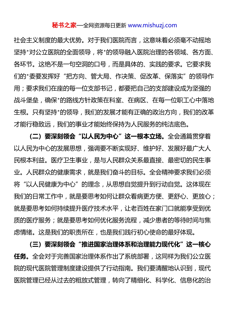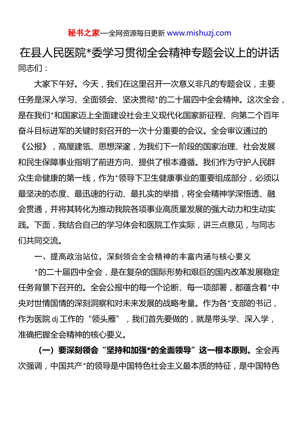 秘书之家—全网资源每日更新 www.mishuzj.com在县人民医院*委学习贯彻全会精神专题会议上的讲话同志们:大家下午好。今天,我们在这里召开一次意义非凡的专题会议,主要任务是深入学习、全面领会、坚决贯彻*的二十届四中全会精神。这次全会,是在我们*和国家迈上全面建设社会主义现代化国家新征程、向第二个百年奋斗目标进军的关键时刻召开的一次十分重要的会议。全会审议通过的《公报》,高屋建瓴、思想深邃,为我们下一阶段的国家治理、社会发展和民生保障事业指明了前进方向、提供了根本遵循。我们作为守护人民群众生命健康的第一线,作为*领导下卫生健康事业的重要组成部分,必须以最坚决的态度、最迅速的行动、最扎实的举措,将全会精神学深悟透、融会贯通,并将其转化为推动我院各项事业高质量发展的强大动力和生动实践。下面,我结合自己的学习体会和医院工作实际,讲三点意见,与同志们共同交流。一、提高政治站位,深刻领会全会精神的丰富内涵与核心要义*的二十届四中全会,是在复杂的国际形势和艰巨的国内改革发展稳定任务背景下召开的。全会公报中的每一个论断、每一项部署,都蕴含着*中央对世情国情的深刻洞察和对未来发展的战略考量。作为各*支部的书记,作为医院 dj 工作的“领头雁”,我们首先要做的,就是带头学、深入学,准确把握全会精神的核心要义。(一)要深刻领会“坚持和加强*的全面领导”这一根本原则。全会再次强调,中国共产*的领导是中国特色社会主义最本质的特征,是中国特色秘书之家—全网资源每日更新 www.mishuzj.com社会主义制度的最大优势。对于我们医院而言,这意味着必须毫不动摇地坚持*对公立医院的全面领导,将*的领导融入医院治理的各领域、各方面、各环节。这绝不是一句空洞的口号,而是具体的、实践的要求。它要求我们的*委要发挥好“把方向、管大局、作决策、促改革、保落实”的领导作用;要求我们在座的每一位支部书记,都要把自己的支部建设成为坚强的战斗堡垒,确保*的路线方针政策在科室、在病区、在每一位职工心中落地生根。只有坚持*的领导,我们的发展才能有正确的政治方向,我们的改革才能行稳致远,我们的事业才能始终保持为人民服务的纯洁底色。(二)要深刻领会“以人民为中心”这一根本立场。全会通篇贯穿着以人民为中心的发展思想,强调要不断实现好、维护好、发展好最广大人民根本利益。医疗卫生事业,是与人民群众关系最直接、最密切的民生事业。人民群众的健康需求,就是我们奋斗的目标。全会精神要求我们必须将“以人民健康为中心”的理念,从思想自觉提升到行动自觉。这体现在我们的日常工作中,就是要思考如何让群众看病更方便、更舒心、更放心;就是要思考如何持续提升医疗技术水平,让老百姓在家门口就能享受到优质的医疗服务;就是要思考如何优化服务流程,减少患者的等待时间与焦虑情绪。这是我们的职责所在,也是我们践行初心使命的最好体现。(三)要深刻领会“推进国家治理体系和治理能力现代化”这一核心任务。全会对于完善国家治理体系作出了系统部署,这同样为我们公立医院的现代医院管理制度建设提供了行动指南。我们要清醒地认识到,现代医院管理已经从过去的粗放式管理,转向了精细化、科学化、信息化的治秘书之家—全网资源每日更新 www.mishuzj.com理模式。这要求我们必须不断完善内部治理结构,健全决策、执行、监督相互协调、相互制衡的运行机制。同时,要着力提升运用法治思维和法治方式深化改革、推动发展、化解矛盾、应对风险的能力。无论是医疗质量安全管理、绩效考核分配,还是人才培养引进、学科建设规划,都必须在制度的轨道上运行,用科学的治理效能,激发医院发展的内生动力。(四)要深刻领会“发展新质生产力,推动高质量发展”这一时代要求。全会强调要以科技创新推动产业创新,加快发展新质生产力。对我们医疗行业而言,新质生产力就是先进的医疗技术、创新的服务模式、高端的医学人才和智慧化的管理系统。我们不能再满足于常规诊疗,必须紧跟医学科技前沿,积极引进和应用新技术、新项目,让科技创新成为提升诊疗水平的核心驱动力。同时,要通过数字化转型,重塑服务流程和管理...