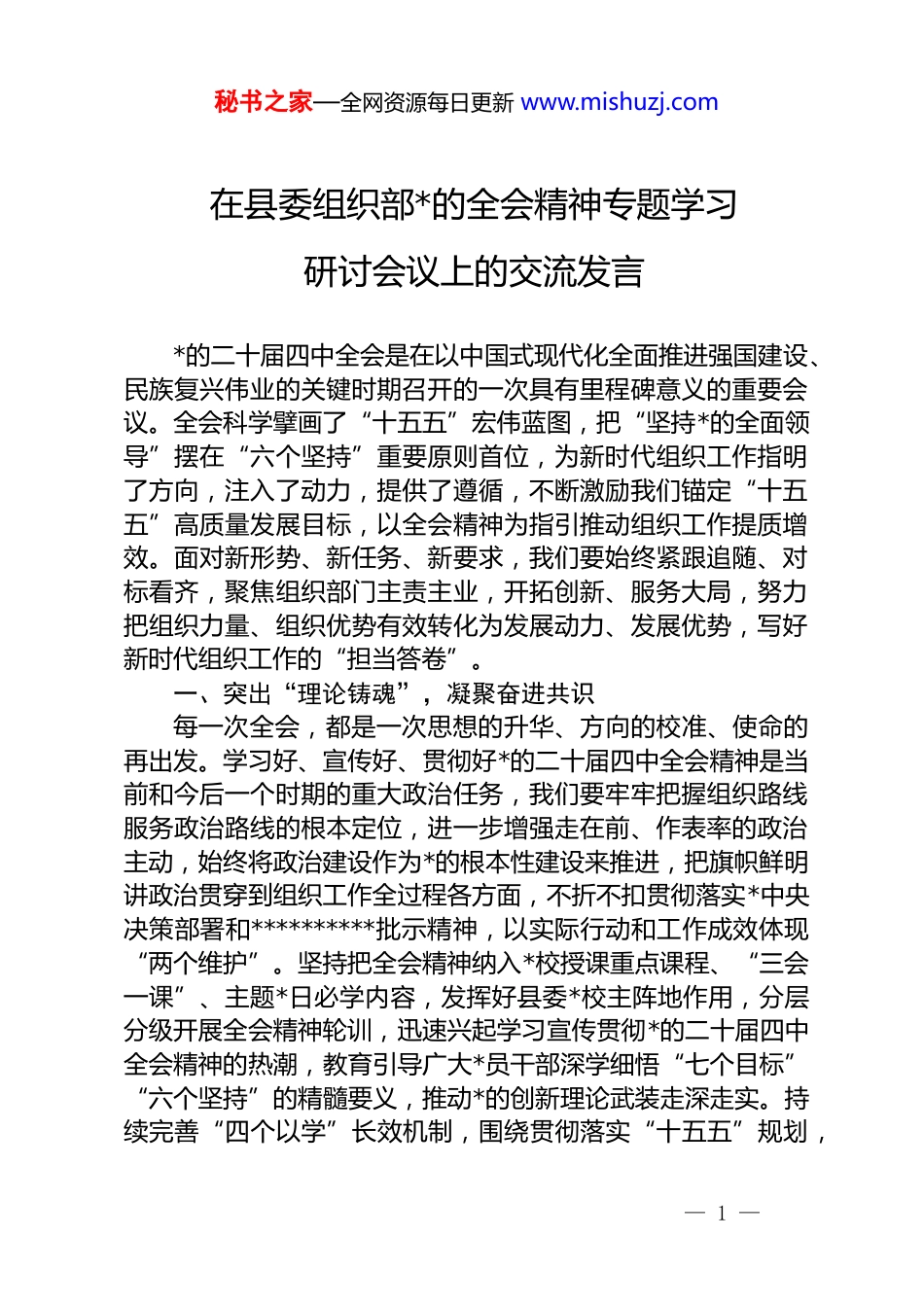 秘书之家—全网资源每日更新 www.mishuzj.com在县委组织部*的全会精神专题学习研讨会议上的交流发言*的二十届四中全会是在以中国式现代化全面推进强国建设、民族复兴伟业的关键时期召开的一次具有里程碑意义的重要会议。全会科学擘画了“十五五”宏伟蓝图,把“坚持*的全面领导”摆在“六个坚持”重要原则首位,为新时代组织工作指明了方向,注入了动力,提供了遵循,不断激励我们锚定“十五五”高质量发展目标,以全会精神为指引推动组织工作提质增效。面对新形势、新任务、新要求,我们要始终紧跟追随、对标看齐,聚焦组织部门主责主业,开拓创新、服务大局,努力把组织力量、组织优势有效转化为发展动力、发展优势,写好新时代组织工作的“担当答卷”。一、突出“理论铸魂”,凝聚奋进共识每一次全会,都是一次思想的升华、方向的校准、使命的再出发。学习好、宣传好、贯彻好*的二十届四中全会精神是当前和今后一个时期的重大政治任务,我们要牢牢把握组织路线服务政治路线的根本定位,进一步增强走在前、作表率的政治主动,始终将政治建设作为*的根本性建设来推进,把旗帜鲜明讲政治贯穿到组织工作全过程各方面,不折不扣贯彻落实*中央决策部署和**********批示精神,以实际行动和工作成效体现“两个维护”。坚持把全会精神纳入*校授课重点课程、“三会一课”、主题*日必学内容,发挥好县委*校主阵地作用,分层分级开展全会精神轮训,迅速兴起学习宣传贯彻*的二十届四中全会精神的热潮,教育引导广大*员干部深学细悟“七个目标”“六个坚持”的精髓要义,推动*的创新理论武装走深走实。持续完善“四个以学”长效机制,围绕贯彻落实“十五五”规划,— 1 —秘书之家—全网资源每日更新 www.mishuzj.com不断丰富教育培训供给,推动*员干部将学习成果转化为服务县委县政府规划建设的具体措施,落实到推进县域发展目标任务上,全面提升*员干部推动高质量发展本领,以统一的思想行动凝聚奋发进取的磅礴力量。二、突出“实干导向”,锻造攻坚铁军推进“十五五”时期的各项目标任务,靠的是广大*员干部实干担当、聚力攻坚,必须坚持事业为上、以事择人,统筹抓好领导班子和干部队伍建设。我们要认真对照落实全会对建设高素质专业化干部队伍提出的新要求,牢固树立重实干、重实绩、重担当的鲜明导向,把干部政治素质考察融入日常、抓在经常、落在平常,常态化纠治政绩观偏差,大力选拔扎根一线、埋头苦干、实绩突出的干部。聚焦 2026 年县乡领导班子换届,将长远规划和立足当下结合起来,持续对领导班子运行质态、干部培养情况进行摸底调研,统筹考虑领导班子年龄、专业、民族、结构等因素,坚持人岗适配原则,进一步加大后备干部培养储备力度,着力增强领导班子整体功能。坚持把从严监督管理和鼓励担当作为高度统一起来,在强化干部日常监督管理,深化运用干部监督“红黄蓝”预警和联席会议机制,加强退出领导岗位干部管理,推动干部能上能下常态化的同时,认真贯彻关心关爱基层干部二十条措施,稳步有序推进职级晋升工作,建立健全容错纠错机制,激励广大干部在落实“十五五”规划、深化改革、服务群众中担当作为。三、突出“组织优势”,夯实治理根基治国必先治*,*兴才能国强,坚持和加强*的全面领导是推进中国式现代化的根本保障。我们要树牢大抓基层鲜明导向,大力实施 dj 引领乡村振兴示范区“三强三优三提升”三年行动,持续扩大“幸福班彦”“红色双树”等红色资源影响力,将 dj深度融入打造我县“七张名片”、乡村振兴、应急抢险等重点工作中,不断擦亮“乡土先锋”名片,推动农村基层 dj 与乡村— 2 —秘书之家—全网资源每日更新 www.mishuzj.com振兴工作融合发展取得新成效。坚持把抓好村(社区)“两委”换届工作作为进一步优化基层组织功能、巩固*的执政根基的战略契机,紧盯时间节点、优化工作流程、细化工作举措,选优配强村(社区)*组织带头人,建强推进“十五五”时期目标任务落实的基层战斗堡垒。强化 dj 引领赋能基层治理,加快社区*委建立,深化社区工作者职业体系化建设,加强机关企事业单位和新经济组织、新社会组织、新就业群体*的建设,推...