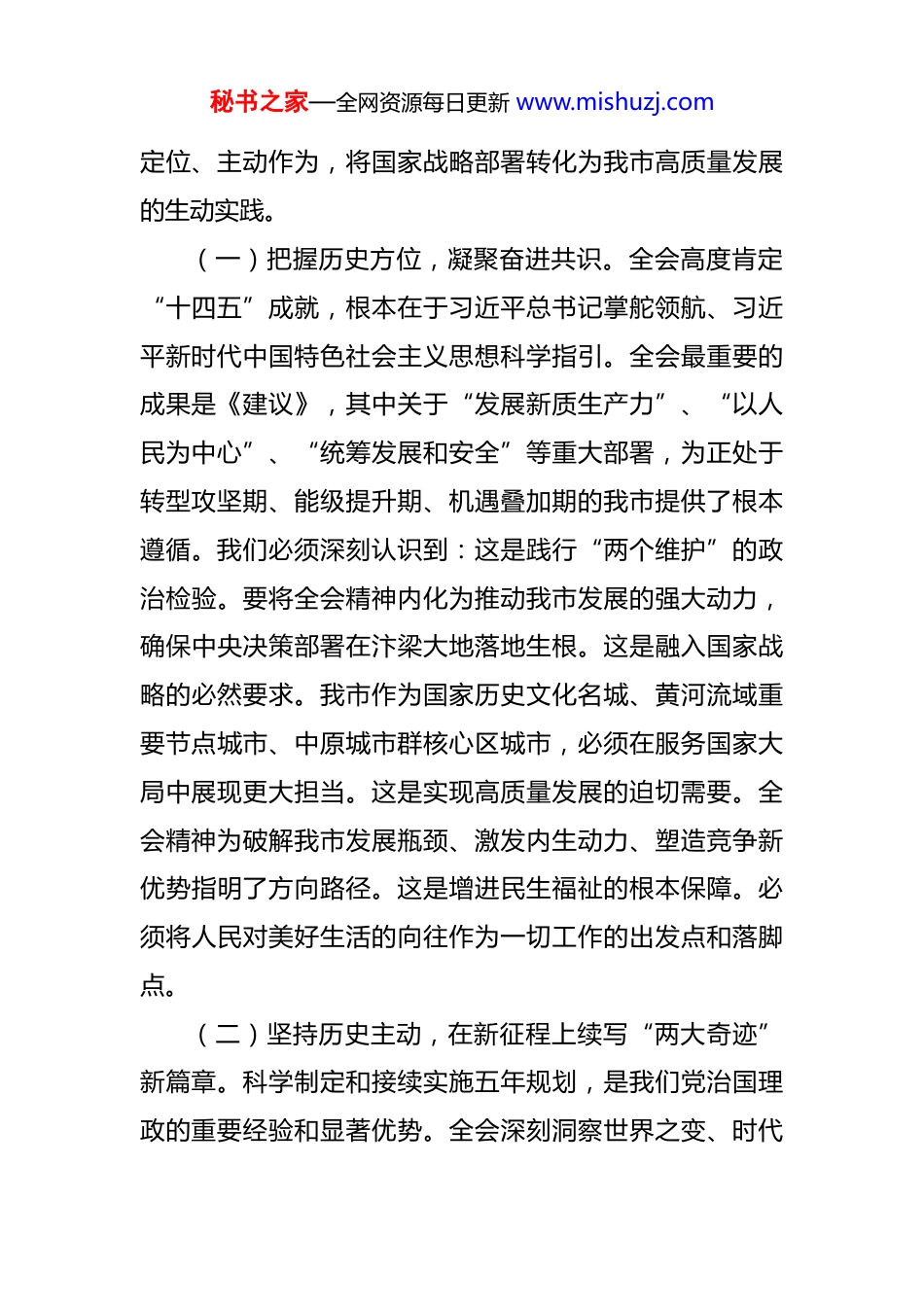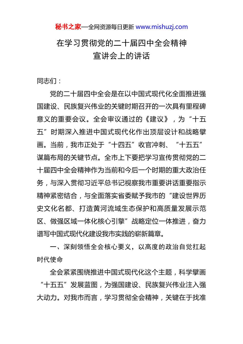 秘书之家—全网资源每日更新 www.mishuzj.com在学习贯彻党的二十届四中全会精神宣讲会上的讲话 同志们:党的二十届四中全会是在以中国式现代化全面推进强国建设、民族复兴伟业的关键时期召开的一次具有里程碑意义的重要会议。全会审议通过的《建议》,为“十五五”时期深入推进中国式现代化作出顶层设计和战略擘画。当前,我市正处于“十四五”收官冲刺、“十五五”谋篇布局的关键节点。全市上下要把学习宣传贯彻党的二十届四中全会精神作为当前和今后一个时期的重大政治任务,与深入贯彻习近平总书记视察我市重要讲话重要指示精神紧密结合,与全面落实省委赋予我市的“建设世界历史文化名都、打造黄河流域生态保护和高质量发展示范区、做强区域一体化核心引擎”战略定位一体推进,奋力谱写中国式现代化建设我市实践的崭新篇章。一、深刻领悟全会核心要义,以高度的政治自觉扛起时代使命全会紧紧围绕推进中国式现代化这个主题,科学擘画“十五五”发展蓝图,为强国建设、民族复兴伟业注入强大动力。对我市而言,学习贯彻全会精神,关键在于找准秘书之家—全网资源每日更新 www.mishuzj.com定位、主动作为,将国家战略部署转化为我市高质量发展的生动实践。(一)把握历史方位,凝聚奋进共识。全会高度肯定“十四五”成就,根本在于习近平总书记掌舵领航、习近平新时代中国特色社会主义思想科学指引。全会最重要的成果是《建议》,其中关于“发展新质生产力”、“以人民为中心”、“统筹发展和安全”等重大部署,为正处于转型攻坚期、能级提升期、机遇叠加期的我市提供了根本遵循。我们必须深刻认识到:这是践行“两个维护”的政治检验。要将全会精神内化为推动我市发展的强大动力,确保中央决策部署在汴梁大地落地生根。这是融入国家战略的必然要求。我市作为国家历史文化名城、黄河流域重要节点城市、中原城市群核心区城市,必须在服务国家大局中展现更大担当。这是实现高质量发展的迫切需要。全会精神为破解我市发展瓶颈、激发内生动力、塑造竞争新优势指明了方向路径。这是增进民生福祉的根本保障。必须将人民对美好生活的向往作为一切工作的出发点和落脚点。(二)坚持历史主动,在新征程上续写“两大奇迹”新篇章。科学制定和接续实施五年规划,是我们党治国理政的重要经验和显著优势。全会深刻洞察世界之变、时代秘书之家—全网资源每日更新 www.mishuzj.com之变、历史之变,强调必须把发展新质生产力摆在更加突出的战略位置,这对于我市这样一座正致力于打造科创我市、智造我市的城市而言,既是重大机遇,也是重大责任。我市拥有国家新一代人工智能创新发展试验区、国家量子科技研发中心等重大创新平台,在量子科技、人工智能、生物医药、空天信息等领域具备一定的先发优势。我们要深刻领会全会精神,将发展新质生产力作为推动高质量发展的首要任务和关键抓手,充分发挥科教资源富集、产业基础雄厚的优势,在科技创新引领、现代化产业体系建设等方面走在前列,努力为全省乃至全国续写“经济快速发展和社会长期稳定两大奇迹”贡献我市力量。全会进一步强调必须坚持全面深化改革,扩大高水平开放。我市作为全国首个科创金融改革试验区,在深化改革、扩大开放方面肩负着探路使命。我们要以全会精神为指引,持续深化“放管服”改革,打造一流营商环境;要高标准建设自由贸易试验区我市片区,主动对接国际高标准经贸规则,在制度型开放上取得新突破,以改革的“关键一招”和开放的“最大优势”激发城市发展的内生动力。(三)聚焦核心任务,明晰我市路径。全会提出的“六个坚持”重大原则和重点任务,是我市推进现代化建设的行动指南。我们要立足“八朝古都”的资源禀赋和秘书之家—全网资源每日更新 www.mishuzj.com“区域同城”的区位优势,找准发力点:突出“新质生产力”驱动。发挥我市科教资源优势和汽车及零部件、精细化工、装备制造等产业基础,以及国家文化出口基地等平台作用,在科技创新引领、传统产业焕新、新兴产业培育上求突破,打造区域科创走廊重要支点。强化“改革开放”赋能。用好全国首个“普惠金融改革试验区”等金字招牌,持续深化“放管服”改革,打造...