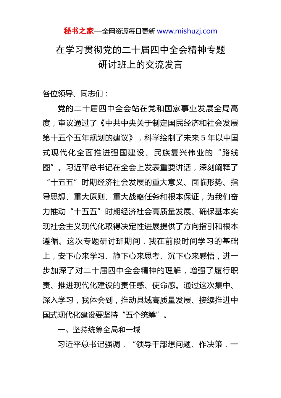 秘书之家—全网资源每日更新 www.mishuzj.com在学习贯彻党的二十届四中全会精神专题研讨班上的交流发言 各位领导、同志们:党的二十届四中全会站在党和国家事业发展全局高度,审议通过了《中共中央关于制定国民经济和社会发展第十五个五年规划的建议》,科学绘制了未来 5 年以中国式现代化全面推进强国建设、民族复兴伟业的“路线图”。习近平总书记在全会上发表重要讲话,深刻阐释了“十五五”时期经济社会发展的重大意义、面临形势、指导思想、重大原则、重大战略任务和根本保证,为我们奋力推动“十五五”时期经济社会高质量发展、确保基本实现社会主义现代化取得决定性进展提供了方向指引和根本遵循。这次专题研讨班期间,我在前段时间学习的基础上,安下心来学习、静下心来思考、沉下心来感悟,进一步加深了对二十届四中全会精神的理解,增强了履行职责、推进现代化建设的责任感、使命感。通过这次集中、深入学习,我体会到,推动县域高质量发展、接续推进中国式现代化建设要坚持“五个统筹”。一、坚持统筹全局和一域习近平总书记强调,“领导干部想问题、作决策,一秘书之家—全网资源每日更新 www.mishuzj.com定要对国之大者心中有数,多打大算盘、算大账,少打小算盘、算小账,善于把地区和部门的工作融入党和国家事业大棋局,做到既为一域争光、更为全局添彩。”不谋全局者,不足谋一域。加快县域高质量发展,必须心怀“国之大者”,以宏大视野观全局、察形势、谋发展,不断提高政治判断力、政治领悟力、政治执行力,不断提高把握新发展阶段、贯彻新发展理念、构建新发展格局的政治能力、战略眼光、专业水平,敢于担当、善于作为,不折不扣、坚定坚决把中央决策部署贯彻好,把省委☆☆战略、市委☆☆战略落实好。同时,习近平总书记强调,“要强化精准思维,坚持‘致广大而尽精微’,做到谋划时统揽大局、操作中细致精当,以绣花功夫把工作做扎实、做到位”。这就要求我们,必须立足各地、各部门自身特色,找准切入点着力点,创造性地把中央和省委精神落到实处,真正把自己的事情办好,以一域之作为服务全局、贡献全局。二、坚持统筹供给和需求全会提出,“坚持扩大内需这个战略基点,坚持惠民生和促消费、投资于物和投资于人紧密结合,以新需求引领新供给,以新供给创造新需求,促进消费和投资、供给和需求良性互动”。推进县域高质量发展过程中,必须注秘书之家—全网资源每日更新 www.mishuzj.com重需求侧和供给侧的协同互动,既要持续优化供给结构,聚焦新质生产力培育,综合整治“内卷式”竞争,提升产业链供应链韧性和安全水平,让更高质量的产品和服务更好满足需求,又要坚持扩大内需这个战略基点,注重需求侧管理,大力提振消费,扩大有效投资,提高民生类政府投资比重,特别是要继续发挥好投资对扩内需、补短板的关键作用。☆☆省大多数县域依然属于欠发达地区,投资仍是拉动经济增长的主要动力。要牢固树立“项目为王”的理念,全力以赴谋项目、争项目、引项目、建项目。三、坚持统筹提质和扩量全会明确提出,以推动高质量发展为主题,要求“坚持以经济建设为中心,完整准确全面贯彻新发展理念,实现质的有效提升和量的合理增长,推动经济持续健康发展和社会全面进步”。推动县域发展必须注重量质齐升,不能顾此失彼。一方面,要按照习近平总书记要求的那样,“从根本宗旨把握新发展理念”“从问题导向把握新发展理念”“从忧患意识把握新发展理念”,完整、准确、全面贯彻新发展理念,着眼解决动力问题推进创新发展,着眼解决不平衡问题推进协调发展,着眼解决人与自然和谐问题推进绿色发展,着眼解决内外联动问题推进开放发展,着眼解决社会公平正义问题推进共享发展,真正实现秘书之家—全网资源每日更新 www.mishuzj.com高质量发展。另一方面,与江浙等发达地区相比,我省县域经济综合实力不强,经济总量仍然偏小,面临发展总量不足、质量不高双重问题。不做大经济总量,一个地方的综合实力和竞争力就无从谈起。要想方设法保持稳中较快的发展势头,不断扩大经济总量,实现“质”与“量”的双重跨越。四、坚持统筹城市和乡村全会提出,“坚持把解决好...