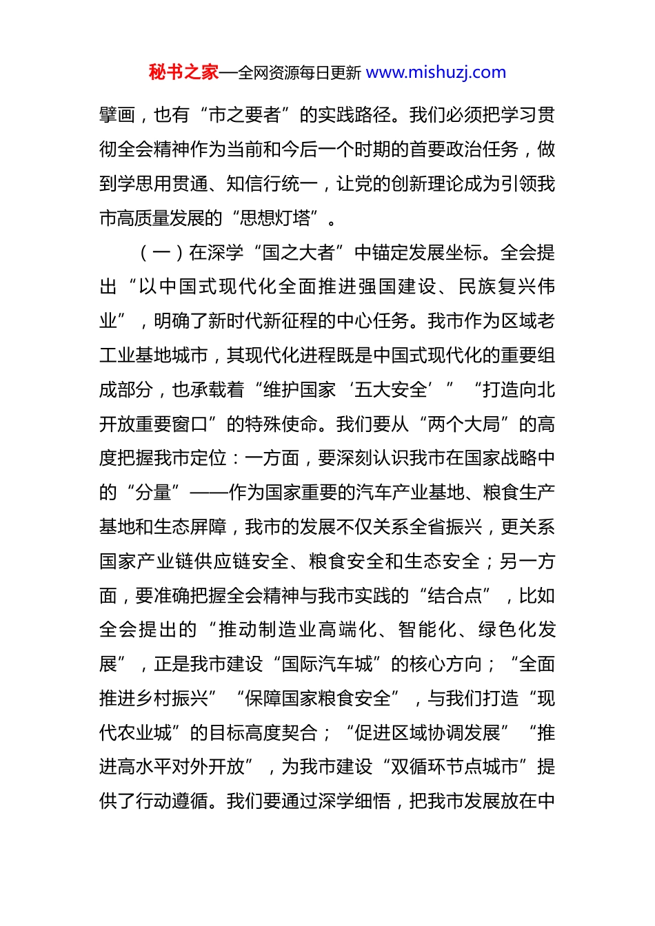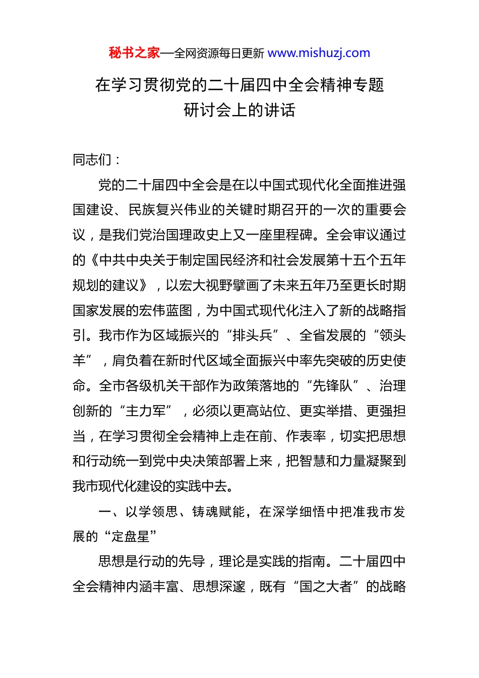 秘书之家—全网资源每日更新 www.mishuzj.com在学习贯彻党的二十届四中全会精神专题研讨会上的讲话 同志们:党的二十届四中全会是在以中国式现代化全面推进强国建设、民族复兴伟业的关键时期召开的一次的重要会议,是我们党治国理政史上又一座里程碑。全会审议通过的《中共中央关于制定国民经济和社会发展第十五个五年规划的建议》,以宏大视野擘画了未来五年乃至更长时期国家发展的宏伟蓝图,为中国式现代化注入了新的战略指引。我市作为区域振兴的“排头兵”、全省发展的“领头羊”,肩负着在新时代区域全面振兴中率先突破的历史使命。全市各级机关干部作为政策落地的“先锋队”、治理创新的“主力军”,必须以更高站位、更实举措、更强担当,在学习贯彻全会精神上走在前、作表率,切实把思想和行动统一到党中央决策部署上来,把智慧和力量凝聚到我市现代化建设的实践中去。一、以学领思、铸魂赋能,在深学细悟中把准我市发展的“定盘星”思想是行动的先导,理论是实践的指南。二十届四中全会精神内涵丰富、思想深邃,既有“国之大者”的战略秘书之家—全网资源每日更新 www.mishuzj.com擘画,也有“市之要者”的实践路径。我们必须把学习贯彻全会精神作为当前和今后一个时期的首要政治任务,做到学思用贯通、知信行统一,让党的创新理论成为引领我市高质量发展的“思想灯塔”。(一)在深学“国之大者”中锚定发展坐标。全会提出“以中国式现代化全面推进强国建设、民族复兴伟业”,明确了新时代新征程的中心任务。我市作为区域老工业基地城市,其现代化进程既是中国式现代化的重要组成部分,也承载着“维护国家‘五大安全’”“打造向北开放重要窗口”的特殊使命。我们要从“两个大局”的高度把握我市定位:一方面,要深刻认识我市在国家战略中的“分量”——作为国家重要的汽车产业基地、粮食生产基地和生态屏障,我市的发展不仅关系全省振兴,更关系国家产业链供应链安全、粮食安全和生态安全;另一方面,要准确把握全会精神与我市实践的“结合点”,比如全会提出的“推动制造业高端化、智能化、绿色化发展”,正是我市建设“国际汽车城”的核心方向;“全面推进乡村振兴”“保障国家粮食安全”,与我们打造“现代农业城”的目标高度契合;“促进区域协调发展”“推进高水平对外开放”,为我市建设“双循环节点城市”提供了行动遵循。我们要通过深学细悟,把我市发展放在中秘书之家—全网资源每日更新 www.mishuzj.com国式现代化的大棋局中谋划,确保每一项工作都精准对接国家战略、服务全局发展。(二)在对标“市之要务”中破解发展难题。学习的目的全在于运用。当前,我市正处于转型升级的攻坚期、振兴发展的关键期,既面临汽车产业“换道超车”、开发区改革创新、营商环境优化等“老难题”,也面临数字经济突破、绿色低碳转型、城市治理现代化等“新挑战”。全会提出的“坚持问题导向”“增强问题意识”,为我们破解难题提供了方法论。我们要以全会精神为“钥匙”,深入查摆我市发展的短板弱项:在产业升级上,如何推动汽车产业从“规模扩张”向“生态构建”转变,实现新能源汽车、智能网联汽车的“换道领跑”?在区域协同上,如何深度融入“一带一路”向北开放倡议,打造中蒙俄经济走廊重要支点?在城市治理上,如何破解“大城市病”,让城市更宜居、更韧性、更智慧?在民生改善上,如何解决教育、医疗、养老等领域的“急难愁盼”,让群众共享发展成果?每一名机关干部都要带着这些问题学、对着这些难题思,把学习成果转化为破解难题的具体思路、管用举措,真正让全会精神成为“攻坚克难的指南针”。(三)在践行“民之关切”中厚植为民情怀。全会强秘书之家—全网资源每日更新 www.mishuzj.com调“坚持以人民为中心的发展思想”,这是我们一切工作的出发点和落脚点。我市作为一座有温度的城市,“为民”二字始终是城市发展的底色。但我们也要清醒看到,群众对“更好的教育、更稳定的工作、更满意的收入、更可靠的社会保障”的期盼,与我们工作中的“堵点”“痛点”仍有差距:比如老旧小区改造如何兼顾“面子”与“里子”?基层治理如何打通“最后一公里”?企业对...