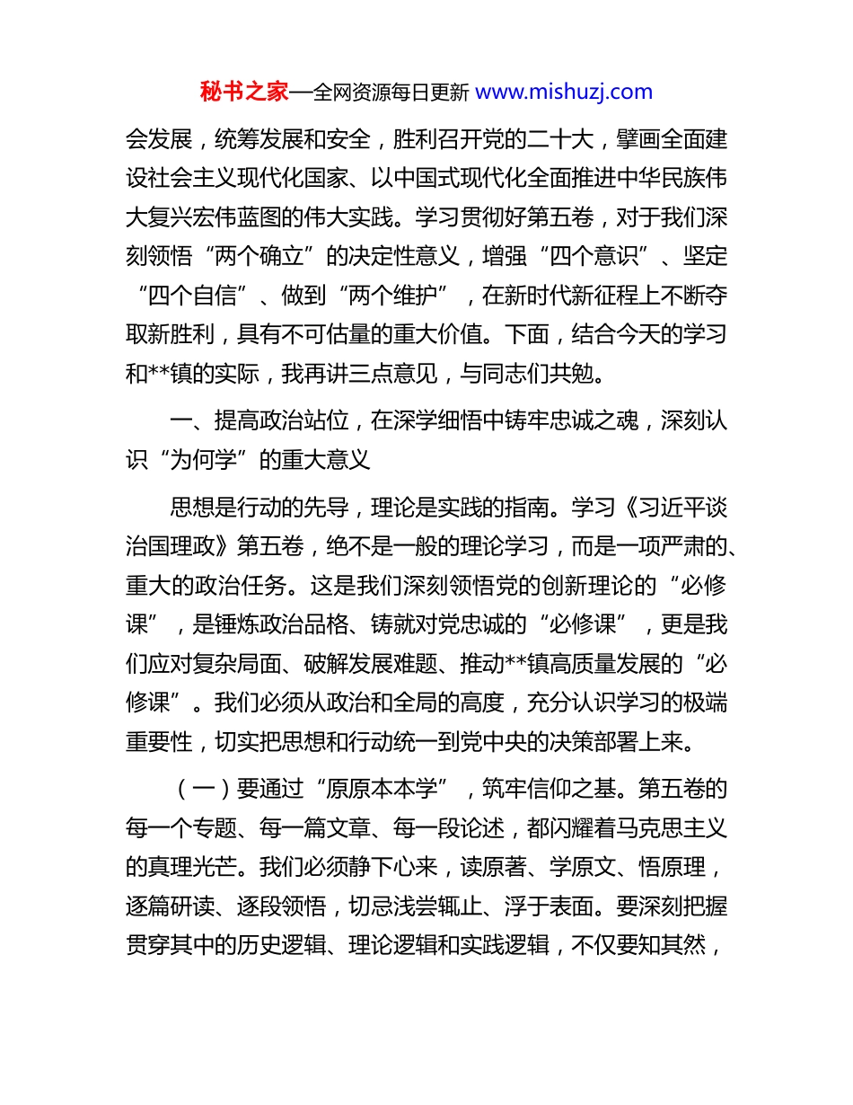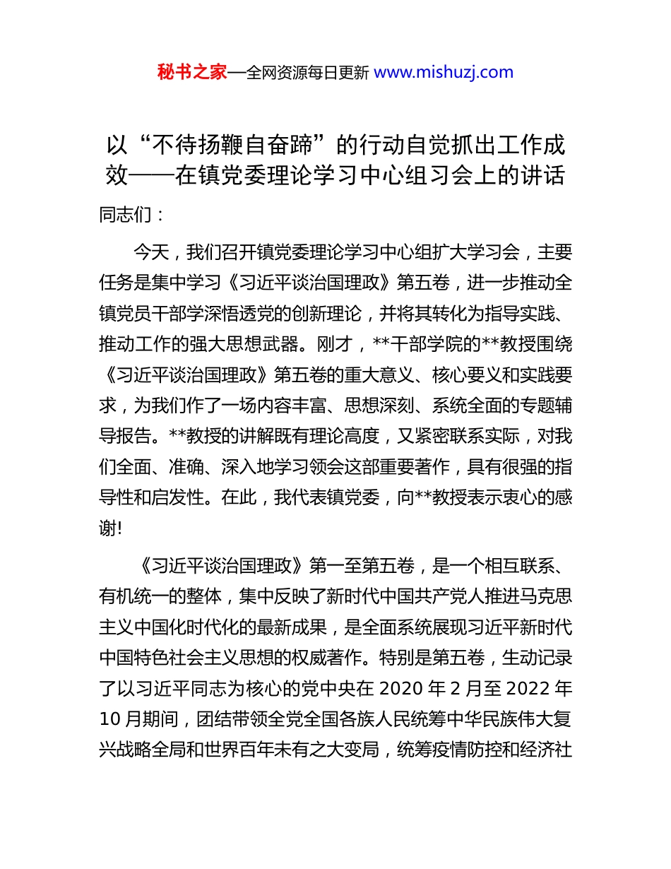 秘书之家—全网资源每日更新 www.mishuzj.com以“不待扬鞭自奋蹄”的行动自觉抓出工作成效——在镇党委理论学习中心组习会上的讲话同志们:今天,我们召开镇党委理论学习中心组扩大学习会,主要任务是集中学习《习近平谈治国理政》第五卷,进一步推动全镇党员干部学深悟透党的创新理论,并将其转化为指导实践、推动工作的强大思想武器。刚才,**干部学院的**教授围绕《习近平谈治国理政》第五卷的重大意义、核心要义和实践要求,为我们作了一场内容丰富、思想深刻、系统全面的专题辅导报告。**教授的讲解既有理论高度,又紧密联系实际,对我们全面、准确、深入地学习领会这部重要著作,具有很强的指导性和启发性。在此,我代表镇党委,向**教授表示衷心的感谢!《习近平谈治国理政》第一至第五卷,是一个相互联系、有机统一的整体,集中反映了新时代中国共产党人推进马克思主义中国化时代化的最新成果,是全面系统展现习近平新时代中国特色社会主义思想的权威著作。特别是第五卷,生动记录了以习近平同志为核心的党中央在 2020 年 2 月至 2022 年10 月期间,团结带领全党全国各族人民统筹中华民族伟大复兴战略全局和世界百年未有之大变局,统筹疫情防控和经济社秘书之家—全网资源每日更新 www.mishuzj.com会发展,统筹发展和安全,胜利召开党的二十大,擘画全面建设社会主义现代化国家、以中国式现代化全面推进中华民族伟大复兴宏伟蓝图的伟大实践。学习贯彻好第五卷,对于我们深刻领悟“两个确立”的决定性意义,增强“四个意识”、坚定“四个自信”、做到“两个维护”,在新时代新征程上不断夺取新胜利,具有不可估量的重大价值。下面,结合今天的学习和**镇的实际,我再讲三点意见,与同志们共勉。一、提高政治站位,在深学细悟中铸牢忠诚之魂,深刻认识“为何学”的重大意义思想是行动的先导,理论是实践的指南。学习《习近平谈治国理政》第五卷,绝不是一般的理论学习,而是一项严肃的、重大的政治任务。这是我们深刻领悟党的创新理论的“必修课”,是锤炼政治品格、铸就对党忠诚的“必修课”,更是我们应对复杂局面、破解发展难题、推动**镇高质量发展的“必修课”。我们必须从政治和全局的高度,充分认识学习的极端重要性,切实把思想和行动统一到党中央的决策部署上来。(一)要通过“原原本本学”,筑牢信仰之基。第五卷的每一个专题、每一篇文章、每一段论述,都闪耀着马克思主义的真理光芒。我们必须静下心来,读原著、学原文、悟原理,逐篇研读、逐段领悟,切忌浅尝辄止、浮于表面。要深刻把握贯穿其中的历史逻辑、理论逻辑和实践逻辑,不仅要知其然,秘书之家—全网资源每日更新 www.mishuzj.com更要知其所以然,还要知其所以必然。要深刻理解其中关于“中国之问、世界之问、人民之问、时代之问”的深邃回答,真正掌握蕴含其中的马克思主义立场、观点、方法,把蕴含的道理学理哲理内化于心。只有这样,我们才能真正理解习近平新时代中国特色社会主义思想是如何在新时代的伟大斗争中形成并不断丰富发展的,才能更加坚定对马克思主义的信仰、对中国特色社会主义的信念、对实现中华民族伟大复兴的信心。(二)要通过“融会贯通学”,补足精神之钙。学习第五卷,不能孤立地看,要同学习第一、二、三、四卷贯通起来,同学习党的二十大精神和党中央近期作出的一系列重大决策部署结合起来。要深刻认识到,从第一卷到第五卷,贯穿着一条鲜明的主线,那就是坚持和发展中国特色社会主义。这是一个持续深化、不断拓展的理论体系。我们要从中深刻领会习近平总书记作为马克思主义政治家、思想家、战略家的恢弘视野、远见卓识和雄韬伟略。通过系统学习,我们要更加清晰地看到,第五卷所提出的许多新思想、新观点、新论断,既与前四卷一脉相承,又具有鲜明的创新性和时代性,是党的理论创新的最新成果。这种融会贯通的学习,能够帮助我们更全面、更系统地把握这一思想的科学体系和精神实质,从而不断精神之钙,把稳思想之舵。(三)要通过“联系实际学”,夯实成事之本。理论的价值在于指导实践,学习的成效要靠实践来检验。我们学习《习秘书之家—全网资源每日更新 www.m...