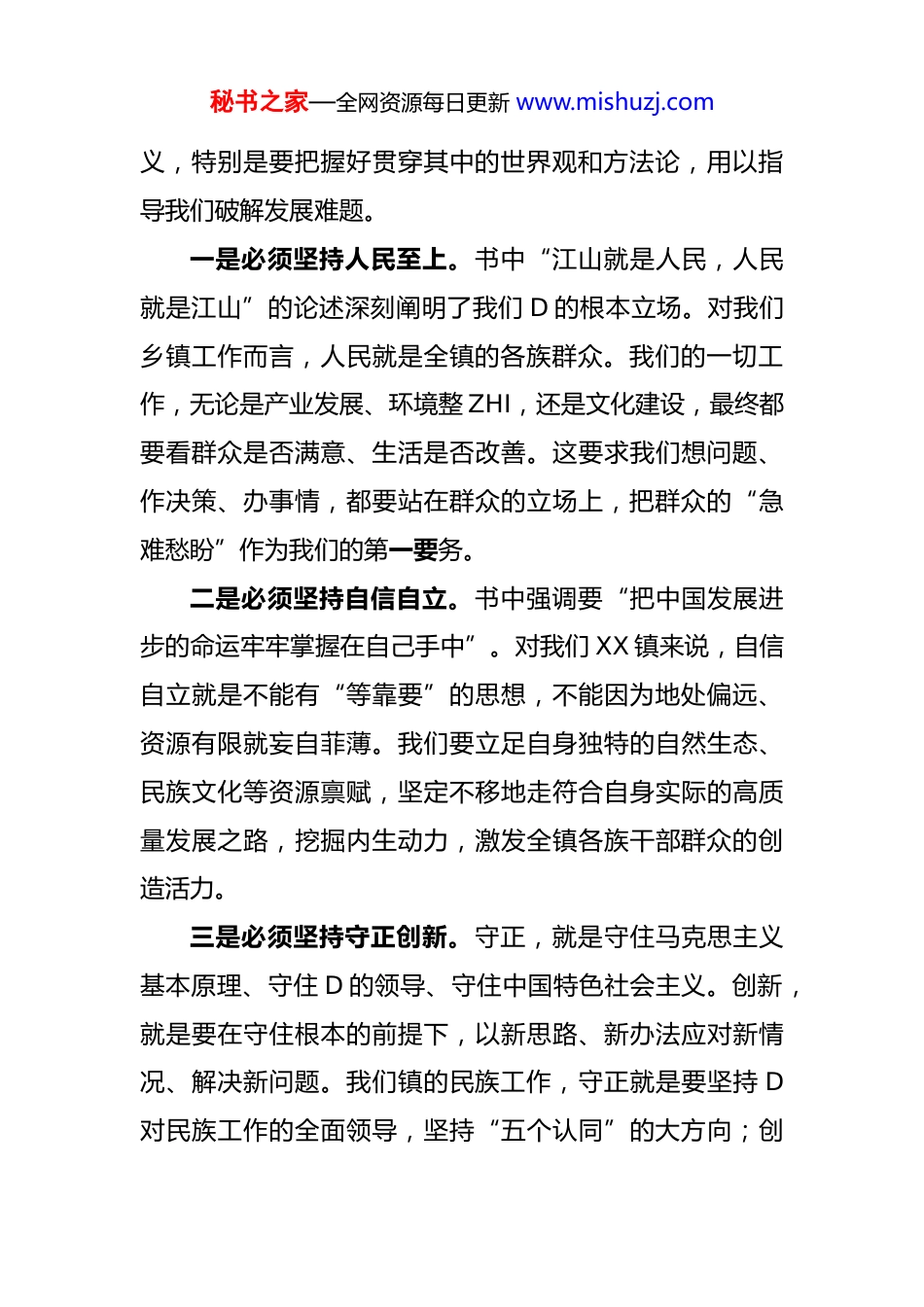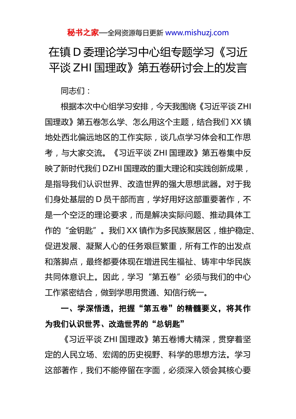 秘书之家—全网资源每日更新 www.mishuzj.com在镇 D 委理论学习中心组专题学习《习近平谈 ZHI 国理政》第五卷研讨会上的发言同志们:根据本次中心组学习安排,今天我围绕《习近平谈 ZHI国理政》第五卷怎么学、怎么用这个主题,结合我们 XX 镇地处西北偏远地区的工作实际,谈几点学习体会和工作思考,与大家交流。《习近平谈 ZHI 国理政》第五卷集中反映了新时代我们 DZHI 国理政的重大理论和实践创新成果,是指导我们认识世界、改造世界的强大思想武器。对于我们身处基层的 D 员干部而言,学好用好这部重要著作,不是一个空泛的理论要求,而是解决实际问题、推动具体工作的“金钥匙”。我们 XX 镇作为多民族聚居区,维护稳定、促进发展、凝聚人心的任务艰巨繁重,所有工作的出发点和落脚点,最终都要体现在增进民生福祉、铸牢中华民族共同体意识上。因此,学习“第五卷”必须与我们的中心工作紧密结合,做到学思用贯通、知信行统一。一、学深悟透,把握“第五卷”的精髓要义,将其作为我们认识世界、改造世界的“总钥匙”《习近平谈 ZHI 国理政》第五卷博大精深,贯穿着坚定的人民立场、宏阔的历史视野、科学的思想方法。学习这部著作,我们不能停留在字面,必须深入领会其核心要秘书之家—全网资源每日更新 www.mishuzj.com义,特别是要把握好贯穿其中的世界观和方法论,用以指导我们破解发展难题。一是必须坚持人民至上。书中“江山就是人民,人民就是江山”的论述深刻阐明了我们 D 的根本立场。对我们乡镇工作而言,人民就是全镇的各族群众。我们的一切工作,无论是产业发展、环境整 ZHI,还是文化建设,最终都要看群众是否满意、生活是否改善。这要求我们想问题、作决策、办事情,都要站在群众的立场上,把群众的“急难愁盼”作为我们的第一要务。二是必须坚持自信自立。书中强调要“把中国发展进步的命运牢牢掌握在自己手中”。对我们 XX 镇来说,自信自立就是不能有“等靠要”的思想,不能因为地处偏远、资源有限就妄自菲薄。我们要立足自身独特的自然生态、民族文化等资源禀赋,坚定不移地走符合自身实际的高质量发展之路,挖掘内生动力,激发全镇各族干部群众的创造活力。三是必须坚持守正创新。守正,就是守住马克思主义基本原理、守住 D 的领导、守住中国特色社会主义。创新,就是要在守住根本的前提下,以新思路、新办法应对新情况、解决新问题。我们镇的民族工作,守正就是要坚持 D对民族工作的全面领导,坚持“五个认同”的大方向;创秘书之家—全网资源每日更新 www.mishuzj.com新,就是要结合新时代特征,探索各族群众交往交流交融的新载体、新路径,让民族团结工作更具时代感和吸引力。二、知行合一,找准“第五卷”的实践落点,以理论学习成效推动 XX 镇高质量发展理论的价值在于指导实践。学习“第五卷”,关键在于“怎么用”。我们要把书中的思想转化为谋划工作的思路、推动发展的举措和改善民生的实效。近年来,我镇紧扣铸牢中华民族共同体意识这条主线,开展了一系列工作这些工作正是对“第五卷”中相关重要思想的基层实践。一是践行“以人民为中心”的发展思想,全力抓好民族团结与民生改善。我们深刻认识到,民族团结是各族人民的生命线,也是最大的民生。今年以来,我镇借鉴兄弟县市的先进经验,深入推进民族团结进步“九进”行动,在全镇 3 个村、2 个社区成功打造了示范点,其中 XX 社区创建为市级民族团结进步示范社区,其探索的“民族团结议事会”制度,有效化解了邻里矛盾,成为基层 ZHI 理的有效模式。我们建成了镇级铸牢中华民族共同体意识教育基地,2025 年以来已接待 D 员群众参观学习超过 1200 人次,开展各类专题宣讲 18 场,在全镇营造了“中华民族一家亲”的浓厚氛围。这些举措的根本目的,就是要把发展成果公平惠及各族群众,让大家在共居、共学、共事、共秘书之家—全网资源每日更新 www.mishuzj.com乐中增进了解、加深感情,不断增强“五个认同”。二是贯彻“推动中华优秀传统文化创造性转化、创新性发展”的重要论述,倾力抓好民族文化传承与弘扬习近平总书记指出,“少数民族文化是中华文...