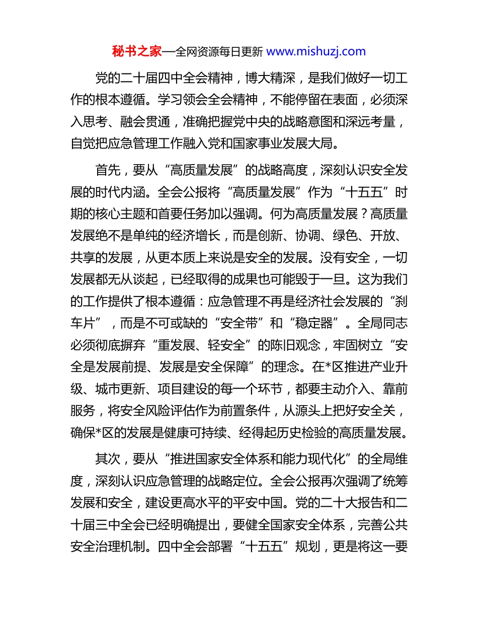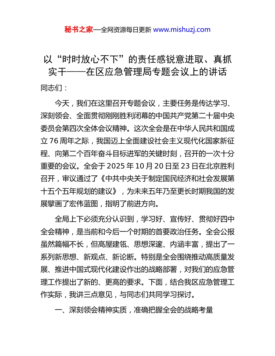 秘书之家—全网资源每日更新 www.mishuzj.com以“时时放心不下”的责任感锐意进取、真抓实干——在区应急管理局专题会议上的讲话同志们:今天,我们在这里召开专题会议,主要任务是传达学习、深刻领会、全面贯彻刚刚胜利闭幕的中国共产党第二十届中央委员会第四次全体会议精神。这次全会是在中华人民共和国成立 76 周年之际,我国迈上全面建设社会主义现代化国家新征程、向第二个百年奋斗目标进军的关键时刻,召开的一次十分重要的会议。全会于 2025 年 10 月 20 日至 23 日在北京胜利召开,审议通过了《中共中央关于制定国民经济和社会发展第十五个五年规划的建议》,为未来五年乃至更长时期我国的发展擘画了宏伟蓝图,指明了前进方向。全局上下必须充分认识到,学习好、宣传好、贯彻好四中全会精神,是当前和今后一个时期的首要政治任务。全会公报虽然篇幅不长,但高屋建瓴、思想深邃、内涵丰富,提出了一系列新思想、新观点、新论断。特别是全会围绕推动高质量发展、推进中国式现代化建设作出的战略部署,对我们的应急管理工作提出了新的、更高的要求。下面,结合我区应急管理工作实际,我讲三点意见,与同志们共同学习探讨。一、深刻领会精神实质,准确把握全会的战略考量秘书之家—全网资源每日更新 www.mishuzj.com党的二十届四中全会精神,博大精深,是我们做好一切工作的根本遵循。学习领会全会精神,不能停留在表面,必须深入思考、融会贯通,准确把握党中央的战略意图和深远考量,自觉把应急管理工作融入党和国家事业发展大局。首先,要从“高质量发展”的战略高度,深刻认识安全发展的时代内涵。全会公报将“高质量发展”作为“十五五”时期的核心主题和首要任务加以强调。何为高质量发展?高质量发展绝不是单纯的经济增长,而是创新、协调、绿色、开放、共享的发展,从更本质上来说是安全的发展。没有安全,一切发展都无从谈起,已经取得的成果也可能毁于一旦。这为我们的工作提供了根本遵循:应急管理不再是经济社会发展的“刹车片”,而是不可或缺的“安全带”和“稳定器”。全局同志必须彻底摒弃“重发展、轻安全”的陈旧观念,牢固树立“安全是发展前提、发展是安全保障”的理念。在*区推进产业升级、城市更新、项目建设的每一个环节,都要主动介入、靠前服务,将安全风险评估作为前置条件,从源头上把好安全关,确保*区的发展是健康可持续、经得起历史检验的高质量发展。其次,要从“推进国家安全体系和能力现代化”的全局维度,深刻认识应急管理的战略定位。全会公报再次强调了统筹发展和安全,建设更高水平的平安中国。党的二十大报告和二十届三中全会已经明确提出,要健全国家安全体系,完善公共安全治理机制。四中全会部署“十五五”规划,更是将这一要秘书之家—全网资源每日更新 www.mishuzj.com求具体化、实践化。这标志着党中央正以前所未有的力度,构建“大安全、大应急”格局。应急管理作为国家治理体系和治理能力现代化的重要组成部分,其职能已远远超越了传统意义上的安全生产监督和抢险救灾的范畴。它关乎人民群众生命财产安全,关乎社会大局稳定,是国家安全的重要基石。因此,我们的工作视野要更加开阔,工作格局要更加宏大。不能仅仅满足于“就事故抓事故”,而是要站在维护政治安全、经济安全、社会安全的战略高度,审视和谋划*区的应急管理工作,将防范化解重大安全风险作为核心任务,切实担负起“促一方发展、保一方平安”的政治责任。再次,要从“以中国式现代化全面推进强国建设”的历史进程中,深刻认识应急管理现代化的必然要求。全会描绘了以中国式现代化全面推进强国建设、民族复兴伟业的宏伟前景。一个现代化的强国,必然拥有一流的应急管理体系和能力。回顾应急管理部组建以来的历程,我国应急管理事业实现了系统性、整体性、重构性变革。面向“十五五”,我们的现代化建设必须提速升级。这意味着我们的理念、制度、装备、技术和人才都要向现代化标准看齐。要积极拥抱新一轮科技革命,将大数据、人工智能、物联网等前沿技术深度应用于风险监测、预警发布、指挥调度、救援实战等各个环节,推动应急管理从“人力密集型”向...