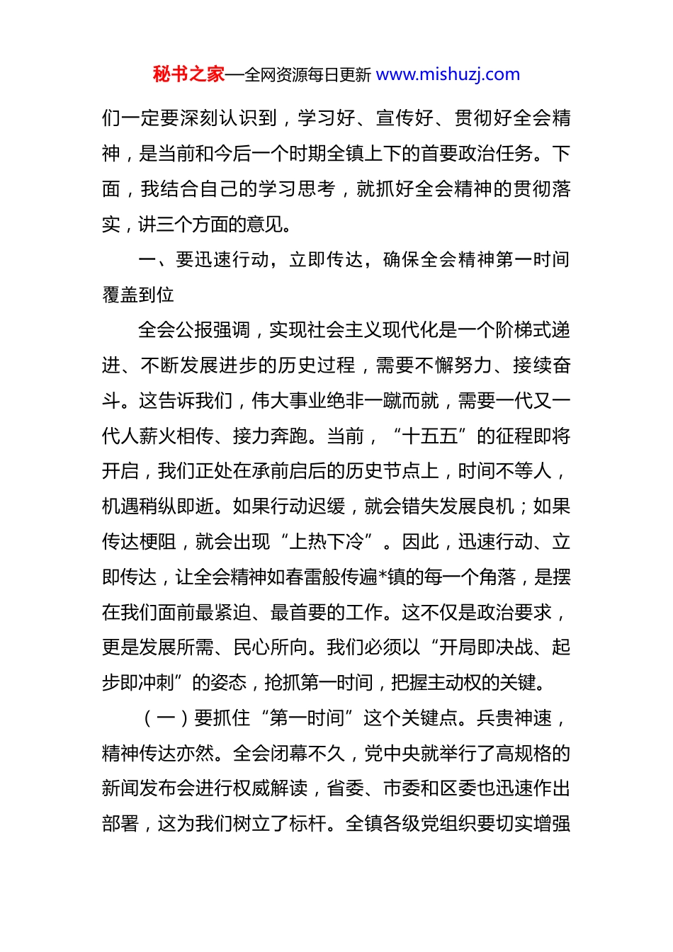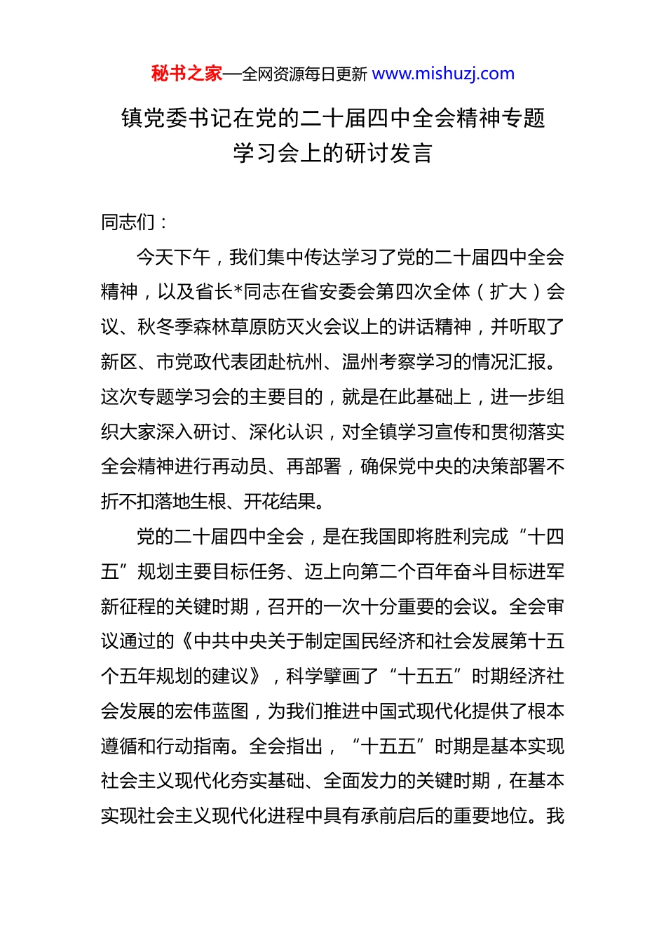 秘书之家—全网资源每日更新 www.mishuzj.com镇党委书记在党的二十届四中全会精神专题学习会上的研讨发言 同志们:今天下午,我们集中传达学习了党的二十届四中全会精神,以及省长*同志在省安委会第四次全体(扩大)会议、秋冬季森林草原防灭火会议上的讲话精神,并听取了新区、市党政代表团赴杭州、温州考察学习的情况汇报。这次专题学习会的主要目的,就是在此基础上,进一步组织大家深入研讨、深化认识,对全镇学习宣传和贯彻落实全会精神进行再动员、再部署,确保党中央的决策部署不折不扣落地生根、开花结果。党的二十届四中全会,是在我国即将胜利完成“十四五”规划主要目标任务、迈上向第二个百年奋斗目标进军新征程的关键时期,召开的一次十分重要的会议。全会审议通过的《中共中央关于制定国民经济和社会发展第十五个五年规划的建议》,科学擘画了“十五五”时期经济社会发展的宏伟蓝图,为我们推进中国式现代化提供了根本遵循和行动指南。全会指出,“十五五”时期是基本实现社会主义现代化夯实基础、全面发力的关键时期,在基本实现社会主义现代化进程中具有承前启后的重要地位。我秘书之家—全网资源每日更新 www.mishuzj.com们一定要深刻认识到,学习好、宣传好、贯彻好全会精神,是当前和今后一个时期全镇上下的首要政治任务。下面,我结合自己的学习思考,就抓好全会精神的贯彻落实,讲三个方面的意见。一、要迅速行动,立即传达,确保全会精神第一时间覆盖到位全会公报强调,实现社会主义现代化是一个阶梯式递进、不断发展进步的历史过程,需要不懈努力、接续奋斗。这告诉我们,伟大事业绝非一蹴而就,需要一代又一代人薪火相传、接力奔跑。当前,“十五五”的征程即将开启,我们正处在承前启后的历史节点上,时间不等人,机遇稍纵即逝。如果行动迟缓,就会错失发展良机;如果传达梗阻,就会出现“上热下冷”。因此,迅速行动、立即传达,让全会精神如春雷般传遍*镇的每一个角落,是摆在我们面前最紧迫、最首要的工作。这不仅是政治要求,更是发展所需、民心所向。我们必须以“开局即决战、起步即冲刺”的姿态,抢抓第一时间,把握主动权的关键。(一)要抓住“第一时间”这个关键点。兵贵神速,精神传达亦然。全会闭幕不久,党中央就举行了高规格的新闻发布会进行权威解读,省委、市委和区委也迅速作出部署,这为我们树立了标杆。全镇各级党组织要切实增强秘书之家—全网资源每日更新 www.mishuzj.com政治敏锐性和行动紧迫感,把传达学习全会精神作为当前头等大事。散会后,各村党支部、各站办所党组织要立即行动起来,绝不能有“等一等、看一看”的想法,必须在未来 24 小时内组织召开本支部、本部门的专题会议,将今天会议的精神,特别是全会公报和《建议》的核心要义,原原本本、不加遗漏地传达到每一位党员干部。这“第一时间”不仅体现在速度上,更体现在态度和决心上,体现了我们对党中央决策部署的坚决拥护和快速反应能力。(二)要覆盖“全员参与”这个基本面。全会精神是指导全国各项工作的总纲领,其落地落实需要凝聚最广泛的力量。如果学习传达出现“断层”或“死角”,就会影响整体的执行效果。因此,我们的传达学习必须实现全员覆盖,确保从镇领导班子成员到普通党员干部,从村社干部到基层群众中的党员,甚至包括流动党员、离退休党员,一个都不能少。要采取灵活多样的方式,比如针对行动不便的老党员送学上门,针对外出流动党员利用线上视频会议、学习资料包发送等方式,确保将全会精神传达到每一名党员干部群众。要通过这种“横向到边、纵向到底”的全覆盖传达,使大家都能及时了解党中央的最新精神和国家未来五年的发展蓝图,进一步增强“四个意识”、坚定“四个自信”、做到“两个维护”,始终保持秘书之家—全网资源每日更新 www.mishuzj.com战略定力,坚定发展信心。(三)要构建“传达学习”这个有机体。传达不是简单“念文件”,学习也不是“一阵风”,而是要形成一个有生命力、能循环的学习传达有机体。这个有机体,起点是原原本本学,核心是联系实际学,目标是融会贯通学。首先,要引导大家静下心来读原著、学原文、悟原理,认真...