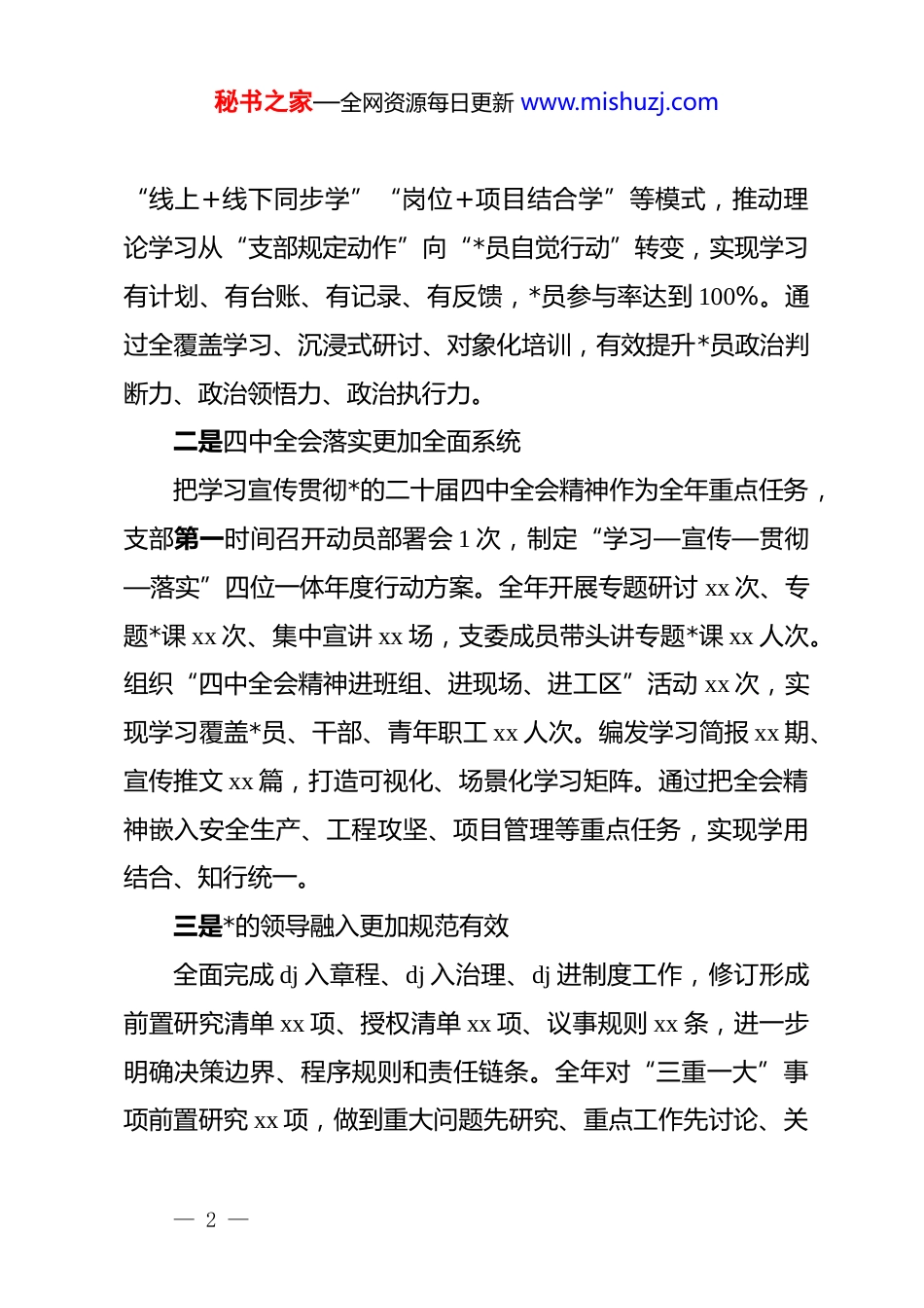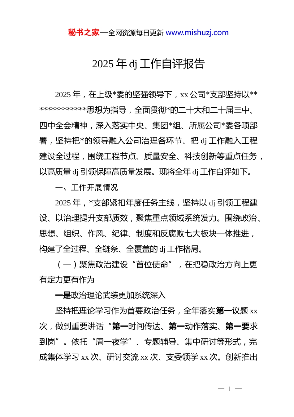 秘书之家—全网资源每日更新 www.mishuzj.com2025 年 dj 工作自评报告2025 年,在上级*委的坚强领导下,xx 公司*支部坚持以**************思想为指导,全面贯彻*的二十大和二十届三中、四中全会精神,深入落实中央、集团*组、所属公司*委各项部署,坚持把*的领导融入公司治理各环节、把 dj 工作融入工程建设全过程,围绕工程节点、质量安全、科技创新等重点任务,以高质量 dj 引领保障高质量发展。现将全年 dj 工作自评如下。一、工作开展情况2025 年,*支部紧扣年度任务主线,坚持以 dj 引领工程建设、以治理提升支部质效,聚焦重点领域系统发力。围绕政治、思想、组织、作风、纪律、制度和反腐败七大板块一体推进,构建了全过程、全链条、全覆盖的 dj 工作格局。(一)聚焦政治建设“首位使命”,在把稳政治方向上更有定力更有作为一是政治理论武装更加系统深入坚持把理论学习作为首要政治任务,全年落实第一议题 xx次,做到重要讲话“第一时间传达、第一动作落实、第一要求到岗”。依托“周一夜学”、专题辅导、集中研讨等形式,完成集体学习 xx 次、研讨交流 xx 次、支委领学 xx 次。创新推出— 1 —秘书之家—全网资源每日更新 www.mishuzj.com“线上+线下同步学”“岗位+项目结合学”等模式,推动理论学习从“支部规定动作”向“*员自觉行动”转变,实现学习有计划、有台账、有记录、有反馈,*员参与率达到 100%。通过全覆盖学习、沉浸式研讨、对象化培训,有效提升*员政治判断力、政治领悟力、政治执行力。二是四中全会落实更加全面系统把学习宣传贯彻*的二十届四中全会精神作为全年重点任务,支部第一时间召开动员部署会 1 次,制定“学习—宣传—贯彻—落实”四位一体年度行动方案。全年开展专题研讨 xx 次、专题*课 xx 次、集中宣讲 xx 场,支委成员带头讲专题*课 xx 人次。组织“四中全会精神进班组、进现场、进工区”活动 xx 次,实现学习覆盖*员、干部、青年职工 xx 人次。编发学习简报 xx 期、宣传推文 xx 篇,打造可视化、场景化学习矩阵。通过把全会精神嵌入安全生产、工程攻坚、项目管理等重点任务,实现学用结合、知行统一。三是*的领导融入更加规范有效全面完成 dj 入章程、dj 入治理、dj 进制度工作,修订形成前置研究清单 xx 项、授权清单 xx 项、议事规则 xx 条,进一步明确决策边界、程序规则和责任链条。全年对“三重一大”事项前置研究 xx 项,做到重大问题先研究、重点工作先讨论、关— 2 —秘书之家—全网资源每日更新 www.mishuzj.com键环节先把关。严格执行请示报告制度 xx 次,重大事项全部履行集体研究程序。开展 dj 与治理融合专项督导 xx 次,推动*的领导在公司治理中“看得见、落得下、见成效”,有效确保工程建设方向不偏、决策不乱、执行不松。(二)聚焦思想建设“固本工程”,在深化理论武装上更显力度更见成效一是⑧项规定精神更加严实见效把中央⑧项规定精神学习教育贯穿全年,以节点为抓手,以制度为牵引,以监督为保障。全年开展专题学习 xx 次、集体廉政谈话 xx 人次、节前提醒短信 xx 条、典型案例剖析 xx 次,推动*员干部知敬畏、存戒惧。围绕违规收送礼品礼金、公车使用、差旅报销、公务接待、工程管理等重点领域专项排查 xx 次,发现整改问题 xx 项,完善制度措施 xx 条,实现“常提醒、常预警、常监督、常纠偏”。通过制定《年度作风建设任务清单》xx 项,使作风建设真正成为推动工程建设提速提质的硬支撑、硬作风、硬保证。二是意识形态阵地更加安全可控全面落实意识形态工作责任制,建立“月研判、季分析、年报告”机制。全年召开意识形态专题会议 xx 次,开展舆情风险研判 xx 次、网络巡查 xx 次、宣传内容审核 xx 次,未发生意— 3 —秘书之家—全网资源每日更新 www.mishuzj.com识形态风险事件。紧扣“世界水日”“安全生产月”“防汛宣传季”等重点节点,组织主题宣传 xx 次、发布原创推文 xx 篇、设计可视化海报 xx 张,增强正面宣传传播力。强化网络行为规范教育 xx 次,覆盖干部职工 xx 人次,做到正面发声更...