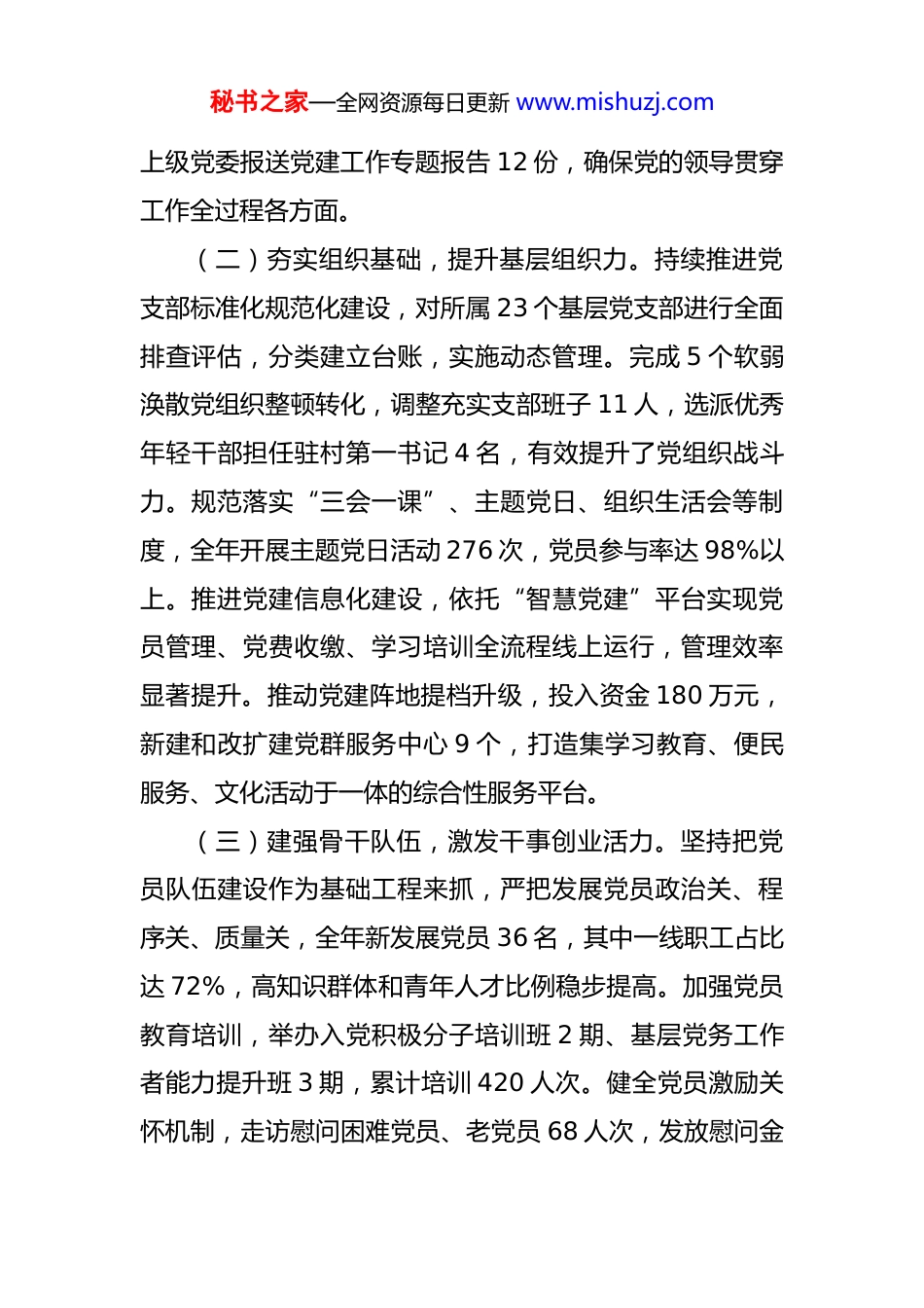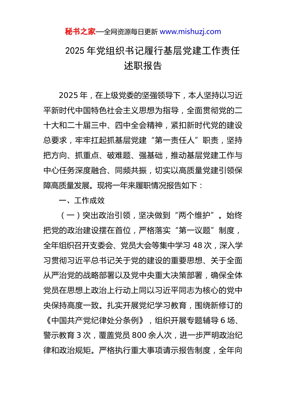 秘书之家—全网资源每日更新 www.mishuzj.com2025 年党组织书记履行基层党建工作责任述职报告 2025 年,在上级党委的坚强领导下,本人坚持以习近平新时代中国特色社会主义思想为指导,全面贯彻党的二十大和二十届三中、四中全会精神,紧扣新时代党的建设总要求,牢牢扛起抓基层党建“第一责任人”职责,坚持把方向、抓重点、破难题、强基础,推动基层党建工作与中心任务深度融合、同频共振,切实以高质量党建引领保障高质量发展。现将一年来履职情况报告如下:一、工作成效(一)突出政治引领,坚决做到“两个维护”。始终把党的政治建设摆在首位,严格落实“第一议题”制度,全年组织召开支委会、党员大会等集中学习 48 次,深入学习贯彻习近平总书记关于党的建设的重要思想、关于全面从严治党的战略部署以及党中央重大决策部署,确保全体党员在思想上政治上行动上同以习近平同志为核心的党中央保持高度一致。扎实开展党纪学习教育,围绕新修订的《中国共产党纪律处分条例》,组织开展专题辅导 6 场、警示教育 3 次,覆盖党员 800 余人次,进一步严明政治纪律和政治规矩。严格执行重大事项请示报告制度,全年向秘书之家—全网资源每日更新 www.mishuzj.com上级党委报送党建工作专题报告 12 份,确保党的领导贯穿工作全过程各方面。(二)夯实组织基础,提升基层组织力。持续推进党支部标准化规范化建设,对所属 23 个基层党支部进行全面排查评估,分类建立台账,实施动态管理。完成 5 个软弱涣散党组织整顿转化,调整充实支部班子 11 人,选派优秀年轻干部担任驻村第一书记 4 名,有效提升了党组织战斗力。规范落实“三会一课”、主题党日、组织生活会等制度,全年开展主题党日活动 276 次,党员参与率达 98%以上。推进党建信息化建设,依托“智慧党建”平台实现党员管理、党费收缴、学习培训全流程线上运行,管理效率显著提升。推动党建阵地提档升级,投入资金 180 万元,新建和改扩建党群服务中心 9 个,打造集学习教育、便民服务、文化活动于一体的综合性服务平台。(三)建强骨干队伍,激发干事创业活力。坚持把党员队伍建设作为基础工程来抓,严把发展党员政治关、程序关、质量关,全年新发展党员 36 名,其中一线职工占比达 72%,高知识群体和青年人才比例稳步提高。加强党员教育培训,举办入党积极分子培训班 2 期、基层党务工作者能力提升班 3 期,累计培训 420 人次。健全党员激励关怀机制,走访慰问困难党员、老党员 68 人次,发放慰问金秘书之家—全网资源每日更新 www.mishuzj.com15.6 万元;表彰先进基层党组织 8 个、优秀共产党员 32名、优秀党务工作者 15 名,营造比学赶超浓厚氛围。强化典型引路,挖掘宣传“党员先锋岗”“红色工匠”等先进事迹 12 例,在主流媒体刊发报道 23 篇,充分发挥示范带动效应。(四)深化融合赋能,推动党建与业务同向发力。牢固树立“围绕发展抓党建、抓好党建促发展”理念,积极探索党建与生产经营、乡村振兴、社会治理等重点工作深度融合路径。在企业领域,设立“党员责任区”“党员突击队”45 个,组织党员在技术攻关、安全生产、节能降耗等方面发挥带头作用,推动某重点项目提前两个月竣工投产。在农村一线,推行“党支部+合作社+农户”发展模式,培育壮大村集体经济项目 21 个,带动群众增收致富。在城市社区,构建“网格党支部—楼栋党小组—党员中心户”三级治理体系,组建志愿服务队 37 支,解决居民急难愁盼问题 160 余件,群众满意度达 96.3%。特别是在应对极端天气、防汛抗灾等关键时刻,广大党员冲锋在前、连续奋战,让党旗在一线高高飘扬。(五)强化正风肃纪,营造风清气正政治生态。严格落实全面从严治党主体责任,定期研究党风廉政建设工作,制定年度任务清单,逐级签订责任书 67 份。加强对重秘书之家—全网资源每日更新 www.mishuzj.com点领域和关键岗位的监督制约,组织开展廉政风险点排查,梳理风险隐患 89 项,制定防控措施 132 条。持之以恒纠治“四风”,紧盯节日期间违规吃喝、公款旅游等问题,开展明察暗访 8 次,通报典型案例 3 ...