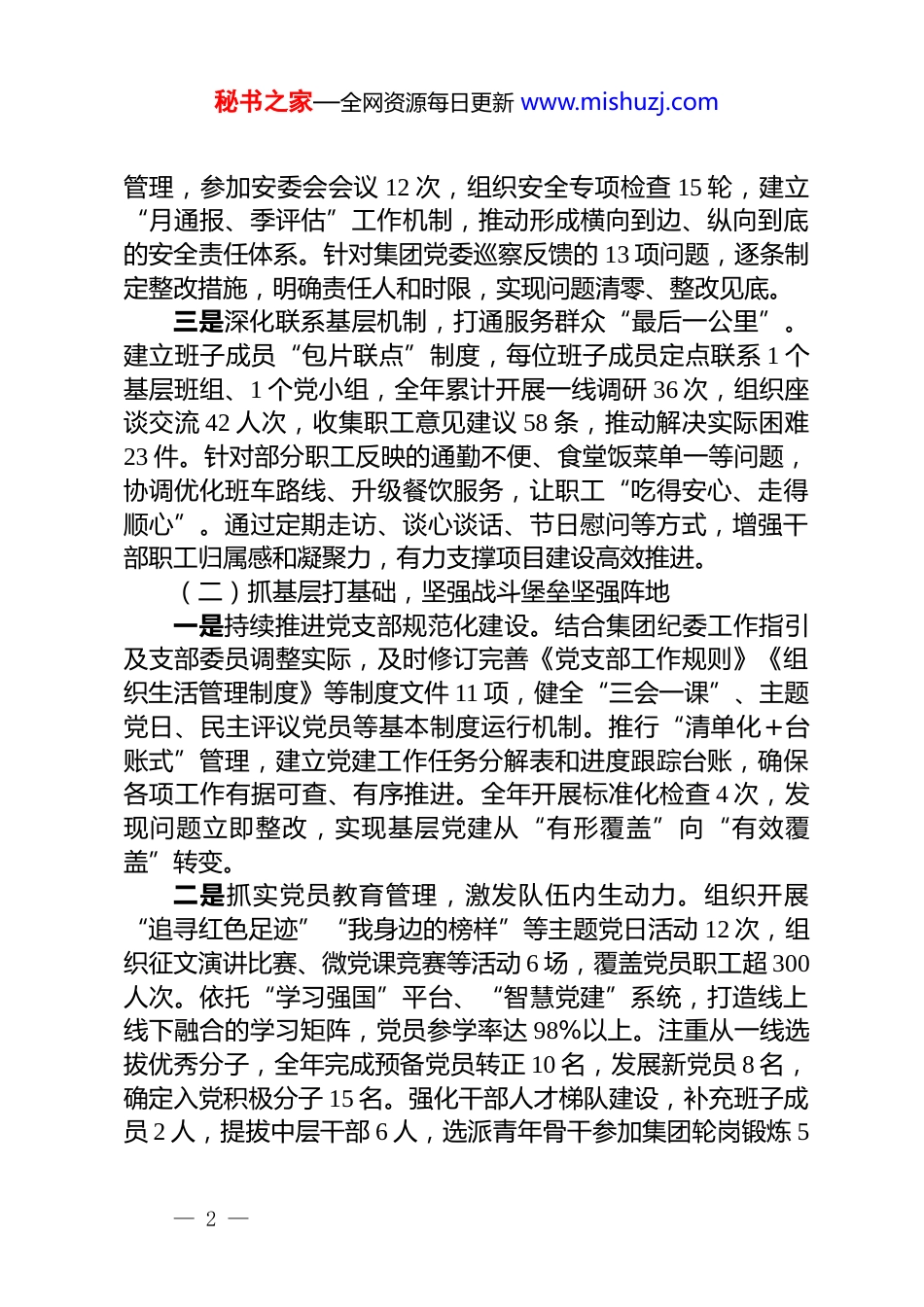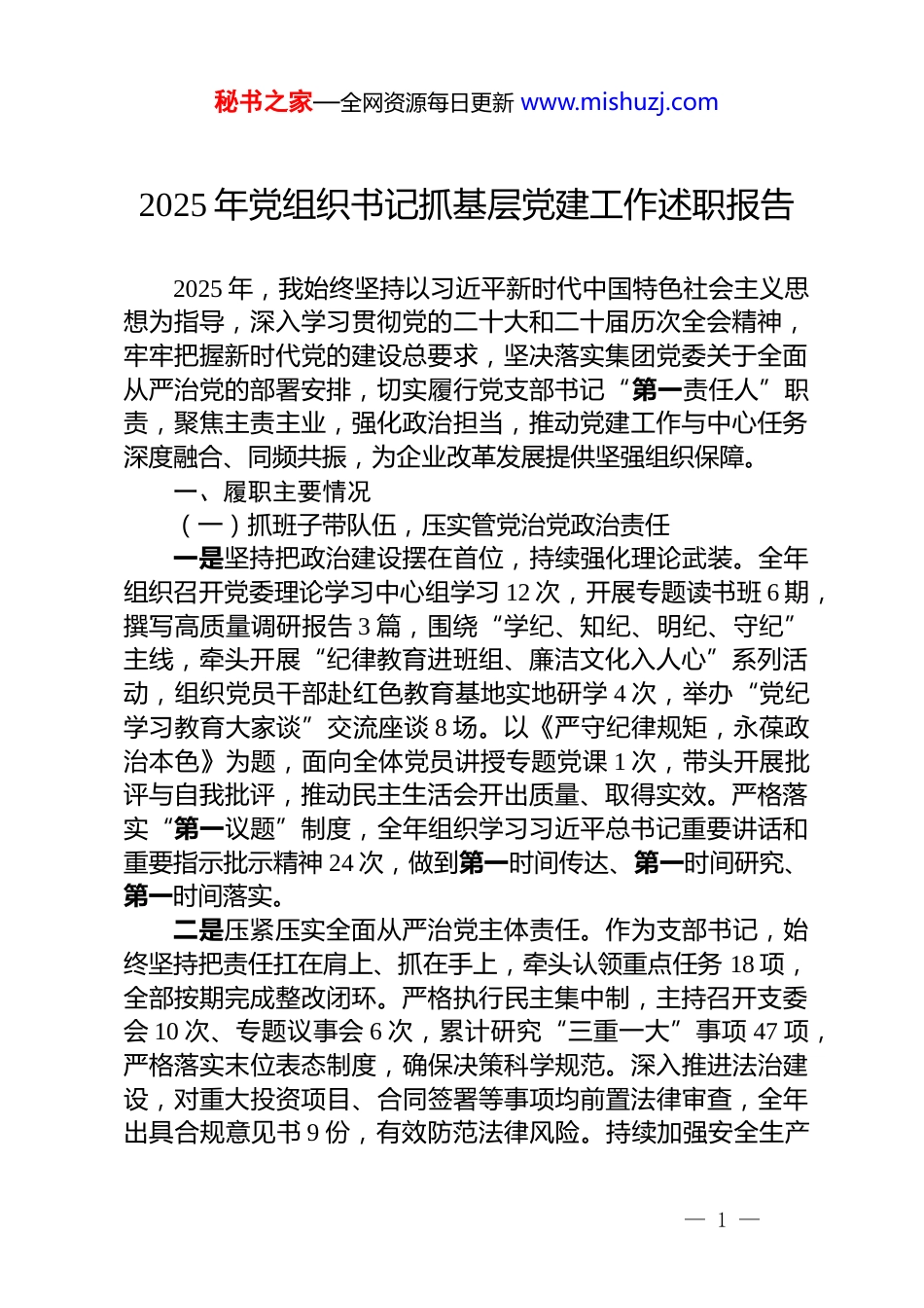 秘书之家—全网资源每日更新 www.mishuzj.com2025 年党组织书记抓基层党建工作述职报告2025 年,我始终坚持以习近平新时代中国特色社会主义思想为指导,深入学习贯彻党的二十大和二十届历次全会精神,牢牢把握新时代党的建设总要求,坚决落实集团党委关于全面从严治党的部署安排,切实履行党支部书记“第一责任人”职责,聚焦主责主业,强化政治担当,推动党建工作与中心任务深度融合、同频共振,为企业改革发展提供坚强组织保障。一、履职主要情况(一)抓班子带队伍,压实管党治党政治责任一是坚持把政治建设摆在首位,持续强化理论武装。全年组织召开党委理论学习中心组学习 12 次,开展专题读书班 6 期,撰写高质量调研报告 3 篇,围绕“学纪、知纪、明纪、守纪”主线,牵头开展“纪律教育进班组、廉洁文化入人心”系列活动,组织党员干部赴红色教育基地实地研学 4 次,举办“党纪学习教育大家谈”交流座谈 8 场。以《严守纪律规矩,永葆政治本色》为题,面向全体党员讲授专题党课 1 次,带头开展批评与自我批评,推动民主生活会开出质量、取得实效。严格落实“第一议题”制度,全年组织学习习近平总书记重要讲话和重要指示批示精神 24 次,做到第一时间传达、第一时间研究、第一时间落实。二是压紧压实全面从严治党主体责任。作为支部书记,始终坚持把责任扛在肩上、抓在手上,牵头认领重点任务 18 项,全部按期完成整改闭环。严格执行民主集中制,主持召开支委会 10 次、专题议事会 6 次,累计研究“三重一大”事项 47 项,严格落实末位表态制度,确保决策科学规范。深入推进法治建设,对重大投资项目、合同签署等事项均前置法律审查,全年出具合规意见书 9 份,有效防范法律风险。持续加强安全生产— 1 —秘书之家—全网资源每日更新 www.mishuzj.com管理,参加安委会会议 12 次,组织安全专项检查 15 轮,建立“月通报、季评估”工作机制,推动形成横向到边、纵向到底的安全责任体系。针对集团党委巡察反馈的 13 项问题,逐条制定整改措施,明确责任人和时限,实现问题清零、整改见底。三是深化联系基层机制,打通服务群众“最后一公里”。建立班子成员“包片联点”制度,每位班子成员定点联系 1 个基层班组、1 个党小组,全年累计开展一线调研 36 次,组织座谈交流 42 人次,收集职工意见建议 58 条,推动解决实际困难23 件。针对部分职工反映的通勤不便、食堂饭菜单一等问题,协调优化班车路线、升级餐饮服务,让职工“吃得安心、走得顺心”。通过定期走访、谈心谈话、节日慰问等方式,增强干部职工归属感和凝聚力,有力支撑项目建设高效推进。(二)抓基层打基础,坚强战斗堡垒坚强阵地一是持续推进党支部规范化建设。结合集团纪委工作指引及支部委员调整实际,及时修订完善《党支部工作规则》《组织生活管理制度》等制度文件 11 项,健全“三会一课”、主题党日、民主评议党员等基本制度运行机制。推行“清单化+台账式”管理,建立党建工作任务分解表和进度跟踪台账,确保各项工作有据可查、有序推进。全年开展标准化检查 4 次,发现问题立即整改,实现基层党建从“有形覆盖”向“有效覆盖”转变。二是抓实党员教育管理,激发队伍内生动力。组织开展“追寻红色足迹”“我身边的榜样”等主题党日活动 12 次,组织征文演讲比赛、微党课竞赛等活动 6 场,覆盖党员职工超 300人次。依托“学习强国”平台、“智慧党建”系统,打造线上线下融合的学习矩阵,党员参学率达 98%以上。注重从一线选拔优秀分子,全年完成预备党员转正 10 名,发展新党员 8 名,确定入党积极分子 15 名。强化干部人才梯队建设,补充班子成员 2 人,提拔中层干部 6 人,选派青年骨干参加集团轮岗锻炼 5— 2 —秘书之家—全网资源每日更新 www.mishuzj.com人,初步构建起结构合理、素质优良的人才队伍。(三)抓宣传树典型,筑牢意识形态前沿阵地一是牢牢掌握意识形态工作主动权。严格落实意识形态工作责任制,签订责任书 12 份,组织召开专题研判会 4 次,报送意识形态分析报告 6 期,建立信息发布“双审双签”机制,...