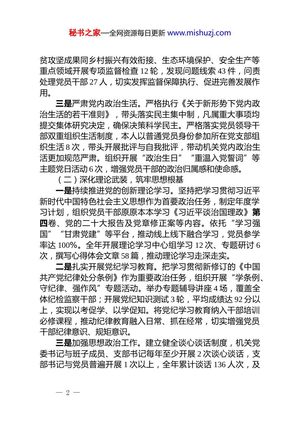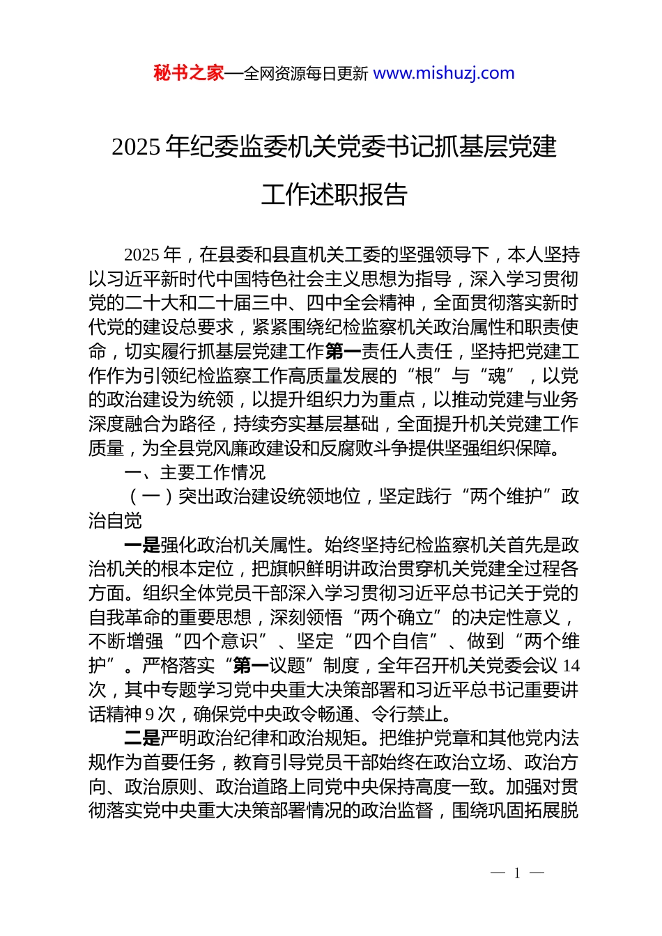 秘书之家—全网资源每日更新 www.mishuzj.com2025 年纪委监委机关党委书记抓基层党建工作述职报告2025 年,在县委和县直机关工委的坚强领导下,本人坚持以习近平新时代中国特色社会主义思想为指导,深入学习贯彻党的二十大和二十届三中、四中全会精神,全面贯彻落实新时代党的建设总要求,紧紧围绕纪检监察机关政治属性和职责使命,切实履行抓基层党建工作第一责任人责任,坚持把党建工作作为引领纪检监察工作高质量发展的“根”与“魂”,以党的政治建设为统领,以提升组织力为重点,以推动党建与业务深度融合为路径,持续夯实基层基础,全面提升机关党建工作质量,为全县党风廉政建设和反腐败斗争提供坚强组织保障。一、主要工作情况(一)突出政治建设统领地位,坚定践行“两个维护”政治自觉一是强化政治机关属性。始终坚持纪检监察机关首先是政治机关的根本定位,把旗帜鲜明讲政治贯穿机关党建全过程各方面。组织全体党员干部深入学习贯彻习近平总书记关于党的自我革命的重要思想,深刻领悟“两个确立”的决定性意义,不断增强“四个意识”、坚定“四个自信”、做到“两个维护”。严格落实“第一议题”制度,全年召开机关党委会议 14次,其中专题学习党中央重大决策部署和习近平总书记重要讲话精神 9 次,确保党中央政令畅通、令行禁止。二是严明政治纪律和政治规矩。把维护党章和其他党内法规作为首要任务,教育引导党员干部始终在政治立场、政治方向、政治原则、政治道路上同党中央保持高度一致。加强对贯彻落实党中央重大决策部署情况的政治监督,围绕巩固拓展脱— 1 —秘书之家—全网资源每日更新 www.mishuzj.com贫攻坚成果同乡村振兴有效衔接、生态环境保护、安全生产等重点领域开展专项监督检查 12 轮,发现问题线索 43 件,问责处理党员干部 27 人,切实发挥监督保障执行、促进完善发展作用。三是严肃党内政治生活。严格执行《关于新形势下党内政治生活的若干准则》,带头落实民主集中制,凡属重大事项均提交集体研究决定,确保决策科学民主。严格落实党员领导干部双重组织生活制度,本人以普通党员身份参加所在党支部组织生活 8 次,带头开展批评与自我批评,带动机关党内政治生活更加规范严肃。组织开展“政治生日”“重温入党誓词”等主题党日活动 6 次,增强党员干部的政治归属感和使命感。(二)深化理论武装,筑牢思想根基一是持续推进党的创新理论学习。坚持把学习贯彻习近平新时代中国特色社会主义思想作为首要政治任务,制定年度学习计划,组织党员干部原原本本学习《习近平谈治国理政》第四卷、党的二十大报告及党章修正案等内容。依托“学习强国”“甘肃党建”等平台,推动线上线下融合学习,党员参学率达 100%。全年开展理论学习中心组学习 12 次、专题研讨 6次,撰写心得体会文章 58 篇,推动理论学习走深走实。二是扎实开展党纪学习教育。把学习贯彻新修订的《中国共产党纪律处分条例》作为重要政治任务,组织开展“学条例、守纪律、强作风”专题活动。举办专题辅导讲座 4 场,覆盖全体纪检监察干部;开展党纪知识测试 3 轮,平均成绩达 92 分以上,实现以考促学、以学促知。将党纪学习教育纳入干部培训必修课程,推动纪律教育融入日常、抓在经常,切实增强党员干部纪律意识、规矩意识。三是加强思想政治工作。建立健全谈心谈话制度,机关党委书记与班子成员、支部书记每年至少开展 2 次谈心谈话,支部书记与党员普遍开展 1 次以上,全年累计谈话 136 人次,及— 2 —秘书之家—全网资源每日更新 www.mishuzj.com时掌握干部思想动态,化解苗头性问题。注重人文关怀,对家庭困难、患病住院的党员干部及时走访慰问,传递组织温暖,增强队伍凝聚力。(三)夯实组织基础,提升基层党组织战斗力一是推进党支部标准化规范化建设。严格落实《中国共产党支部工作条例(试行)》,聚焦“五个基本”要求,持续加强机关党支部建设。优化党支部设置,根据内设机构调整重新划分党小组,选优配强支部班子,新任命支部委员 6 名。严格执行“三会一课”、主题党日、组织生活会、民主评议党员等制度,全年召开支部党员大会 1...