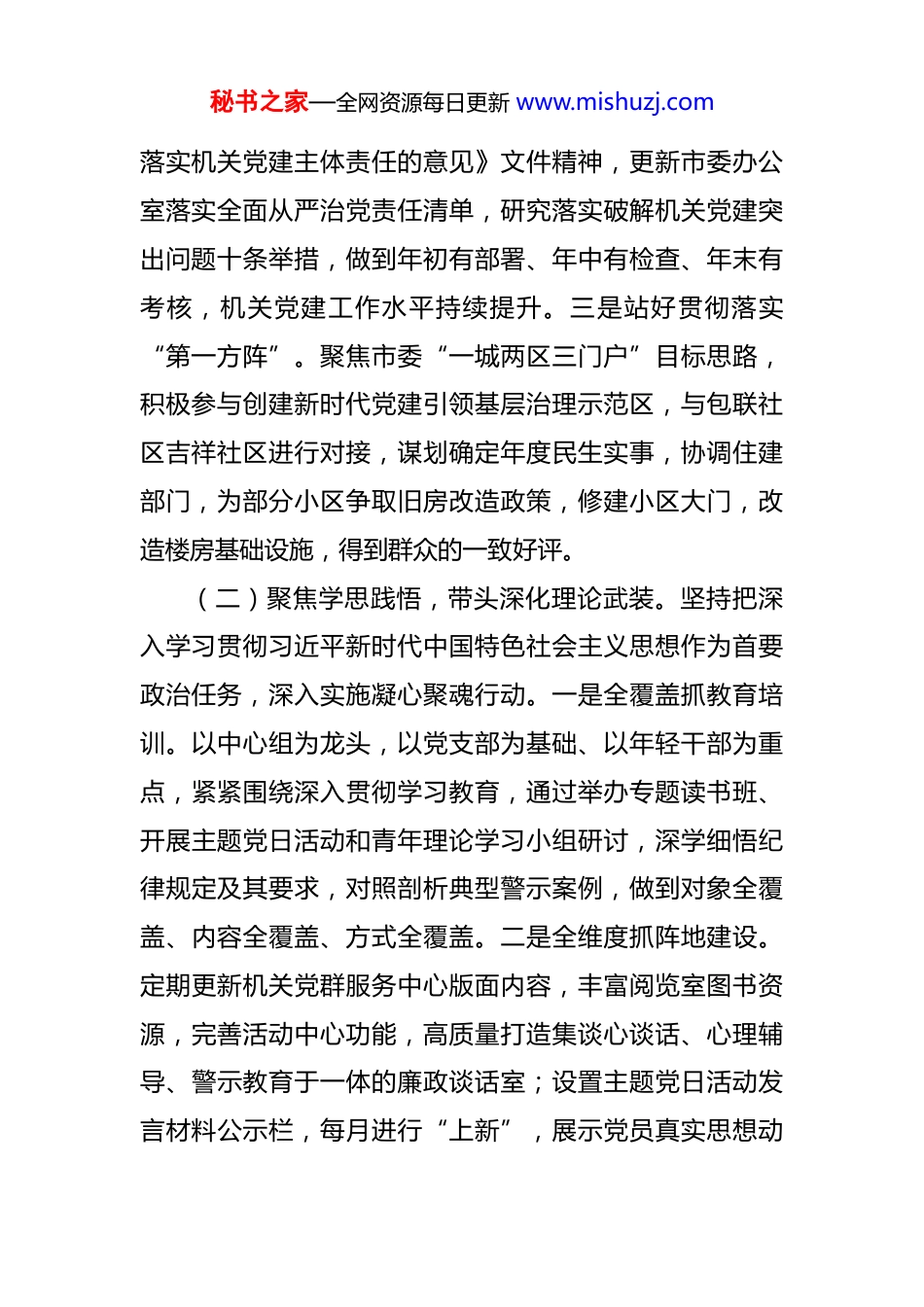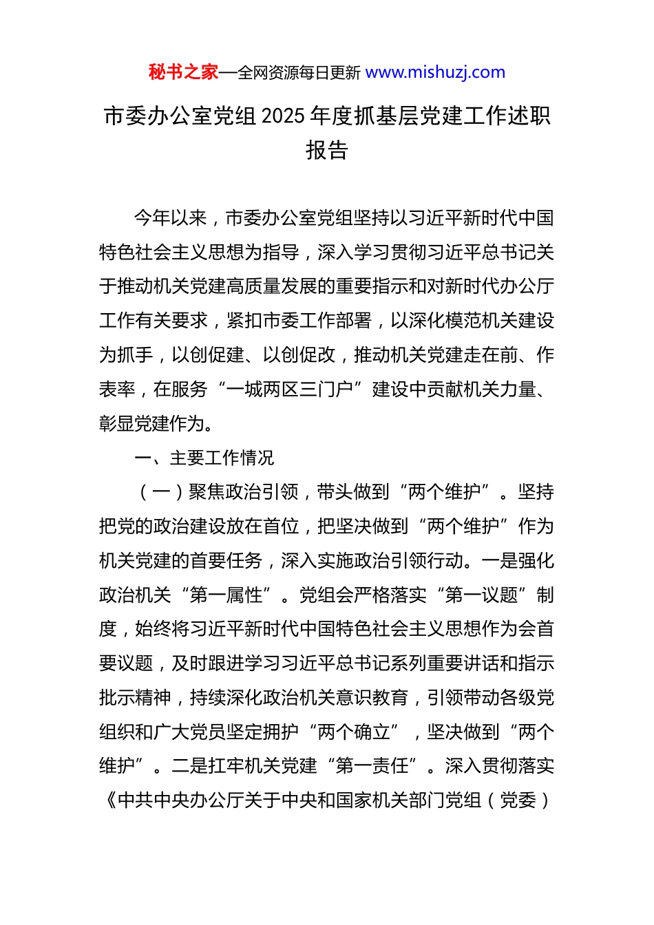 秘书之家—全网资源每日更新 www.mishuzj.com市委办公室党组 2025 年度抓基层党建工作述职报告 今年以来,市委办公室党组坚持以习近平新时代中国特色社会主义思想为指导,深入学习贯彻习近平总书记关于推动机关党建高质量发展的重要指示和对新时代办公厅工作有关要求,紧扣市委工作部署,以深化模范机关建设为抓手,以创促建、以创促改,推动机关党建走在前、作表率,在服务“一城两区三门户”建设中贡献机关力量、彰显党建作为。一、主要工作情况(一)聚焦政治引领,带头做到“两个维护”。坚持把党的政治建设放在首位,把坚决做到“两个维护”作为机关党建的首要任务,深入实施政治引领行动。一是强化政治机关“第一属性”。党组会严格落实“第一议题”制度,始终将习近平新时代中国特色社会主义思想作为会首要议题,及时跟进学习习近平总书记系列重要讲话和指示批示精神,持续深化政治机关意识教育,引领带动各级党组织和广大党员坚定拥护“两个确立”,坚决做到“两个维护”。二是扛牢机关党建“第一责任”。深入贯彻落实《中共中央办公厅关于中央和国家机关部门党组(党委)秘书之家—全网资源每日更新 www.mishuzj.com落实机关党建主体责任的意见》文件精神,更新市委办公室落实全面从严治党责任清单,研究落实破解机关党建突出问题十条举措,做到年初有部署、年中有检查、年末有考核,机关党建工作水平持续提升。三是站好贯彻落实“第一方阵”。聚焦市委“一城两区三门户”目标思路,积极参与创建新时代党建引领基层治理示范区,与包联社区吉祥社区进行对接,谋划确定年度民生实事,协调住建部门,为部分小区争取旧房改造政策,修建小区大门,改造楼房基础设施,得到群众的一致好评。(二)聚焦学思践悟,带头深化理论武装。坚持把深入学习贯彻习近平新时代中国特色社会主义思想作为首要政治任务,深入实施凝心聚魂行动。一是全覆盖抓教育培训。以中心组为龙头,以党支部为基础、以年轻干部为重点,紧紧围绕深入贯彻学习教育,通过举办专题读书班、开展主题党日活动和青年理论学习小组研讨,深学细悟纪律规定及其要求,对照剖析典型警示案例,做到对象全覆盖、内容全覆盖、方式全覆盖。二是全维度抓阵地建设。定期更新机关党群服务中心版面内容,丰富阅览室图书资源,完善活动中心功能,高质量打造集谈心谈话、心理辅导、警示教育于一体的廉政谈话室;设置主题党日活动发言材料公示栏,每月进行“上新”,展示党员真实思想动秘书之家—全网资源每日更新 www.mishuzj.com态,搭建互学互鉴平台,促进经验做法交流共享,推动承诺事项落地见效。三是全方位抓实践转化。开展学习教育以来,党组坚持学查改一体推进,把学习教育成果转化为推动发展的实际成效。领导班子和领导干部、全体党员干部结合工作实际,对照清单进行问题查摆和集中整治,进一步树牢宗旨意识、弘扬务实作风、提振干事精气神。(三)聚焦强基固本,带头夯实基层基础。牢固树立大抓基层的鲜明导向,深入实施强基提质行动,不断增强党组织政治功能和组织功能。一是基层组织争先创优。注重健全组织,落实换届提醒、主题党日等长效机制,动态优化党支部设置,推动建设政治过硬、思想过硬、组织过硬、作风过硬、纪律过硬的机关党组织。注重规范提质,按照市直工委印发的《2025 年市直机关党建工作要点》,持续抓好“一党委一品牌、一支部一特色”建设,不断擦亮党委“忠诚枢纽”品牌,指导下属党组织开展“四强”党支部建设创建工作。二是党建业务互融互促。处理好“虚”与“实”的关系,“虚功”实做、“软功”硬做,充分发挥好党组织的政治优势、组织优势,做好“社区吹哨、党员报到”、整治形式主义为基层减负、机关精神文明建设等工作,做到机关党建与中心工作相融互促。三是党员管理有力有序。发挥基层党组织管到人头的特点,严秘书之家—全网资源每日更新 www.mishuzj.com把发展党员入口关,严格党员教育培训,举办党员教育封闭式培训班和“七一”故事分享会,组织 8 名发展对象和 8名预备党员参加培训班,2025 年党委新发展积极分子 2名,开展党员身份核查认定 3 人,转接党组织关系 19 人...