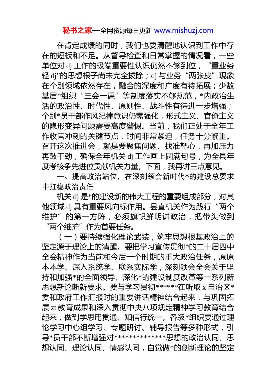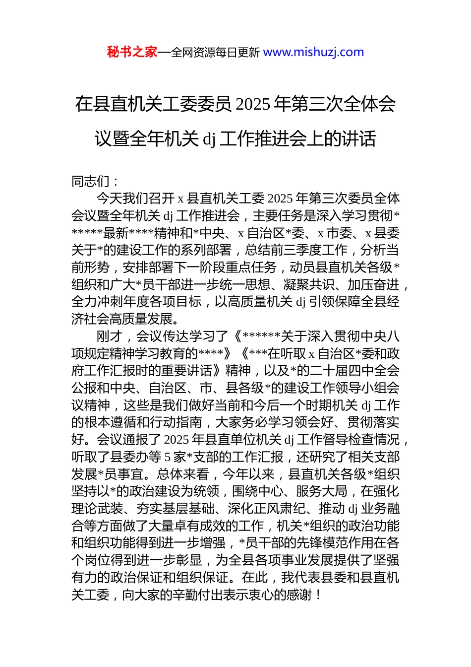 秘书之家—全网资源每日更新 www.mishuzj.com在县直机关工委委员 2025 年第三次全体会议暨全年机关 dj 工作推进会上的讲话同志们:今天我们召开 x 县直机关工委 2025 年第三次委员全体会议暨全年机关 dj 工作推进会,主要任务是深入学习贯彻******最新****精神和*中央、x 自治区*委、x 市委、x 县委关于*的建设工作的系列部署,总结前三季度工作,分析当前形势,安排部署下一阶段重点任务,动员县直机关各级*组织和广大*员干部进一步统一思想、凝聚共识、加压奋进,全力冲刺年度各项目标,以高质量机关 dj 引领保障全县经济社会高质量发展。刚才,会议传达学习了《******关于深入贯彻中央八项规定精神学习教育的****》《***在听取 x 自治区*委和政府工作汇报时的重要讲话》精神,以及*的二十届四中全会公报和中央、自治区、市、县各级*的建设工作领导小组会议精神,这些是我们做好当前和今后一个时期机关 dj 工作的根本遵循和行动指南,大家务必学习领会好、贯彻落实好。会议通报了 2025 年县直单位机关 dj 工作督导检查情况,听取了县委办等 5 家*支部的工作汇报,还研究了相关支部发展*员事宜。总体来看,今年以来,县直机关各级*组织坚持以*的政治建设为统领,围绕中心、服务大局,在强化理论武装、夯实基层基础、深化正风肃纪、推动 dj 业务融合等方面做了大量卓有成效的工作,机关*组织的政治功能和组织功能得到进一步增强,*员干部的先锋模范作用在各个岗位得到进一步彰显,为全县各项事业发展提供了坚强有力的政治保证和组织保证。在此,我代表县委和县直机关工委,向大家的辛勤付出表示衷心的感谢!秘书之家—全网资源每日更新 www.mishuzj.com在肯定成绩的同时,我们也要清醒地认识到工作中存在的短板和不足。从督导检查和日常掌握的情况看,一些单位对 dj 工作的极端重要性认识仍然不够到位,“重业务轻 dj”的思想根子尚未完全拔除;dj 与业务“两张皮”现象在个别领域依然存在,融合的深度和广度有待拓展;少数基层*组织“三会一课”等制度落实不够规范,*内政治生活的政治性、时代性、原则性、战斗性有待进一步增强;个别*员干部作风纪律意识仍需强化,形式主义、官僚主义的隐形变异问题需要高度警惕。当前,我们正处于全年工作收官冲刺的关键节点,时间非常紧迫,任务十分繁重。召开这次推进会,就是要聚焦问题、找准靶心,再加压力再鼓干劲,确保全年机关 dj 工作画上圆满句号,为全县年度考核争先进位贡献机关力量。下面,我再讲三点意见。一、提高政治站位,在深刻领会新时代*的建设总要求中扛稳政治责任机关 dj 是*的建设新的伟大工程的重要组成部分,对其他领域 dj 具有重要风向标作用。县直机关作为践行“两个维护”的第一方阵,必须旗帜鲜明讲政治,把带头做到“两个维护”作为首要任务。(一)要持续强化理论武装,筑牢思想根基政治上的坚定源于理论上的清醒。要把学习宣传贯彻*的二十届四中全会精神作为当前和今后一个时期的重大政治任务,原原本本学、深入系统学、联系实际学,深刻领会全会关于坚持和加强*的全面领导、深化*的建设制度改革等一系列新思想新论断新要求。要与学习贯彻******在听取 x 自治区*委和政府工作汇报时的重要讲话精神结合起来,与巩固拓展 zt 教育成果和深入贯彻中央八项规定精神学习教育结合起来,做到学思用贯通、知信行统一。各级*组织要通过理论学习中心组学习、专题研讨、辅导报告等多种形式,引导*员干部不断增强对**************思想的政治认同、思想认同、理论认同、情感认同,自觉做*的创新理论的坚定秘书之家—全网资源每日更新 www.mishuzj.com信仰者和忠实实践者。(二)要坚决扛起政治责任,压实主体责任管*治*,根本在责任,关键看行动。县直机关各单位*组织要坚决扛起全面从严治*主体责任,把 dj 工作摆在与业务工作同等重要的位置,做到同谋划、同部署、同推进。*组织书记作为第一责任人,必须牢固树立“抓好 dj 是本职、不抓 dj 是失职、抓不好 dj 是不称职”的理念,坚持重要工作亲自部署重大问题亲自过问、重要环节亲自协调。班子成员要认真落实“一岗双责...