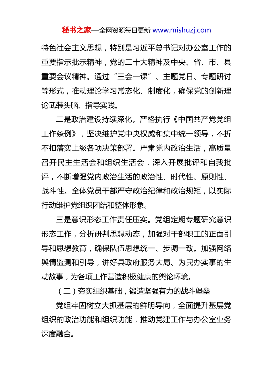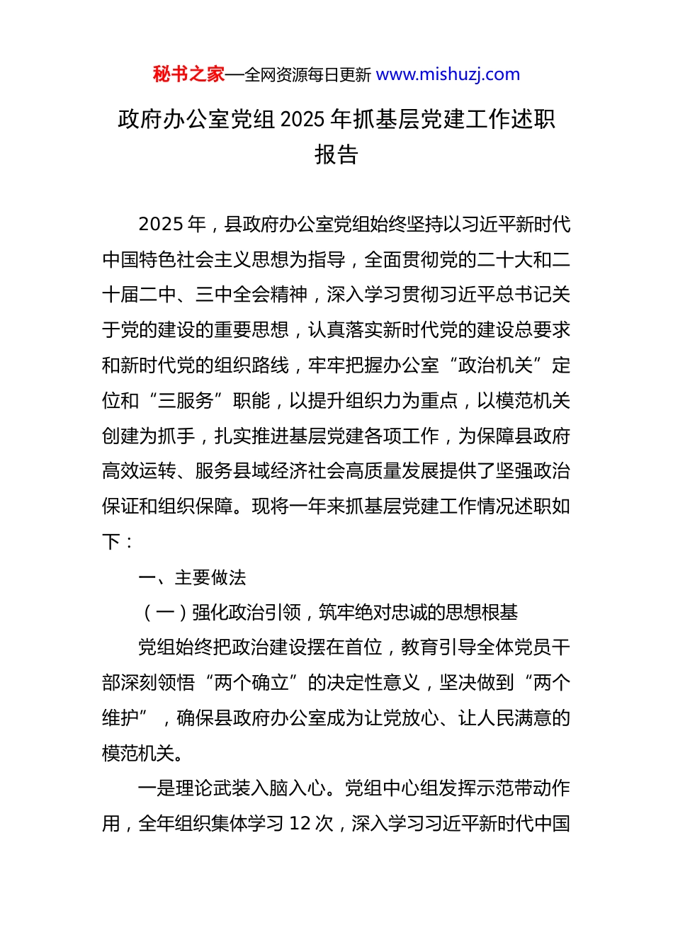 秘书之家—全网资源每日更新 www.mishuzj.com政府办公室党组 2025 年抓基层党建工作述职报告 2025 年,县政府办公室党组始终坚持以习近平新时代中国特色社会主义思想为指导,全面贯彻党的二十大和二十届二中、三中全会精神,深入学习贯彻习近平总书记关于党的建设的重要思想,认真落实新时代党的建设总要求和新时代党的组织路线,牢牢把握办公室“政治机关”定位和“三服务”职能,以提升组织力为重点,以模范机关创建为抓手,扎实推进基层党建各项工作,为保障县政府高效运转、服务县域经济社会高质量发展提供了坚强政治保证和组织保障。现将一年来抓基层党建工作情况述职如下:一、主要做法(一)强化政治引领,筑牢绝对忠诚的思想根基党组始终把政治建设摆在首位,教育引导全体党员干部深刻领悟“两个确立”的决定性意义,坚决做到“两个维护”,确保县政府办公室成为让党放心、让人民满意的模范机关。一是理论武装入脑入心。党组中心组发挥示范带动作用,全年组织集体学习 12 次,深入学习习近平新时代中国秘书之家—全网资源每日更新 www.mishuzj.com特色社会主义思想,特别是习近平总书记对办公室工作的重要指示批示精神,党的二十大精神及中央、省、市、县重要会议精神。通过“三会一课”、主题党日、专题研讨等形式,推动理论学习常态化、制度化,确保党的创新理论武装头脑、指导实践。二是政治建设持续深化。严格执行《中国共产党党组工作条例》,坚决维护党中央权威和集中统一领导,不折不扣落实上级各项决策部署。严肃党内政治生活,高质量召开民主生活会和组织生活会,深入开展批评和自我批评,不断增强党内政治生活的政治性、时代性、原则性、战斗性。全体党员干部严守政治纪律和政治规矩,以实际行动维护党组织团结和整体形象。三是意识形态工作责任压实。党组定期专题研究意识形态工作,分析研判思想动态,加强对干部职工的正面引导和思想教育,确保队伍思想统一、步调一致。加强网络舆情监测和引导,讲好县政府服务大局、为民办实事的生动故事,为各项工作营造积极健康的舆论环境。(二)夯实组织基础,锻造坚强有力的战斗堡垒党组牢固树立大抓基层的鲜明导向,全面提升基层党组织的政治功能和组织功能,推动党建工作与办公室业务深度融合。秘书之家—全网资源每日更新 www.mishuzj.com一是组织体系建设规范有力。根据机构改革和人员变动情况,及时调整优化党支部设置,配齐配强支部班子和党务干部队伍。严格落实《中国共产党支部工作条例(试行)》,扎实推进党支部标准化规范化建设,指导各支部严格执行“三会一课”、主题党日等基本制度,确保组织生活严肃认真、富有成效。二是党员队伍建设提质增效。严格执行发展党员工作细则,做好入党积极分子的培养考察和发展对象推荐工作,全年发展党员 3 名,优化党员结构。加强党员日常教育管理和监督,定期开展政治理论培训和业务能力提升培训。创新开展党员先锋岗、责任区创建活动,引导党员在文稿起草、督办落实、会务保障、接待联络等岗位上亮身份、作表率。三是党建业务融合深度推进。坚持把党建工作融入办公室“三服务”中心工作全过程,创新推行“党建+”工作模式。例如,在重点项目督办、政策调研、应急值守等重点任务中,成立“党员攻坚队”“青年突击队”,设立“党员示范窗口”,充分发挥党组织的战斗堡垒作用和党员的先锋模范作用,确保各项任务高效优质完成,有效破解了“两张皮”问题。(三)严抓作风建设,营造风清气正的政治生态秘书之家—全网资源每日更新 www.mishuzj.com党组始终把纪律和规矩挺在前面,驰而不息抓好作风建设和反腐倡廉工作,打造忠诚干净担当的干部队伍。一是主体责任层层压实。党组书记认真履行抓党建“第一责任人”职责,班子成员严格落实“一岗双责”,全年听取党建工作汇报 6 次,研究解决实际问题。加强对重点科室和关键环节的监督检查,运用监督执纪“第一种形态”,抓早抓小、防微杜渐。二是作风建设常抓不懈。严格执行纪律规定及其要求,坚决纠治形式主义、官僚主义,力戒空谈、注重实效。深入开展调查研究,全年开展基层调研 28 次,了解基层实际困难,解...
