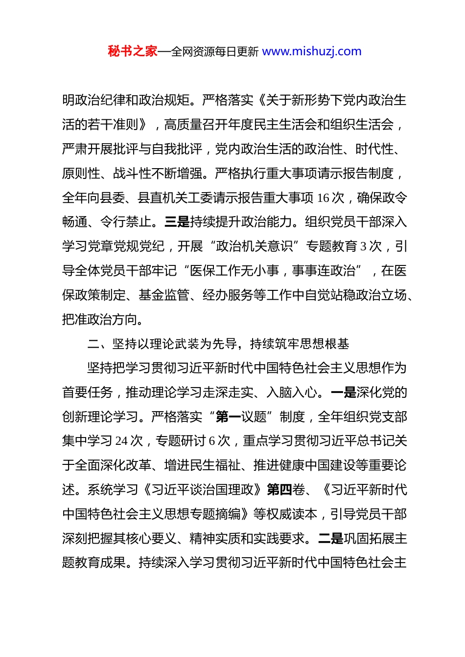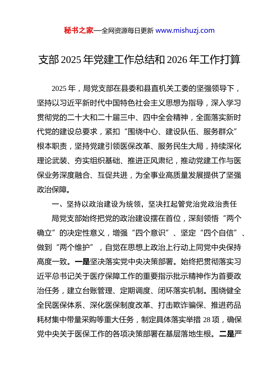秘书之家—全网资源每日更新 www.mishuzj.com支部 2025 年党建工作总结和 2026 年工作打算 2025 年,局党支部在县委和县直机关工委的坚强领导下,坚持以习近平新时代中国特色社会主义思想为指导,深入学习贯彻党的二十大和二十届三中、四中全会精神,全面落实新时代党的建设总要求,紧扣“围绕中心、建设队伍、服务群众”根本职责,坚持党建引领医保改革、服务民生大局,持续深化理论武装、夯实组织基础、推进正风肃纪,推动党建工作与医保业务深度融合、互促共进,为全事业高质量发展提供了坚强政治保障。一、坚持以政治建设为统领,坚决扛起管党治党政治责任局党支部始终把党的政治建设摆在首位,深刻领悟“两个确立”的决定性意义,增强“四个意识”、坚定“四个自信”、做到“两个维护”,自觉在思想上政治上行动上同党中央保持高度一致。一是坚决落实党中央决策部署。始终把贯彻落实习近平总书记关于医疗保障工作的重要指示批示精神作为首要政治任务,建立台账管理、定期调度、闭环落实机制。围绕健全全民医保体系、深化医保制度改革、打击欺诈骗保、推进药品耗材集中带量采购等重大任务,制定具体落实举措 28 项,确保党中央关于医保工作的各项决策部署在基层落地生根。二是严秘书之家—全网资源每日更新 www.mishuzj.com明政治纪律和政治规矩。严格落实《关于新形势下党内政治生活的若干准则》,高质量召开年度民主生活会和组织生活会,严肃开展批评与自我批评,党内政治生活的政治性、时代性、原则性、战斗性不断增强。严格执行重大事项请示报告制度,全年向县委、县直机关工委请示报告重大事项 16 次,确保政令畅通、令行禁止。三是持续提升政治能力。组织党员干部深入学习党章党规党纪,开展“政治机关意识”专题教育 3 次,引导全体党员干部牢记“医保工作无小事,事事连政治”,在医保政策制定、基金监管、经办服务等工作中自觉站稳政治立场、把准政治方向。二、坚持以理论武装为先导,持续筑牢思想根基坚持把学习贯彻习近平新时代中国特色社会主义思想作为首要任务,推动理论学习走深走实、入脑入心。一是深化党的创新理论学习。严格落实“第一议题”制度,全年组织党支部集中学习 24 次,专题研讨 6 次,重点学习贯彻习近平总书记关于全面深化改革、增进民生福祉、推进健康中国建设等重要论述。系统学习《习近平谈治国理政》第四卷、《习近平新时代中国特色社会主义思想专题摘编》等权威读本,引导党员干部深刻把握其核心要义、精神实质和实践要求。二是巩固拓展主题教育成果。持续深入学习贯彻习近平新时代中国特色社会主秘书之家—全网资源每日更新 www.mishuzj.com义思想主题教育成果,建立健全“学思想、强党性、重实践、建新功”长效机制。围绕“学用新思想、医保惠民生”主题,开展“我为群众办实事”实践活动,累计解决群众急难愁盼问题 47 件。三是创新学习方式方法。打造“医保讲堂”学习品牌,组织党员干部轮流授课,围绕医保政策、基金监管、信息化建设等主题开展业务培训与理论分享 12 期。用好“学习强国”“甘肃党建”等线上平台,实现党员在线学习全覆盖,年度平均积分位居全县机关党组织前列。开展“读原著、悟原理”读书分享会 4 次,推动理论学习由“被动学”向“主动学”转变。三、坚持以组织建设为基础,全面提升党支部战斗力牢固树立大抓基层的鲜明导向,持续推进党支部标准化规范化建设,不断增强党组织的政治功能和组织功能。一是压紧压实党建责任。党支部书记切实履行第一责任人职责,班子成员严格落实“一岗双责”,形成齐抓共管工作格局。制定年度党建工作要点和责任清单,细化任务分工,明确完成时限,实行台账化管理、项目化推进。全年召开支委会研究党建工作 18次,专题听取党小组工作汇报 6 次,推动党建工作与业务工作同部署、同落实、同考核。二是规范党内组织生活。严格执行“三会一课”、主题党日、谈心谈话等制度,全年召开党员大会 4 次、支委会 12 次、党小组会 24 次,开展主题党日活动 12秘书之家—全网资源每日更新 www.mishuzj.com次。创新主题党日形式,组织党员赴县烈士陵园开展“...