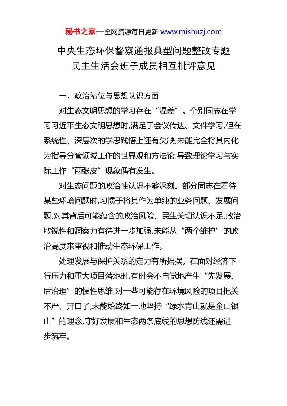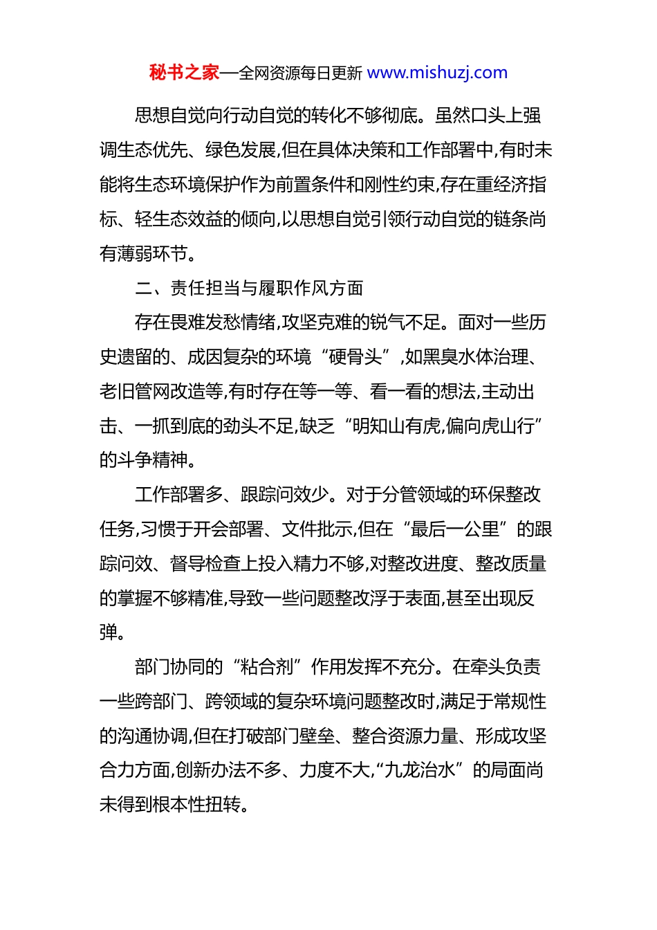 秘书之家—全网资源每日更新 www.mishuzj.com中央生态环保督察通报典型问题整改专题民主生活会班子成员相互批评意见 一、政治站位与思想认识方面对生态文明思想的学习存在“温差”。个别同志在学习习近平生态文明思想时,满足于会议传达、文件学习,但在系统性、深层次的学思践悟上还有欠缺,未能完全将其内化为指导分管领域工作的世界观和方法论,导致理论学习与实际工作“两张皮”现象偶有发生。对生态问题的政治性认识不够深刻。部分同志在看待某些环境问题时,习惯于将其作为单纯的业务问题、发展问题,对其背后可能蕴含的政治风险、民生关切认识不足,政治敏锐性和洞察力有待进一步加强,未能从“两个维护”的政治高度来审视和推动生态环保工作。处理发展与保护关系的定力有所摇摆。在面对经济下行压力和重大项目落地时,有时会不自觉地产生“先发展、后治理”的惯性思维,对一些可能存在环境风险的项目把关不严、开口子,未能始终如一地坚持“绿水青山就是金山银山”的理念,守好发展和生态两条底线的思想防线还需进一步筑牢。秘书之家—全网资源每日更新 www.mishuzj.com思想自觉向行动自觉的转化不够彻底。虽然口头上强调生态优先、绿色发展,但在具体决策和工作部署中,有时未能将生态环境保护作为前置条件和刚性约束,存在重经济指标、轻生态效益的倾向,以思想自觉引领行动自觉的链条尚有薄弱环节。二、责任担当与履职作风方面存在畏难发愁情绪,攻坚克难的锐气不足。面对一些历史遗留的、成因复杂的环境“硬骨头”,如黑臭水体治理、老旧管网改造等,有时存在等一等、看一看的想法,主动出击、一抓到底的劲头不足,缺乏“明知山有虎,偏向虎山行”的斗争精神。工作部署多、跟踪问效少。对于分管领域的环保整改任务,习惯于开会部署、文件批示,但在“最后一公里”的跟踪问效、督导检查上投入精力不够,对整改进度、整改质量的掌握不够精准,导致一些问题整改浮于表面,甚至出现反弹。部门协同的“粘合剂”作用发挥不充分。在牵头负责一些跨部门、跨领域的复杂环境问题整改时,满足于常规性的沟通协调,但在打破部门壁垒、整合资源力量、形成攻坚合力方面,创新办法不多、力度不大,“九龙治水”的局面尚未得到根本性扭转。秘书之家—全网资源每日更新 www.mishuzj.com存在形式主义、官僚主义倾向。在应对上级督察检查时,有时过于注重台账、材料的完善,而对现场的实际问题、群众的真实感受关注不够。存在以会议落实会议、以文件落实文件的现象,整改工作有时不够扎实、不够接地气。深入一线的调查研究存在短板。对分管领域内的突出环境问题,坐镇指挥多,深入现场“解剖麻雀”少,对问题的根源、症结所在把握不够透彻,导致出台的一些整改措施针对性、可操作性不强。三、顶层设计与长效机制方面工作的系统性、前瞻性有待提高。在处理环境问题时,有时会“头痛医头、脚痛医脚”,缺乏从全流域、全周期、全要素的角度进行系统谋划。对于城市发展中可能出现的结构性环境问题,预见性不强,导致基础设施建设规划滞后于城市发展需求。“当下改”与“长久立”结合不够紧密。在推动问题整改时,过于聚焦于完成眼前的销号任务,而在举一反三、建章立制方面思考不深、行动不快。部分领域“屡督屡犯”的问题背后,反映出我们常态长效监管机制的缺失和薄弱。政策执行存在“一刀切”现象。在推动某些环保政策,如“散乱污”企业整治、畜禽养殖污染治理等工作时,对不秘书之家—全网资源每日更新 www.mishuzj.com同区域、不同行业的实际情况考虑不够周全,有时采取简单化的处理方式,影响了政策效果和群众满意度。源头治理的力度需要加大。在工作中,更多精力投入在末端治理和污染修复上,但在产业结构调整、能源结构优化、生产生活方式绿色转型等源头性、根本性问题上,下的功夫还不够深,未能真正将生态环保压力转化为推动高质量发展的内生动力。四、具体问题整改与执行落地方面环境基础设施建设推进缓慢。对分管领域内的污水处理厂提标扩容、配套管网建设、垃圾焚烧发电等重大环保基础设施项目,亲自协调、亲自督办的力度不够,导致部分项目进度滞后于序时要求,成为制约我市环境质量改善的突出瓶颈。工业园区污染监管存在漏洞。对分...