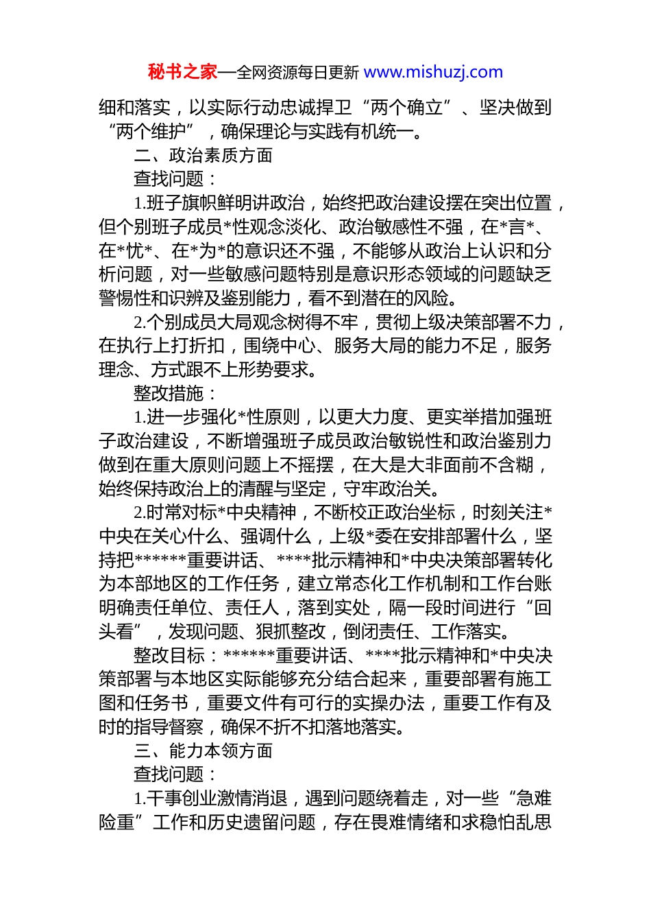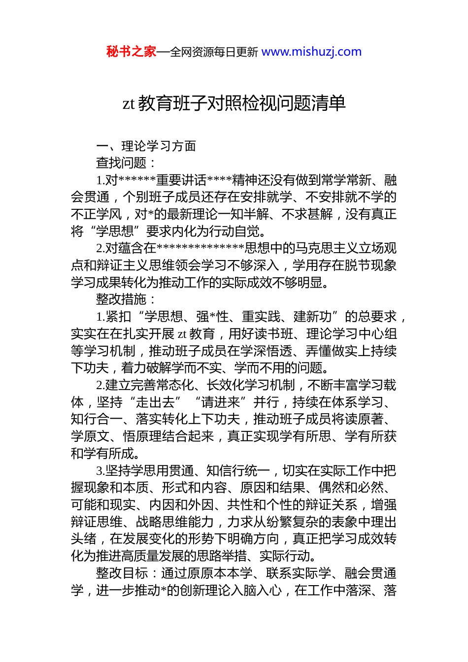 秘书之家—全网资源每日更新 www.mishuzj.comzt 教育班子对照检视问题清单一、理论学习方面查找问题:1.对******重要讲话****精神还没有做到常学常新、融会贯通,个别班子成员还存在安排就学、不安排就不学的不正学风,对*的最新理论一知半解、不求甚解,没有真正将“学思想”要求内化为行动自觉。2.对蕴含在**************思想中的马克思主义立场观点和辩证主义思维领会学习不够深入,学用存在脱节现象学习成果转化为推动工作的实际成效不够明显。整改措施:1.紧扣“学思想、强*性、重实践、建新功”的总要求,实实在在扎实开展 zt 教育,用好读书班、理论学习中心组等学习机制,推动班子成员在学深悟透、弄懂做实上持续下功夫,着力破解学而不实、学而不用的问题。2.建立完善常态化、长效化学习机制,不断丰富学习载体,坚持“走出去”“请进来”并行,持续在体系学习、知行合一、落实转化上下功夫,推动班子成员将读原著、学原文、悟原理结合起来,真正实现学有所思、学有所获和学有所成。3.坚持学思用贯通、知信行统一,切实在实际工作中把握现象和本质、形式和内容、原因和结果、偶然和必然、可能和现实、内因和外因、共性和个性的辩证关系,增强辩证思维、战略思维能力,力求从纷繁复杂的表象中理出头绪,在发展变化的形势下明确方向,真正把学习成效转化为推进高质量发展的思路举措、实际行动。整改目标:通过原原本本学、联系实际学、融会贯通学,进一步推动*的创新理论入脑入心,在工作中落深、落秘书之家—全网资源每日更新 www.mishuzj.com细和落实,以实际行动忠诚捍卫“两个确立”、坚决做到“两个维护”,确保理论与实践有机统一。二、政治素质方面查找问题:1.班子旗帜鲜明讲政治,始终把政治建设摆在突出位置,但个别班子成员*性观念淡化、政治敏感性不强,在*言*、在*忧*、在*为*的意识还不强,不能够从政治上认识和分析问题,对一些敏感问题特别是意识形态领域的问题缺乏警惕性和识辨及鉴别能力,看不到潜在的风险。2.个别成员大局观念树得不牢,贯彻上级决策部署不力,在执行上打折扣,围绕中心、服务大局的能力不足,服务理念、方式跟不上形势要求。整改措施:1.进一步强化*性原则,以更大力度、更实举措加强班子政治建设,不断增强班子成员政治敏锐性和政治鉴别力做到在重大原则问题上不摇摆,在大是大非面前不含糊,始终保持政治上的清醒与坚定,守牢政治关。2.时常对标*中央精神,不断校正政治坐标,时刻关注*中央在关心什么、强调什么,上级*委在安排部署什么,坚持把******重要讲话、****批示精神和*中央决策部署转化为本部地区的工作任务,建立常态化工作机制和工作台账明确责任单位、责任人,落到实处,隔一段时间进行“回头看”,发现问题、狠抓整改,倒闭责任、工作落实。整改目标:******重要讲话、****批示精神和*中央决策部署与本地区实际能够充分结合起来,重要部署有施工图和任务书,重要文件有可行的实操办法,重要工作有及时的指导督察,确保不折不扣落地落实。三、能力本领方面查找问题:1.干事创业激情消退,遇到问题绕着走,对一些“急难险重”工作和历史遗留问题,存在畏难情绪和求稳怕乱思秘书之家—全网资源每日更新 www.mishuzj.com想。因循守旧、安于现状,落实新发展理念不到位,“上赶争”意识差,工作无亮点、无特色。2.领导班子和班子成员身上不同程度地出现了安于现状的倾向,工作不大胆、拼搏进取的意识有所淡化,不能始终坚持高标准、严要求、求实效。工作中对组织负责多、对上级负责多,但对基层、对群众负责却往往做的不够到位。有的领导开拓进取的精神不足,有不思进取、得过且过思想,存在精神懈怠的问题。整改措施:1.坚持不懈用**************思想凝心铸魂,持续在以学增智、以学促干上下功夫,做到干什么学什么、缺什么补什么,弥补知识弱项、能力短板、经验盲区,以过硬本领展现担当作为。2.坚持严管和厚爱结合,激励和约束并重,完善落实容错纠错机制,保护*员干部干事创业的积极性。整改目标:班子成员能始终保持干事创业精神状态,艰苦奋斗、奋发有为,敢于斗争、善于斗争,以事不避难义不逃责的勇气担当,在...