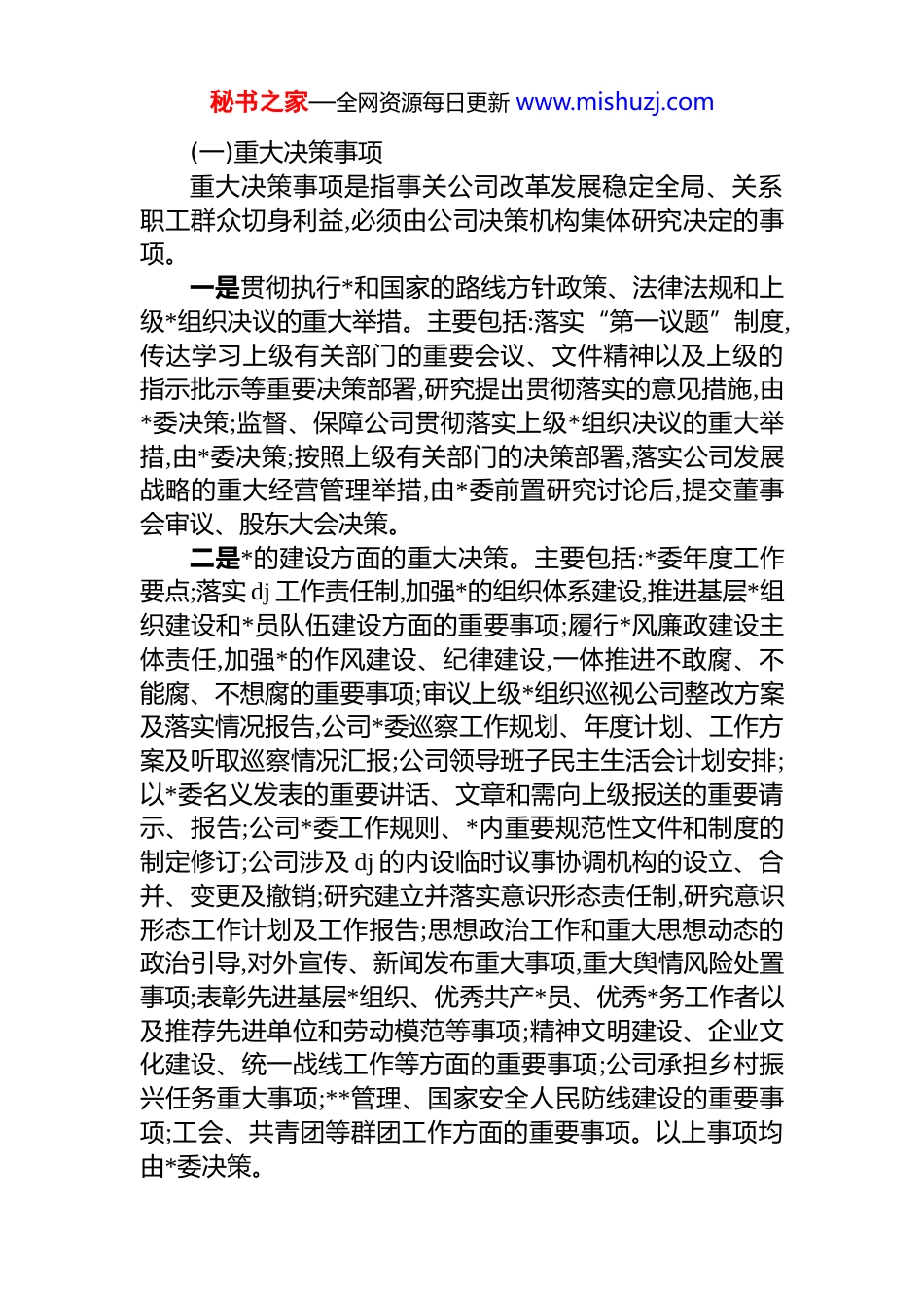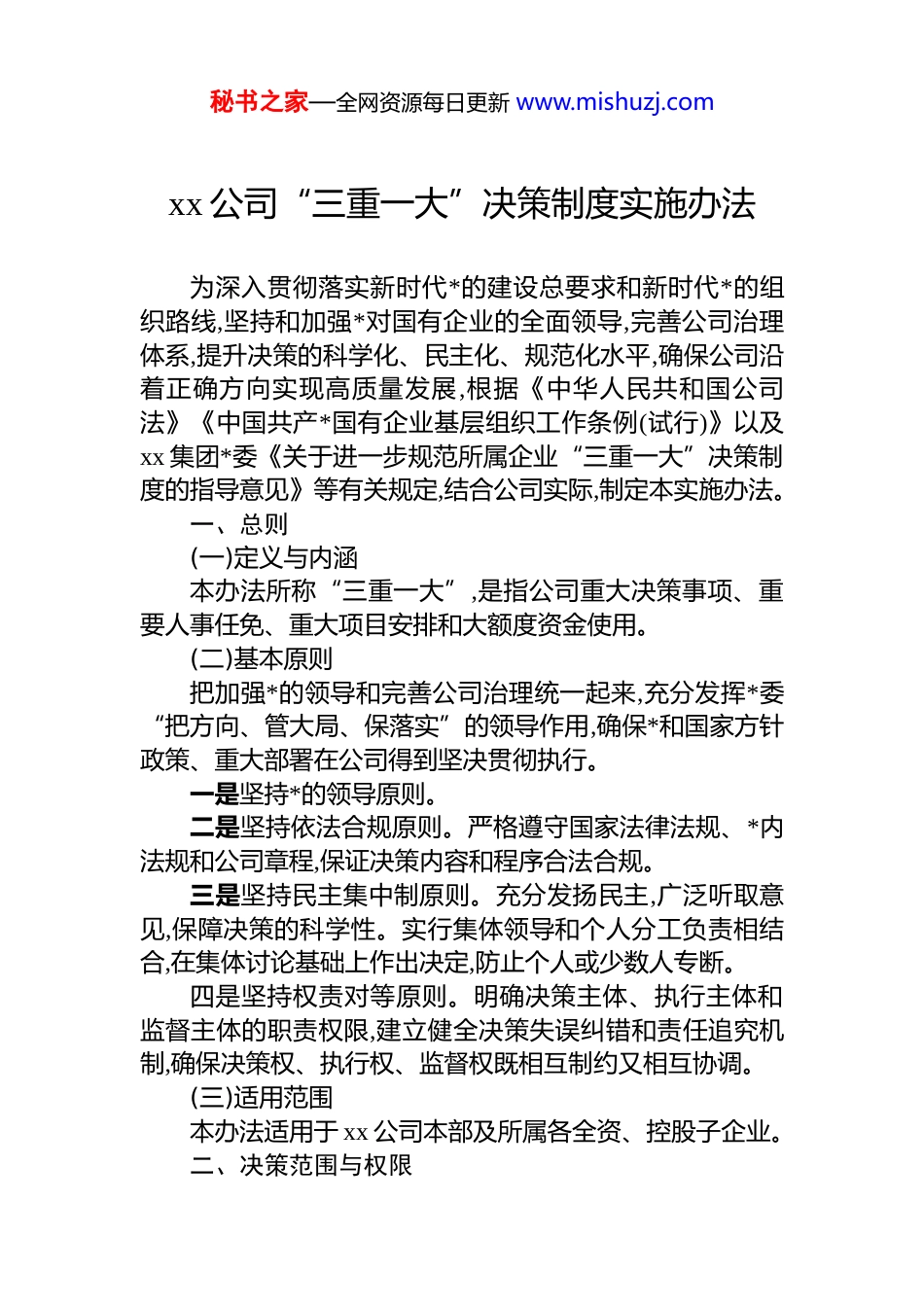 秘书之家—全网资源每日更新 www.mishuzj.comxx 公司“三重一大”决策制度实施办法为深入贯彻落实新时代*的建设总要求和新时代*的组织路线,坚持和加强*对国有企业的全面领导,完善公司治理体系,提升决策的科学化、民主化、规范化水平,确保公司沿着正确方向实现高质量发展,根据《中华人民共和国公司法》《中国共产*国有企业基层组织工作条例(试行)》以及xx 集团*委《关于进一步规范所属企业“三重一大”决策制度的指导意见》等有关规定,结合公司实际,制定本实施办法。一、总则(一)定义与内涵本办法所称“三重一大”,是指公司重大决策事项、重要人事任免、重大项目安排和大额度资金使用。(二)基本原则把加强*的领导和完善公司治理统一起来,充分发挥*委“把方向、管大局、保落实”的领导作用,确保*和国家方针政策、重大部署在公司得到坚决贯彻执行。一是坚持*的领导原则。二是坚持依法合规原则。严格遵守国家法律法规、*内法规和公司章程,保证决策内容和程序合法合规。三是坚持民主集中制原则。充分发扬民主,广泛听取意见,保障决策的科学性。实行集体领导和个人分工负责相结合,在集体讨论基础上作出决定,防止个人或少数人专断。四是坚持权责对等原则。明确决策主体、执行主体和监督主体的职责权限,建立健全决策失误纠错和责任追究机制,确保决策权、执行权、监督权既相互制约又相互协调。(三)适用范围本办法适用于 xx 公司本部及所属各全资、控股子企业。二、决策范围与权限秘书之家—全网资源每日更新 www.mishuzj.com(一)重大决策事项重大决策事项是指事关公司改革发展稳定全局、关系职工群众切身利益,必须由公司决策机构集体研究决定的事项。一是贯彻执行*和国家的路线方针政策、法律法规和上级*组织决议的重大举措。主要包括:落实“第一议题”制度,传达学习上级有关部门的重要会议、文件精神以及上级的指示批示等重要决策部署,研究提出贯彻落实的意见措施,由*委决策;监督、保障公司贯彻落实上级*组织决议的重大举措,由*委决策;按照上级有关部门的决策部署,落实公司发展战略的重大经营管理举措,由*委前置研究讨论后,提交董事会审议、股东大会决策。二是*的建设方面的重大决策。主要包括:*委年度工作要点;落实 dj 工作责任制,加强*的组织体系建设,推进基层*组织建设和*员队伍建设方面的重要事项;履行*风廉政建设主体责任,加强*的作风建设、纪律建设,一体推进不敢腐、不能腐、不想腐的重要事项;审议上级*组织巡视公司整改方案及落实情况报告,公司*委巡察工作规划、年度计划、工作方案及听取巡察情况汇报;公司领导班子民主生活会计划安排;以*委名义发表的重要讲话、文章和需向上级报送的重要请示、报告;公司*委工作规则、*内重要规范性文件和制度的制定修订;公司涉及 dj 的内设临时议事协调机构的设立、合并、变更及撤销;研究建立并落实意识形态责任制,研究意识形态工作计划及工作报告;思想政治工作和重大思想动态的政治引导,对外宣传、新闻发布重大事项,重大舆情风险处置事项;表彰先进基层*组织、优秀共产*员、优秀*务工作者以及推荐先进单位和劳动模范等事项;精神文明建设、企业文化建设、统一战线工作等方面的重要事项;公司承担乡村振兴任务重大事项;**管理、国家安全人民防线建设的重要事项;工会、共青团等群团工作方面的重要事项。以上事项均由*委决策。秘书之家—全网资源每日更新 www.mishuzj.com三是企业经营方针、主业调整、发展战略规划、经营计划和投资计划。主要包括:公司发展主业调整方案、发展战略、中长期发展规划的制定与修订,由*委前置研究讨论后,提交董事会和监事会审议、股东大会决策;公司专项规划、产业规划,由*委前置研究讨论后,由董事会决策;公司年度产量和营销计划、年度投资和发展计划及其调整,由*委前置研究讨论后,由董事会决策;公司年度技改、修理、科技和信息化项目计划及其调整,由*委前置研究讨论后,由董事会决策;公司年度日常关联交易计划及其调整,由*委前置研究讨论后,根据预计金额由董事会或股东大会决策;公司对外捐赠、赞助、帮扶资金计划及其调整,由*委前置研究讨论后,根据金额由董事会或股东大会决策;公司或公司授权基层企业与相关方订立...