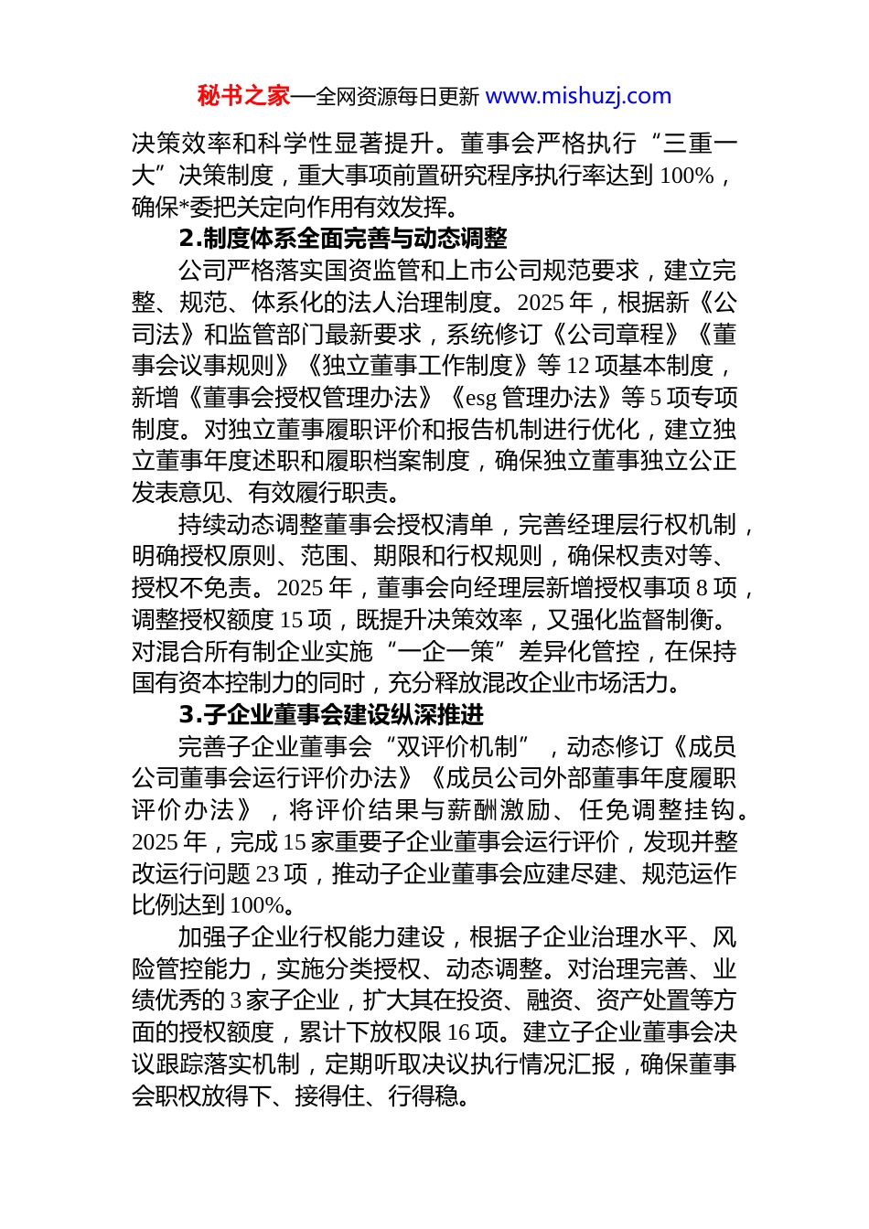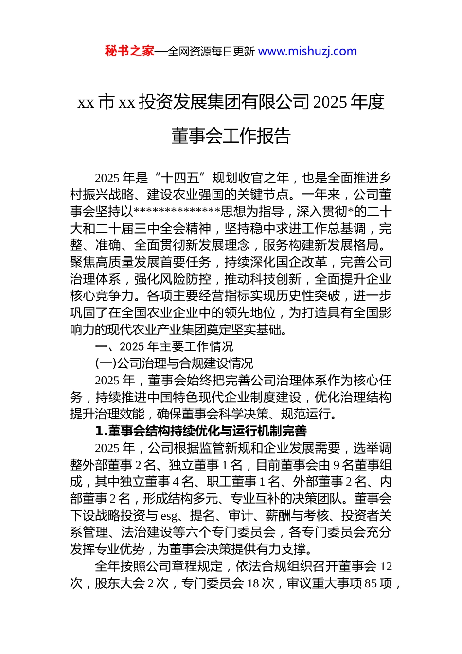 秘书之家—全网资源每日更新 www.mishuzj.comxx 市 xx 投资发展集团有限公司 2025 年度董事会工作报告2025 年是“十四五”规划收官之年,也是全面推进乡村振兴战略、建设农业强国的关键节点。一年来,公司董事会坚持以**************思想为指导,深入贯彻*的二十大和二十届三中全会精神,坚持稳中求进工作总基调,完整、准确、全面贯彻新发展理念,服务构建新发展格局。聚焦高质量发展首要任务,持续深化国企改革,完善公司治理体系,强化风险防控,推动科技创新,全面提升企业核心竞争力。各项主要经营指标实现历史性突破,进一步巩固了在全国农业企业中的领先地位,为打造具有全国影响力的现代农业产业集团奠定坚实基础。一、2025 年主要工作情况(一)公司治理与合规建设情况2025 年,董事会始终把完善公司治理体系作为核心任务,持续推进中国特色现代企业制度建设,优化治理结构提升治理效能,确保董事会科学决策、规范运行。1.董事会结构持续优化与运行机制完善2025 年,公司根据监管新规和企业发展需要,选举调整外部董事 2 名、独立董事 1 名,目前董事会由 9 名董事组成,其中独立董事 4 名、职工董事 1 名、外部董事 2 名、内部董事 2 名,形成结构多元、专业互补的决策团队。董事会下设战略投资与 esg、提名、审计、薪酬与考核、投资者关系管理、法治建设等六个专门委员会,各专门委员会充分发挥专业优势,为董事会决策提供有力支撑。全年按照公司章程规定,依法合规组织召开董事会 12次,股东大会 2 次,专门委员会 18 次,审议重大事项 85 项,秘书之家—全网资源每日更新 www.mishuzj.com决策效率和科学性显著提升。董事会严格执行“三重一大”决策制度,重大事项前置研究程序执行率达到 100%,确保*委把关定向作用有效发挥。2.制度体系全面完善与动态调整公司严格落实国资监管和上市公司规范要求,建立完整、规范、体系化的法人治理制度。2025 年,根据新《公司法》和监管部门最新要求,系统修订《公司章程》《董事会议事规则》《独立董事工作制度》等 12 项基本制度,新增《董事会授权管理办法》《esg 管理办法》等 5 项专项制度。对独立董事履职评价和报告机制进行优化,建立独立董事年度述职和履职档案制度,确保独立董事独立公正发表意见、有效履行职责。持续动态调整董事会授权清单,完善经理层行权机制,明确授权原则、范围、期限和行权规则,确保权责对等、授权不免责。2025 年,董事会向经理层新增授权事项 8 项,调整授权额度 15 项,既提升决策效率,又强化监督制衡。对混合所有制企业实施“一企一策”差异化管控,在保持国有资本控制力的同时,充分释放混改企业市场活力。3.子企业董事会建设纵深推进完善子企业董事会“双评价机制”,动态修订《成员公司董事会运行评价办法》《成员公司外部董事年度履职评价办法》,将评价结果与薪酬激励、任免调整挂钩。2025 年,完成 15 家重要子企业董事会运行评价,发现并整改运行问题 23 项,推动子企业董事会应建尽建、规范运作比例达到 100%。加强子企业行权能力建设,根据子企业治理水平、风险管控能力,实施分类授权、动态调整。对治理完善、业绩优秀的 3 家子企业,扩大其在投资、融资、资产处置等方面的授权额度,累计下放权限 16 项。建立子企业董事会决议跟踪落实机制,定期听取决议执行情况汇报,确保董事会职权放得下、接得住、行得稳。秘书之家—全网资源每日更新 www.mishuzj.com4.内控体系深化提升与监督合力增强持续深化“内控深化提升”专项行动,构建全面内控管理机制。2025 年,公司联合第三方专业机构对《内部控制手册》进行全面修订,覆盖 15 个业务域、87 个流程节点,明确内控责任主体、工作流程和考核机制。完成农产品贸易、食品加工、项目投资等重点领域的专项合规风险评估识别风险点 46 个,制定应对措施 58 项。强化内部审计与监督职能,内部审计部门完成对 12 家子企业、6 个重点项目的专项审计,发现并推动整改问题136 项,提出管理建议 89 条,促进增收节支 xx 亿元。建立审计整改闭环管理机制,整改完成率达到...