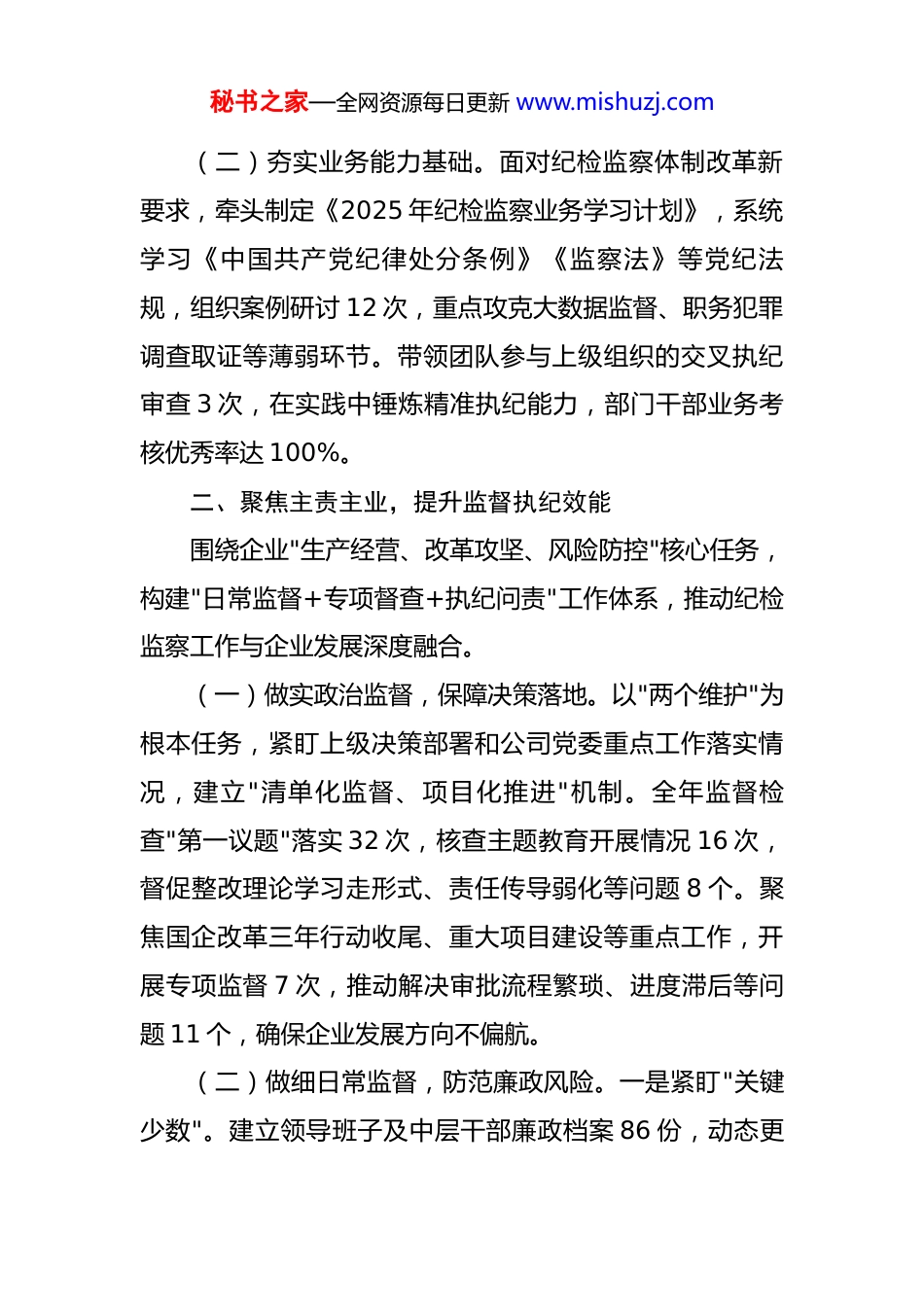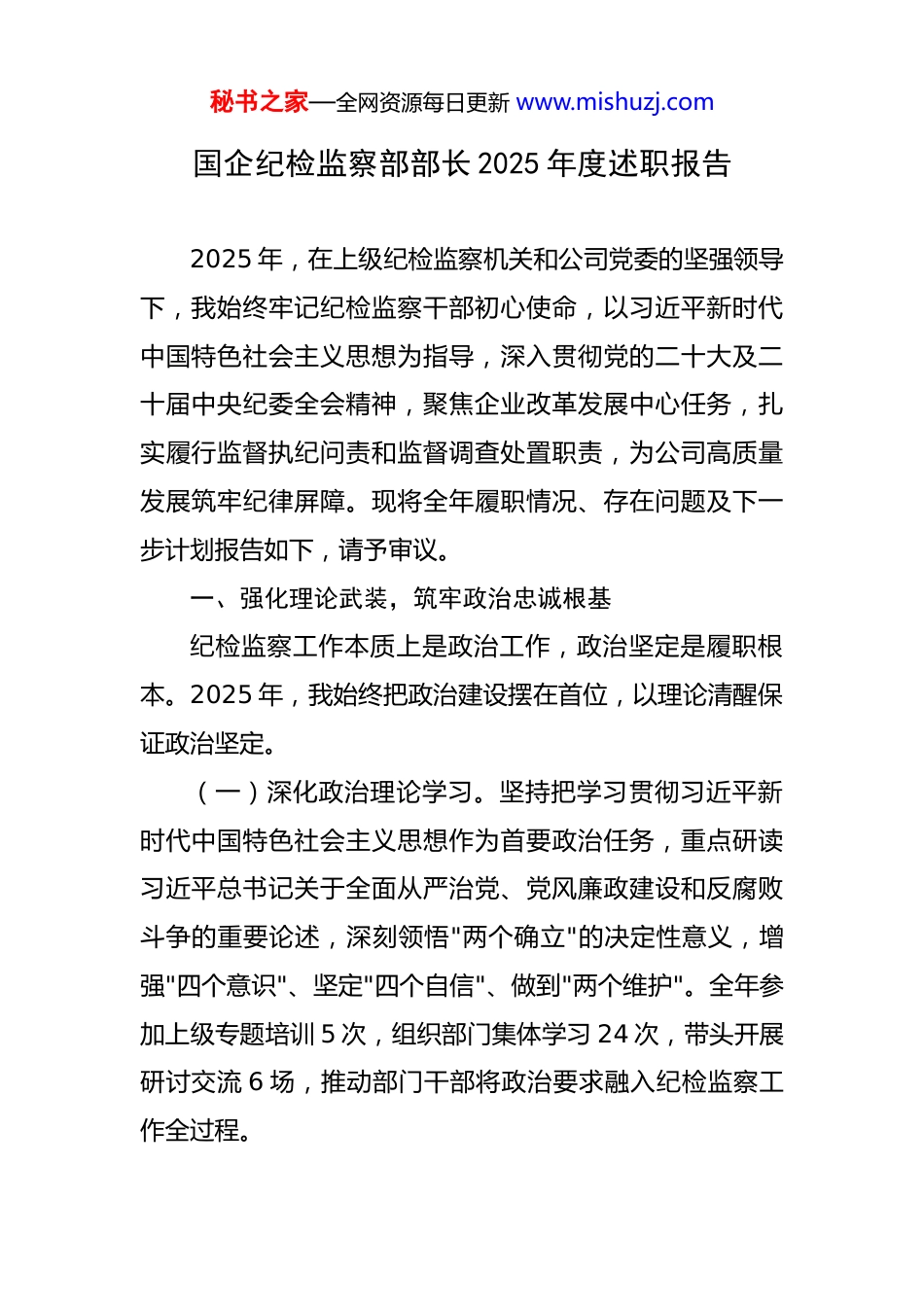 秘书之家—全网资源每日更新 www.mishuzj.com国企纪检监察部部长 2025 年度述职报告 2025 年,在上级纪检监察机关和公司党委的坚强领导下,我始终牢记纪检监察干部初心使命,以习近平新时代中国特色社会主义思想为指导,深入贯彻党的二十大及二十届中央纪委全会精神,聚焦企业改革发展中心任务,扎实履行监督执纪问责和监督调查处置职责,为公司高质量发展筑牢纪律屏障。现将全年履职情况、存在问题及下一步计划报告如下,请予审议。一、强化理论武装,筑牢政治忠诚根基纪检监察工作本质上是政治工作,政治坚定是履职根本。2025 年,我始终把政治建设摆在首位,以理论清醒保证政治坚定。(一)深化政治理论学习。坚持把学习贯彻习近平新时代中国特色社会主义思想作为首要政治任务,重点研读习近平总书记关于全面从严治党、党风廉政建设和反腐败斗争的重要论述,深刻领悟"两个确立"的决定性意义,增强"四个意识"、坚定"四个自信"、做到"两个维护"。全年参加上级专题培训 5 次,组织部门集体学习 24 次,带头开展研讨交流 6 场,推动部门干部将政治要求融入纪检监察工作全过程。秘书之家—全网资源每日更新 www.mishuzj.com(二)夯实业务能力基础。面对纪检监察体制改革新要求,牵头制定《2025 年纪检监察业务学习计划》,系统学习《中国共产党纪律处分条例》《监察法》等党纪法规,组织案例研讨 12 次,重点攻克大数据监督、职务犯罪调查取证等薄弱环节。带领团队参与上级组织的交叉执纪审查 3 次,在实践中锤炼精准执纪能力,部门干部业务考核优秀率达 100%。二、聚焦主责主业,提升监督执纪效能围绕企业"生产经营、改革攻坚、风险防控"核心任务,构建"日常监督+专项督查+执纪问责"工作体系,推动纪检监察工作与企业发展深度融合。(一)做实政治监督,保障决策落地。以"两个维护"为根本任务,紧盯上级决策部署和公司党委重点工作落实情况,建立"清单化监督、项目化推进"机制。全年监督检查"第一议题"落实 32 次,核查主题教育开展情况 16 次,督促整改理论学习走形式、责任传导弱化等问题 8 个。聚焦国企改革三年行动收尾、重大项目建设等重点工作,开展专项监督 7 次,推动解决审批流程繁琐、进度滞后等问题 11 个,确保企业发展方向不偏航。(二)做细日常监督,防范廉政风险。一是紧盯"关键少数"。建立领导班子及中层干部廉政档案 86 份,动态更秘书之家—全网资源每日更新 www.mishuzj.com新廉政信息 300 余条;通过廉政谈话、述职述廉等方式,监督"一把手"及班子成员履行"一岗双责"情况,全年开展提醒谈话 42 人次、任前廉政谈话 18 人次。二是排查风险隐患。聚焦工程建设、物资采购、选人用人等重点领域,牵头排查廉政风险点 43 个,制定防控措施 62 项,建立风险防控台账并实行销号管理。推动相关部门完善招标管理、资金使用等制度 15 项,从源头堵塞漏洞。三是强化作风建设。深入落实纪律规定精神,紧盯节假日等重要节点,开展明察暗访 18 次,查处违规吃喝、公车私用等"四风"问题6 起,处理 8 人,通报曝光典型案例 4 批次。针对隐形变异"四风"问题,开展"吃公函""隐性福利"专项整治,排查可疑票据 2000 余张,整改不规范问题 23 个。(三)做强执纪问责,保持高压态势。坚持有案必查、有腐必惩,规范问题线索处置流程,全年受理群众举报线索 26 件,办结率 100%;立案查处违纪案件 13 起,给予党纪政务处分 16 人次,挽回经济损失 280 余万元。在执纪审查中,严格遵循"事实清楚、证据确凿、定性准确"原则,推行"一案一剖析、一案一警示",组织干部观看警示教育片 6 场次,召开案件通报会 3 次,用身边事教育身边人,实现"查处一案、警示一片"的效果。(四)做深廉政教育,培育廉洁文化。以"廉洁文化秘书之家—全网资源每日更新 www.mishuzj.com月"为载体,构建"多维立体"教育体系。邀请专家开展党纪法规讲座 4 场,覆盖干部职工 800 余人次;组织参观廉政教育基地 2 批次,征集廉洁书画、微视频等作品 56 件;通过企业公众号推送廉政资讯 120 条、发送廉政短信 600 余条,营造"崇廉...