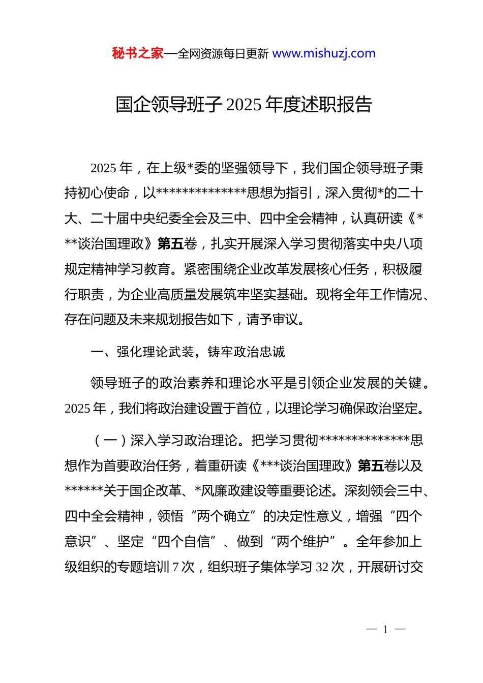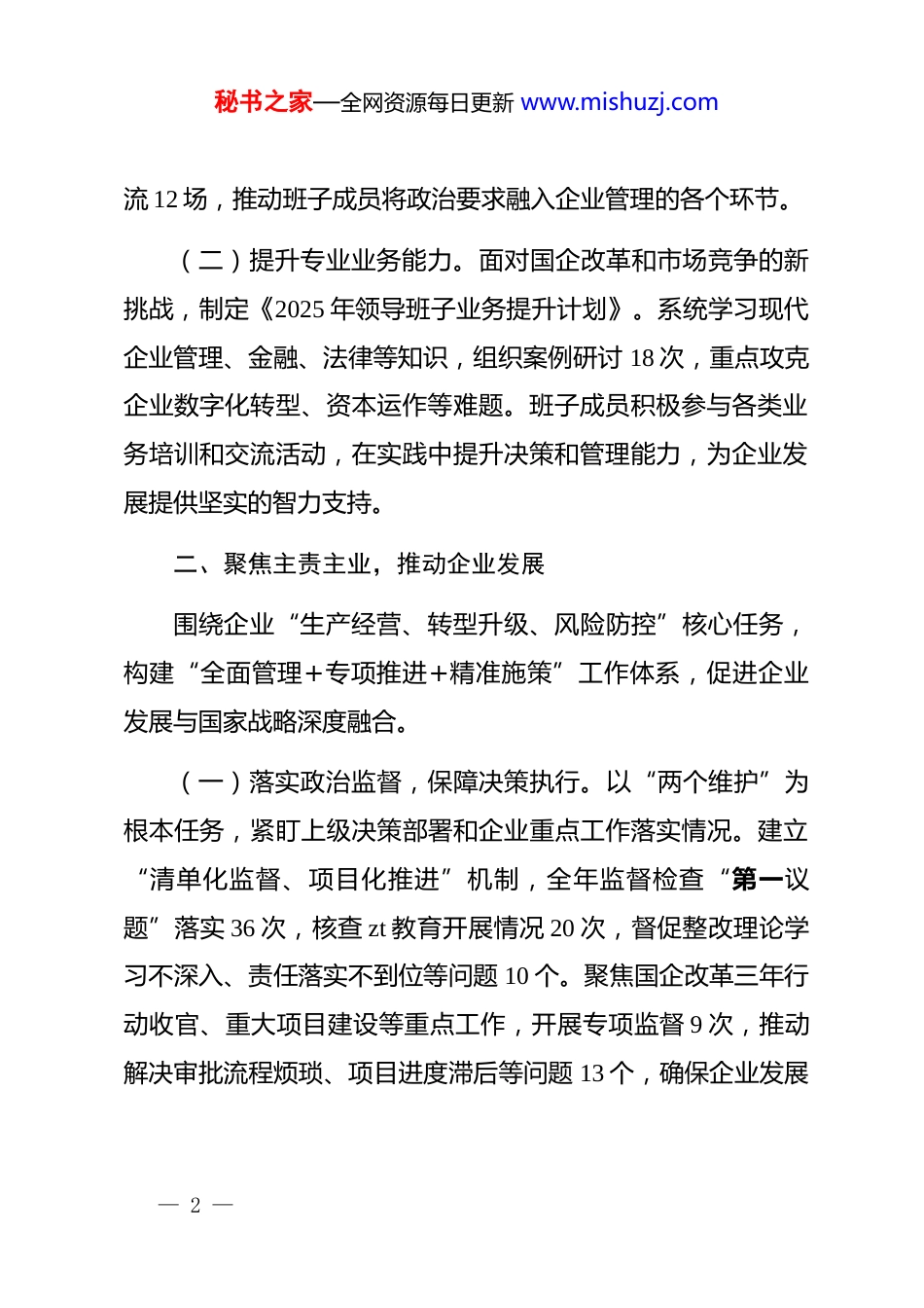 秘书之家—全网资源每日更新 www.mishuzj.com国企领导班子 2025 年度述职报告2025 年,在上级*委的坚强领导下,我们国企领导班子秉持初心使命,以**************思想为指引,深入贯彻*的二十大、二十届中央纪委全会及三中、四中全会精神,认真研读《***谈治国理政》第五卷,扎实开展深入学习贯彻落实中央八项规定精神学习教育。紧密围绕企业改革发展核心任务,积极履行职责,为企业高质量发展筑牢坚实基础。现将全年工作情况、存在问题及未来规划报告如下,请予审议。一、强化理论武装,铸牢政治忠诚领导班子的政治素养和理论水平是引领企业发展的关键。2025 年,我们将政治建设置于首位,以理论学习确保政治坚定。(一)深入学习政治理论。把学习贯彻**************思想作为首要政治任务,着重研读《***谈治国理政》第五卷以及******关于国企改革、*风廉政建设等重要论述。深刻领会三中、四中全会精神,领悟“两个确立”的决定性意义,增强“四个意识”、坚定“四个自信”、做到“两个维护”。全年参加上级组织的专题培训 7 次,组织班子集体学习 32 次,开展研讨交— 1 —秘书之家—全网资源每日更新 www.mishuzj.com流 12 场,推动班子成员将政治要求融入企业管理的各个环节。(二)提升专业业务能力。面对国企改革和市场竞争的新挑战,制定《2025 年领导班子业务提升计划》。系统学习现代企业管理、金融、法律等知识,组织案例研讨 18 次,重点攻克企业数字化转型、资本运作等难题。班子成员积极参与各类业务培训和交流活动,在实践中提升决策和管理能力,为企业发展提供坚实的智力支持。二、聚焦主责主业,推动企业发展围绕企业“生产经营、转型升级、风险防控”核心任务,构建“全面管理+专项推进+精准施策”工作体系,促进企业发展与国家战略深度融合。(一)落实政治监督,保障决策执行。以“两个维护”为根本任务,紧盯上级决策部署和企业重点工作落实情况。建立“清单化监督、项目化推进”机制,全年监督检查“第一议题”落实 36 次,核查 zt 教育开展情况 20 次,督促整改理论学习不深入、责任落实不到位等问题 10 个。聚焦国企改革三年行动收官、重大项目建设等重点工作,开展专项监督 9 次,推动解决审批流程烦琐、项目进度滞后等问题 13 个,确保企业发展— 2 —秘书之家—全网资源每日更新 www.mishuzj.com方向正确。(二)细化日常监督,防范廉政风险。一是紧盯“关键少数”。建立企业中层以上干部廉政档案 110 份,动态更新廉政信息 380 余条。通过廉政谈话、述职述廉等方式,监督“一把手”及班子成员履行“一岗双责”情况,全年开展提醒谈话 50人次、任前廉政谈话 22 人次,及时发现并纠正潜在的廉政风险。二是排查风险隐患。聚焦工程建设、物资采购、选人用人等重点领域,牵头排查廉政风险点 50 个,制定防控措施 70 项,建立风险防控台账并实行销号管理。推动相关部门完善招标管理、资金使用等制度 18 项,从源头上堵塞廉政漏洞。三是加强作风建设。深入开展中央八项规定精神学习教育,紧盯节假日等重要节点,开展明察暗访 22 次,查处违规吃喝、公车私用等“四风”问题 8 起,处理 10 人,通报曝光典型案例 5 批次。针对隐形变异“四风”问题,开展“吃公函”“隐性福利”专项整治,排查可疑票据 2800 余张,整改不规范问题 26 个,营造风清气正的企业环境。(三)严格执纪问责,保持高压态势。坚持有案必查、有腐必惩,规范问题线索处置流程。全年受理群众举报线索 30 件,办结率 100%;立案查处违纪案件 15 起,给予 dj 政务处分 18 人— 3 —秘书之家—全网资源每日更新 www.mishuzj.com次,挽回经济损失 350 余万元。在执纪审查中,严格遵循“事实清楚、证据确凿、定性准确”原则,推行“一案一剖析、一案一警示”,组织干部观看警示教育片 8 场次,召开案件通报会 4 次,用身边案例教育干部,实现“查处一案、警示一片”的效果。(四)深化廉政教育,培育廉洁文化。以“廉洁文化月”为载体,构建“多维立体”教育体系。邀请专家开展 dj 法规讲座 5 场,覆盖干部职工 ...