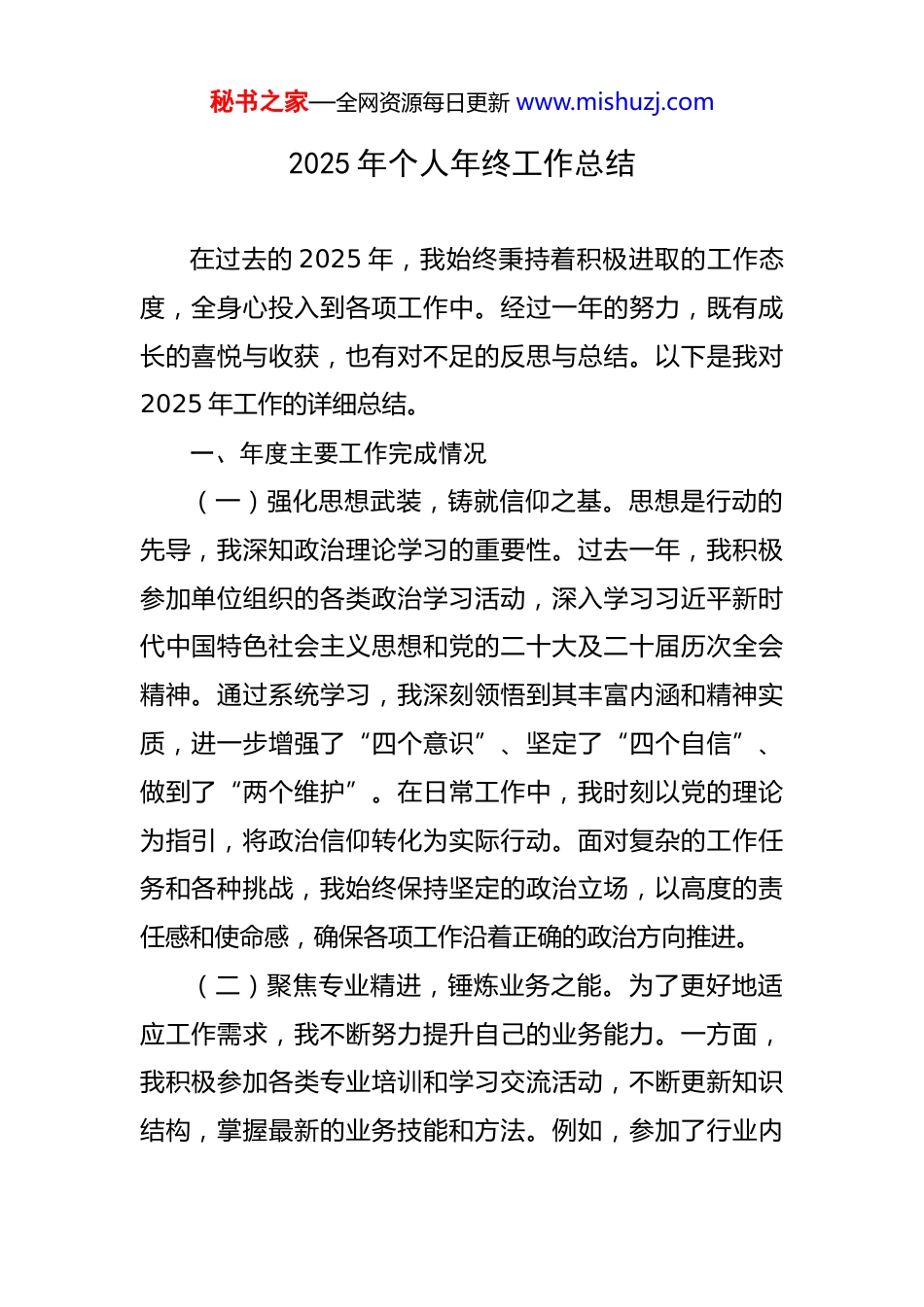 秘书之家—全网资源每日更新 www.mishuzj.com2025 年个人年终工作总结 在过去的 2025 年,我始终秉持着积极进取的工作态度,全身心投入到各项工作中。经过一年的努力,既有成长的喜悦与收获,也有对不足的反思与总结。以下是我对2025 年工作的详细总结。一、年度主要工作完成情况(一)强化思想武装,铸就信仰之基。思想是行动的先导,我深知政治理论学习的重要性。过去一年,我积极参加单位组织的各类政治学习活动,深入学习习近平新时代中国特色社会主义思想和党的二十大及二十届历次全会精神。通过系统学习,我深刻领悟到其丰富内涵和精神实质,进一步增强了“四个意识”、坚定了“四个自信”、做到了“两个维护”。在日常工作中,我时刻以党的理论为指引,将政治信仰转化为实际行动。面对复杂的工作任务和各种挑战,我始终保持坚定的政治立场,以高度的责任感和使命感,确保各项工作沿着正确的政治方向推进。(二)聚焦专业精进,锤炼业务之能。为了更好地适应工作需求,我不断努力提升自己的业务能力。一方面,我积极参加各类专业培训和学习交流活动,不断更新知识结构,掌握最新的业务技能和方法。例如,参加了行业内秘书之家—全网资源每日更新 www.mishuzj.com的前沿技术研讨会,学习到了先进的管理理念和创新模式,并将其运用到实际工作中,取得了良好的效果。另一方面,我注重在实践中积累经验,通过不断地解决工作中遇到的问题,提升自己的实际操作能力和应变能力。在处理复杂项目时,我能够冷静分析问题,制定合理的解决方案,并有效地组织实施,确保项目顺利推进。(三)主动担当作为,扛起发展之责。在工作中,我始终保持积极主动的态度,勇于担当责任。面对各项工作任务,我从不推诿扯皮,而是主动承担起自己的职责,积极协调各方资源,确保工作的顺利开展。在推动重点项目建设过程中,我充分发挥主观能动性,积极与相关部门沟通协调,解决了项目推进过程中遇到的诸多难题。同时,我还注重团队协作,充分发挥团队成员的优势,形成工作合力,共同推动项目取得了重要进展。(四)严守纪律规矩,夯实廉洁之本。廉洁自律是一名合格工作人员的基本要求。我始终严格遵守各项纪律规矩,自觉遵守廉洁自律的各项规定。在工作中,我坚持公正、公平、公开的原则,坚决杜绝以权谋私、违规操作等行为。同时,我注重加强自身的道德修养,树立正确的价值观和权力观。时刻保持清醒的头脑,自觉抵制各种诱惑,做到清正廉洁、廉洁奉公。通过不断加强自身的廉洁秘书之家—全网资源每日更新 www.mishuzj.com建设,为自己的工作和生活奠定了坚实的基础。二、工作中存在的不足与反思(一)学习深度与广度不足。虽然我在过去一年中积极参加各种学习活动,但在学习的深度和广度上仍存在不足。在政治理论学习方面,对一些重要思想和理论的理解还不够深入,缺乏系统性和全面性的研究。在业务学习方面,对一些新兴领域和前沿技术的了解还不够及时和深入,存在知识更新不及时的问题。(二)创新意识与能力有待提高。在工作中,我习惯于按照传统的方式和方法开展工作,创新意识和创新能力有待提高。面对一些新问题和新挑战,缺乏创新思维和解决问题的新方法。在推动工作创新方面,还存在一定的局限性,未能充分发挥自己的主观能动性和创造力。(三)工作统筹与协调能力不足。随着工作任务的不断增加,我在工作统筹和协调方面暴露出一些问题。在安排工作时,有时不能合理地分配时间和精力,导致工作效率不高。在协调各方资源时,有时不能有效地沟通和协调,导致工作推进过程中出现一些不必要的矛盾和问题。三、2026 年工作思路与改进措施(一)“学”字为先,提升综合素养。一是加强政治理论学习,制定详细的学习计划,深入学习习近平新时代秘书之家—全网资源每日更新 www.mishuzj.com中国特色社会主义思想和党的最新理论成果。通过学习,不断提高自己的政治站位和政治觉悟,增强政治敏锐性和政治鉴别力。二是拓宽业务学习渠道,关注行业发展动态和前沿技术,积极参加各类培训和学习交流活动。同时,加强对新兴领域和交叉学科的学习,不断拓宽自己的知识面和视野,提高自己的综合业务能...